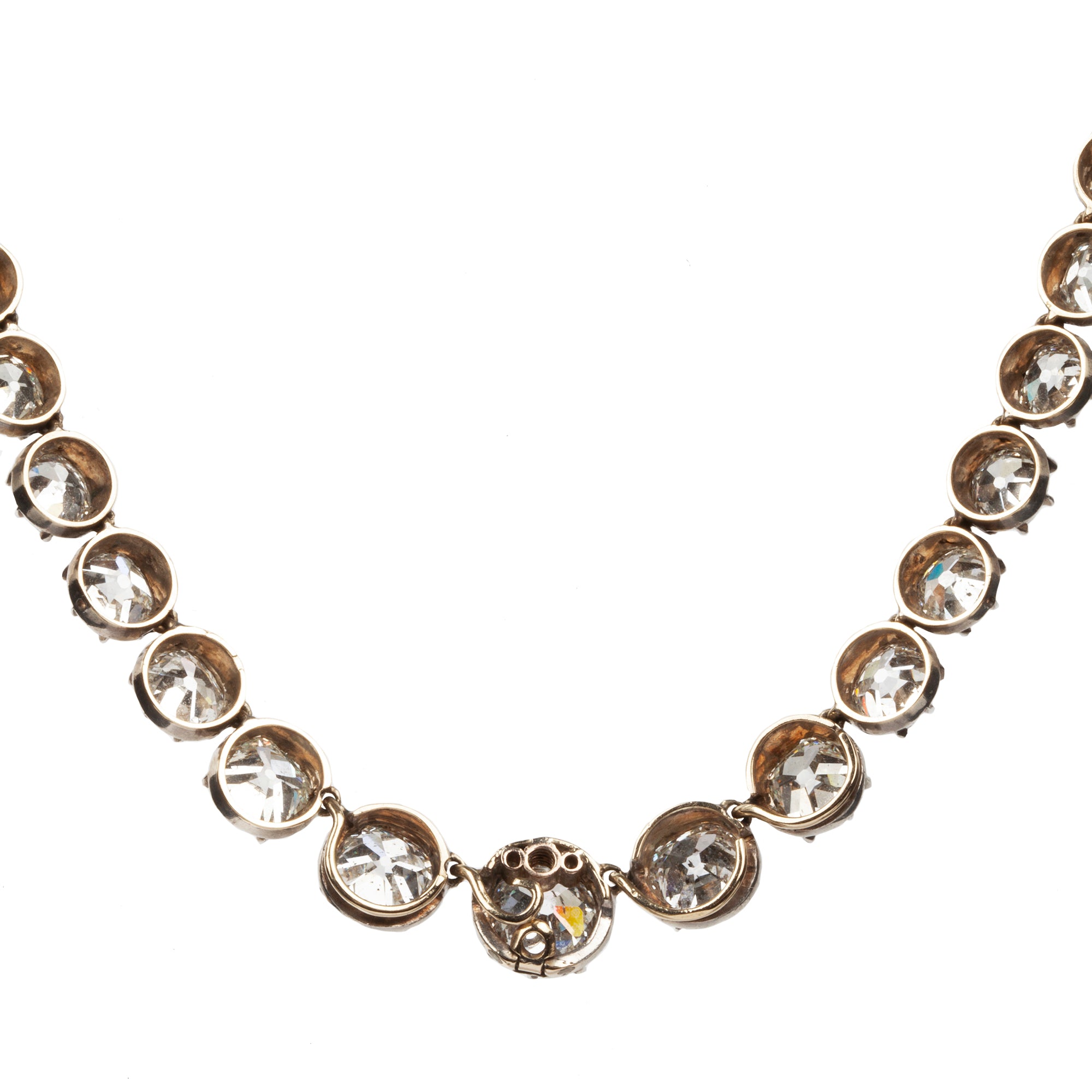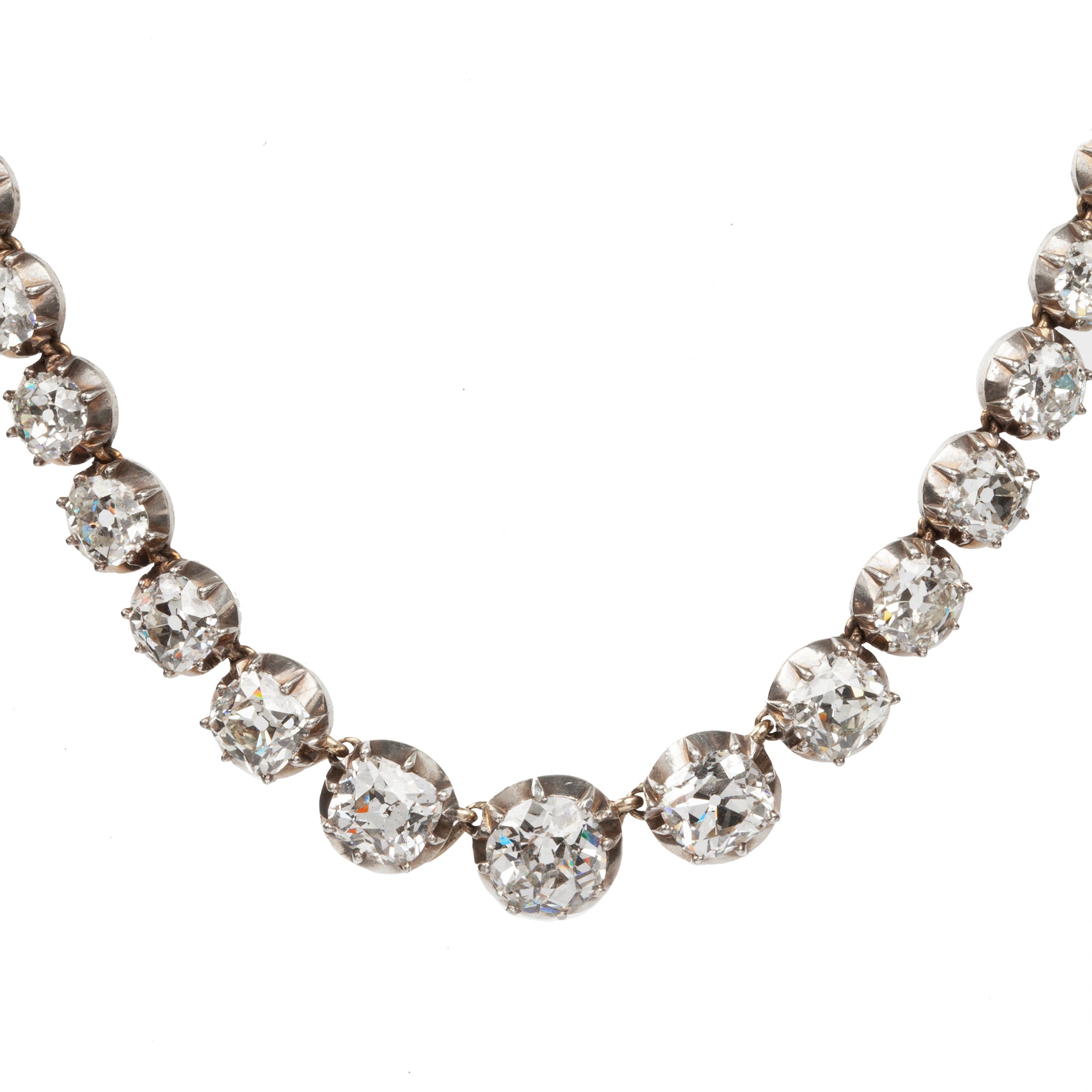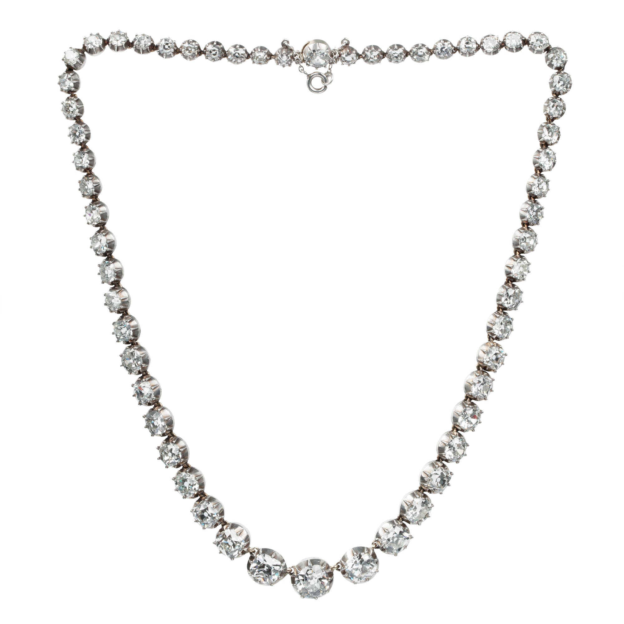 A beautiful classic form, this style of necklace is named for the glittering lights lining the French Côte d'Azur. 58 old mine cut diamonds in graduated size are set in low profile, pinched collet settings. Lays flat on the neck for day or night wear. The total diamond weight is approximately 30 carats.