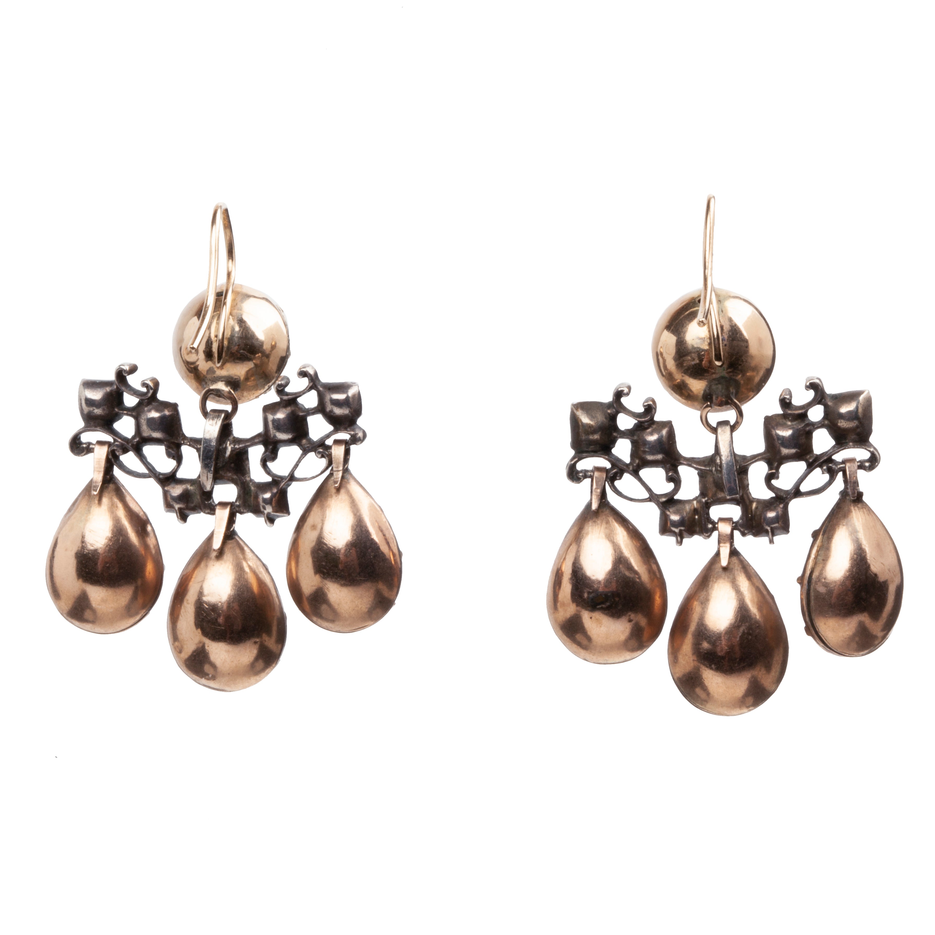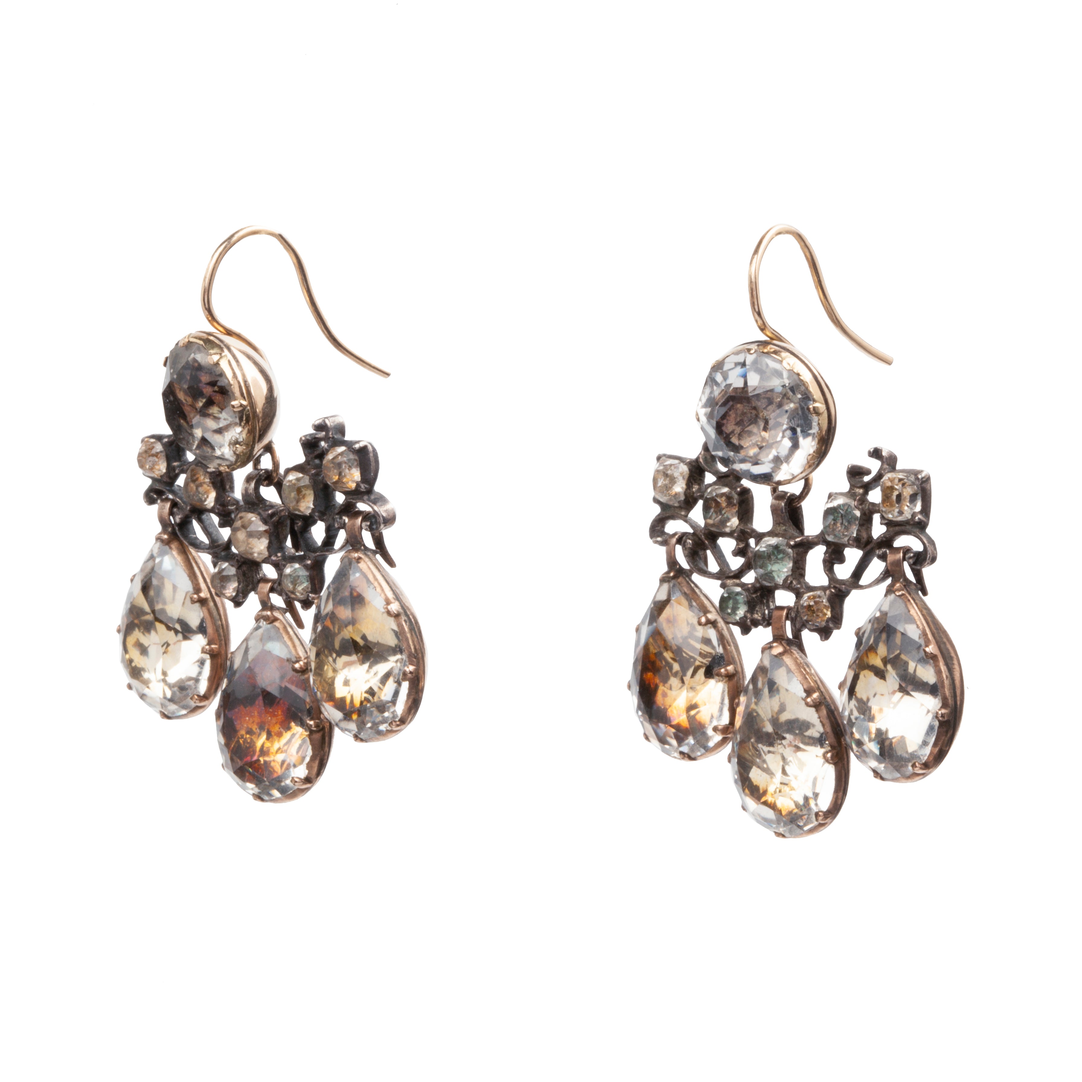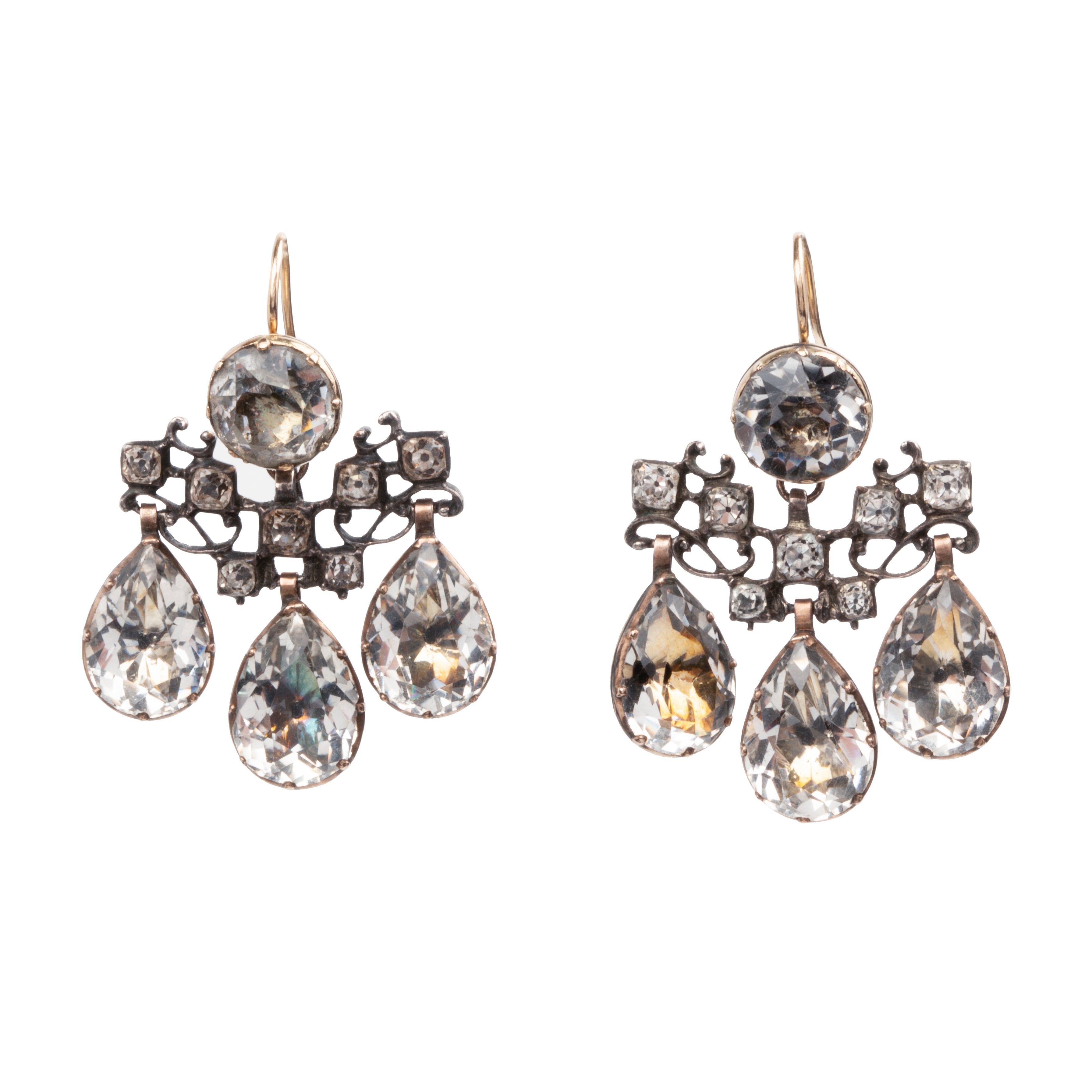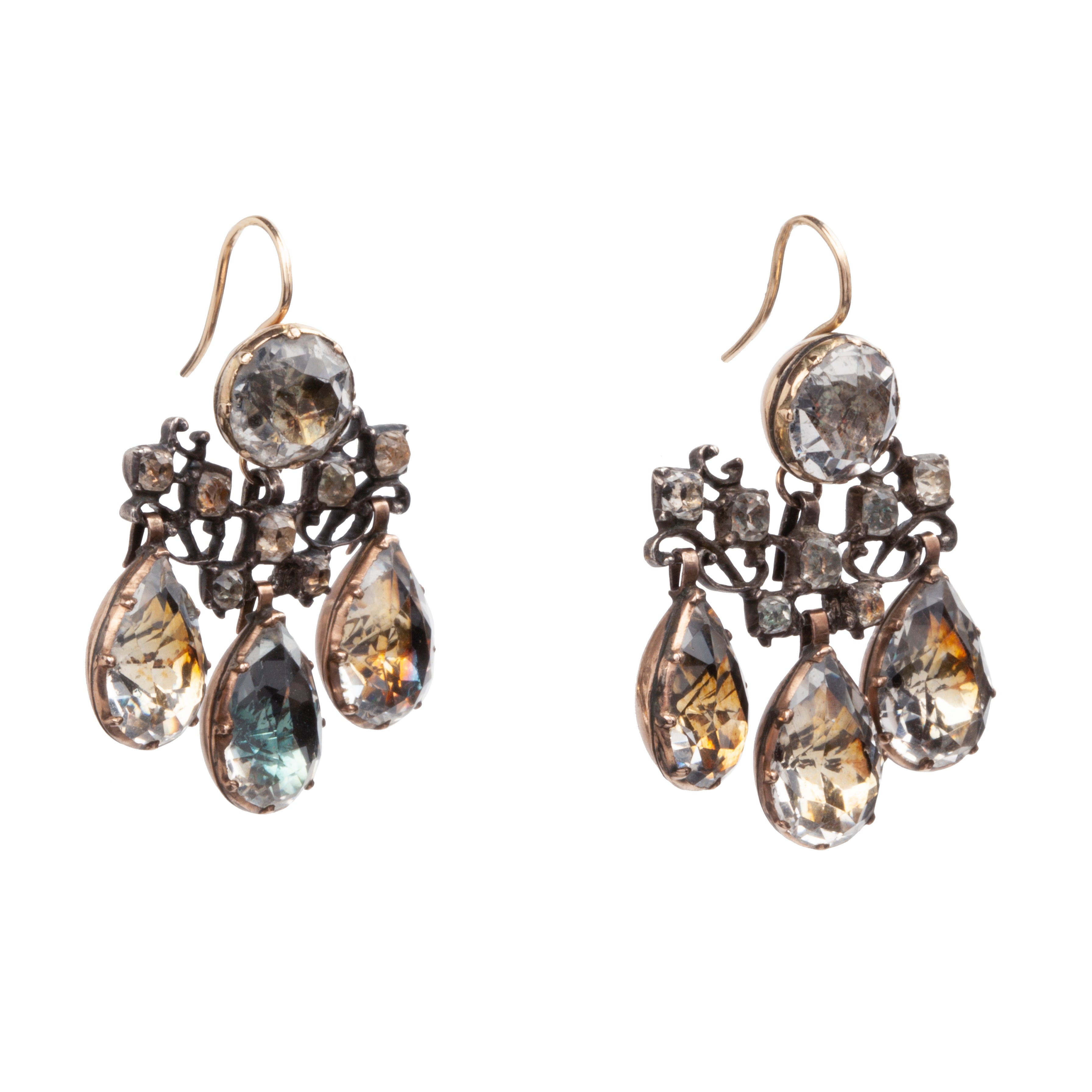 Georgian era 18th century girandole white paste earrings, in silver topped gold settings. Beautiful bright white paste are in classical girandole drop form. Wonderful arrangement and scale and a very wearable size. English in origin. Circa 1770.