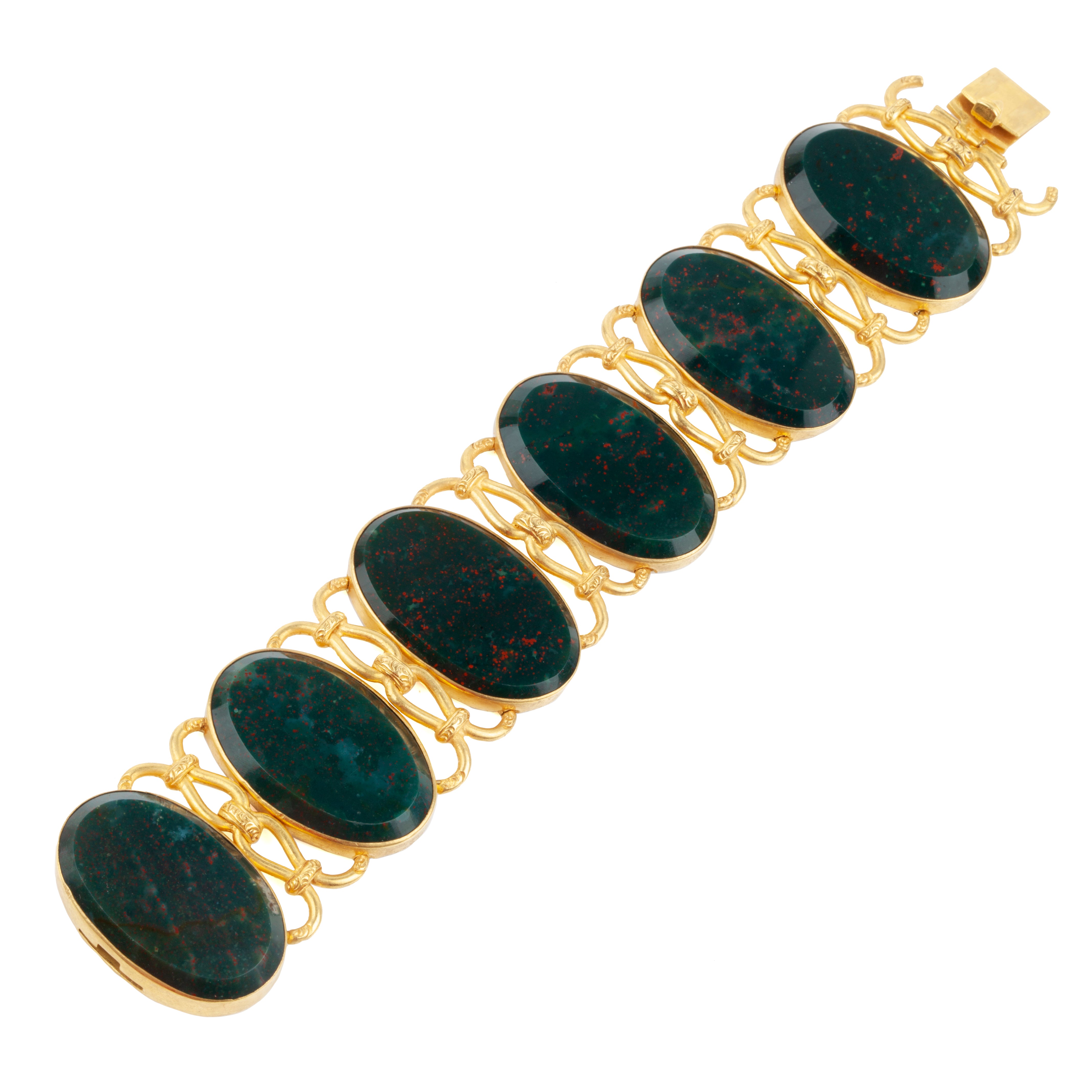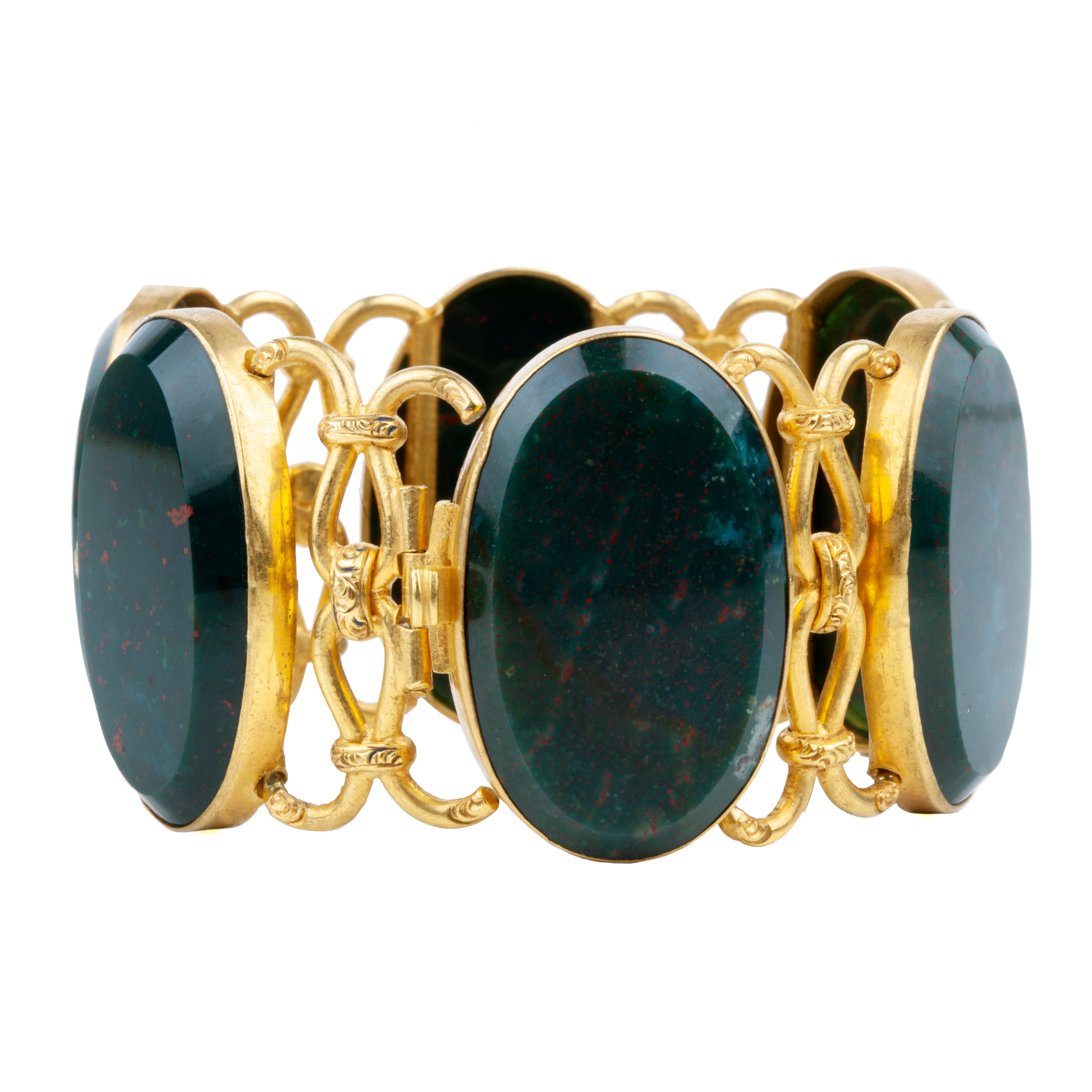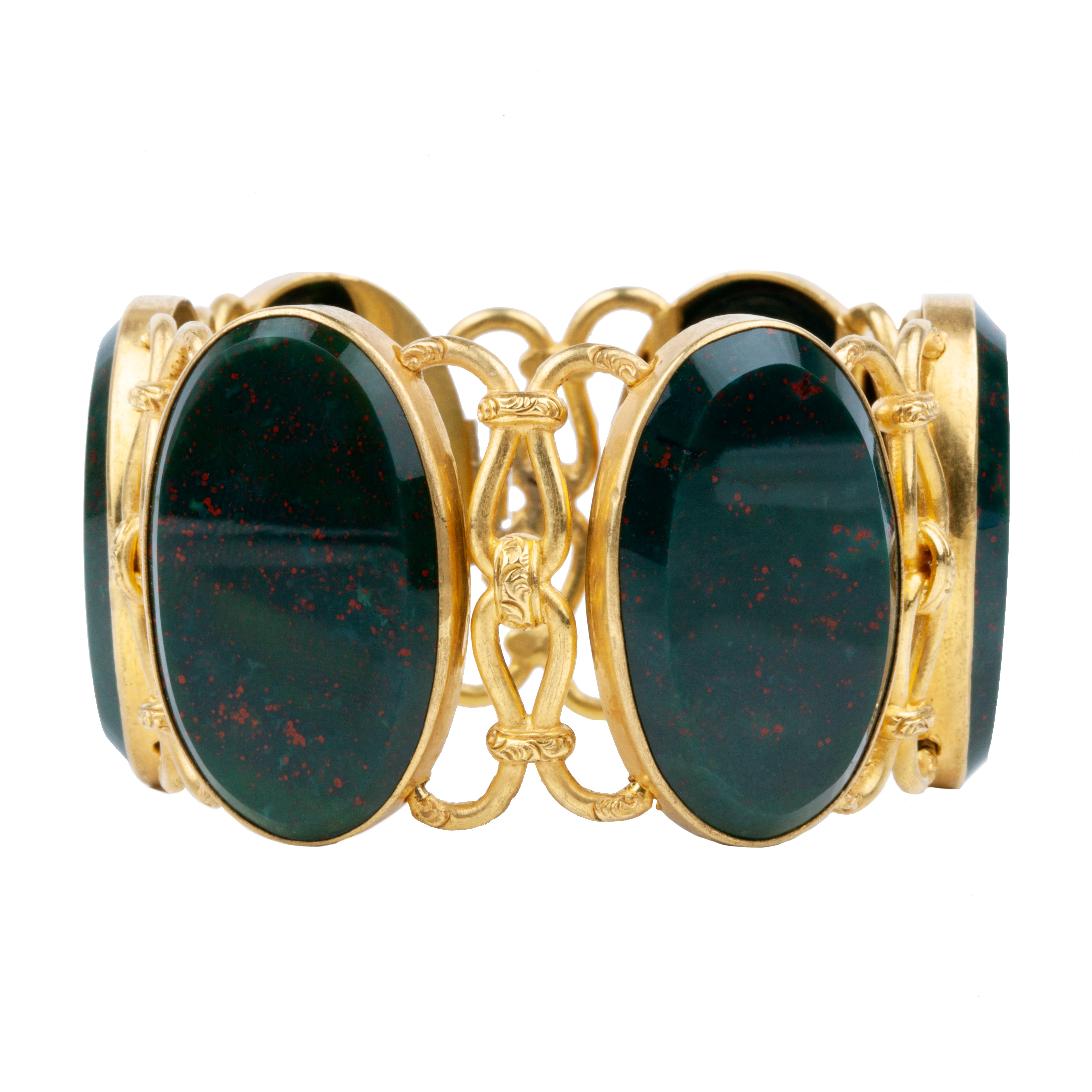 Victorian era oval bloodstone panel bracelet in gilded gold. English in origin. Circa 1860.