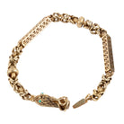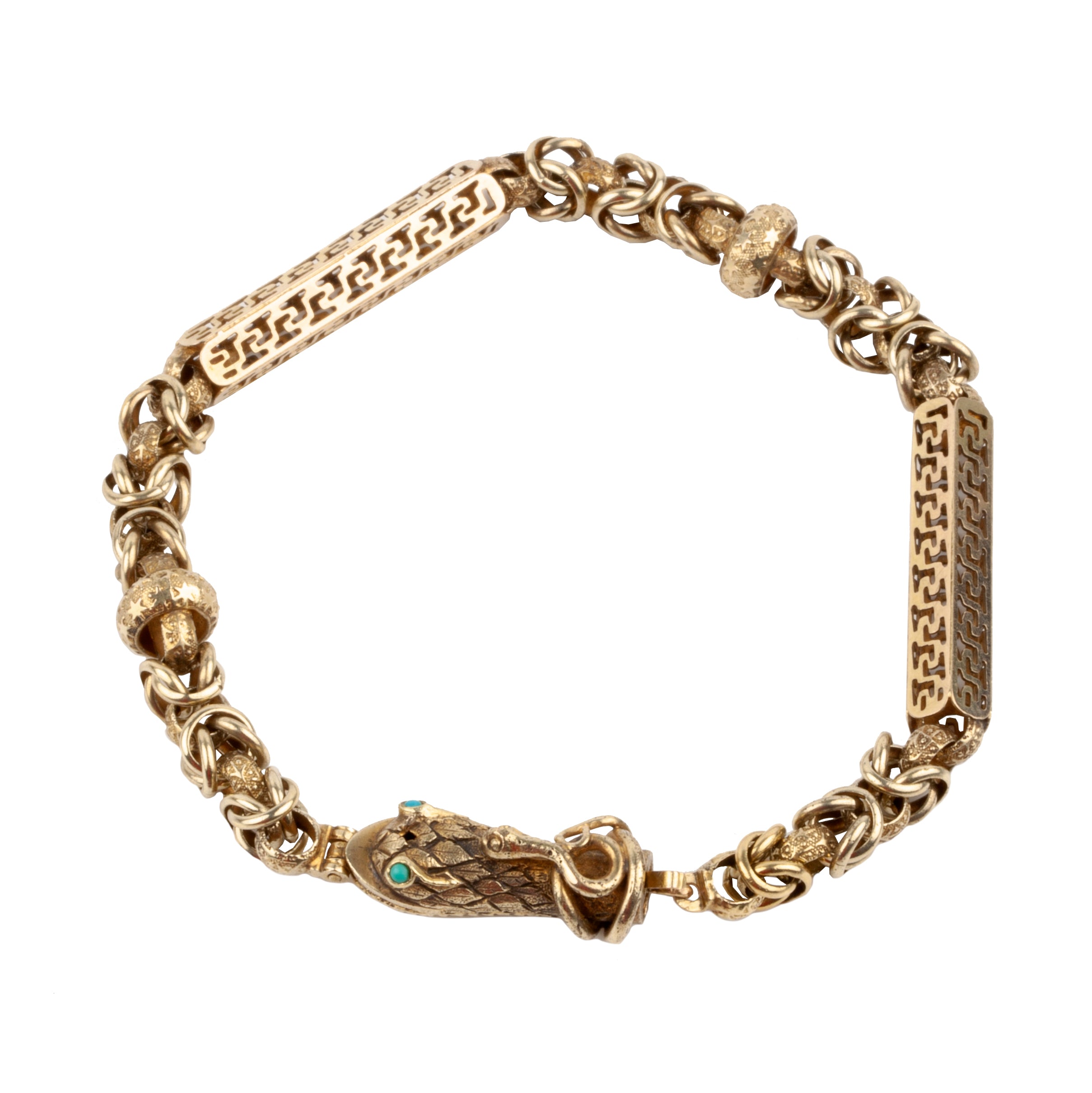 19th Century gold watch-chain bracelet, in 9k gold. Incredibly detailed watch chain links finished with an elaborate snake head clasp. The primary snake has turquoise eyes and is wrapped with a second snake around his neck. English in origin. Circa 1880.