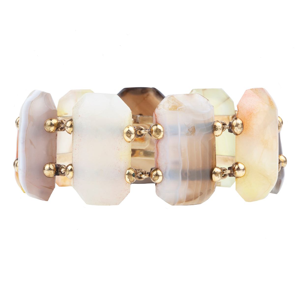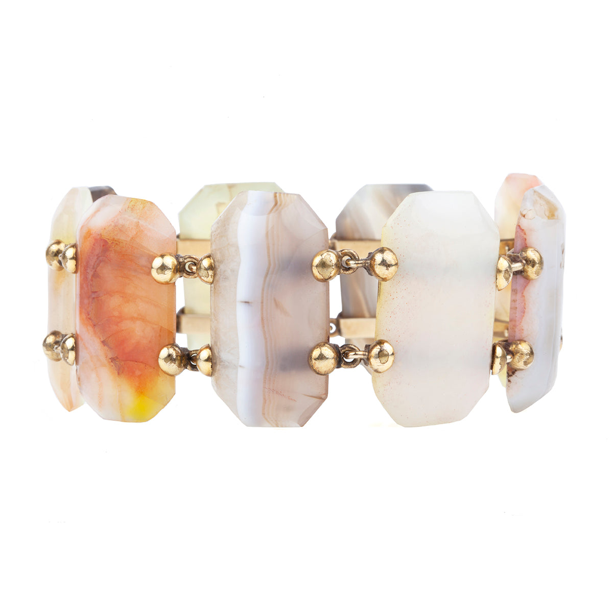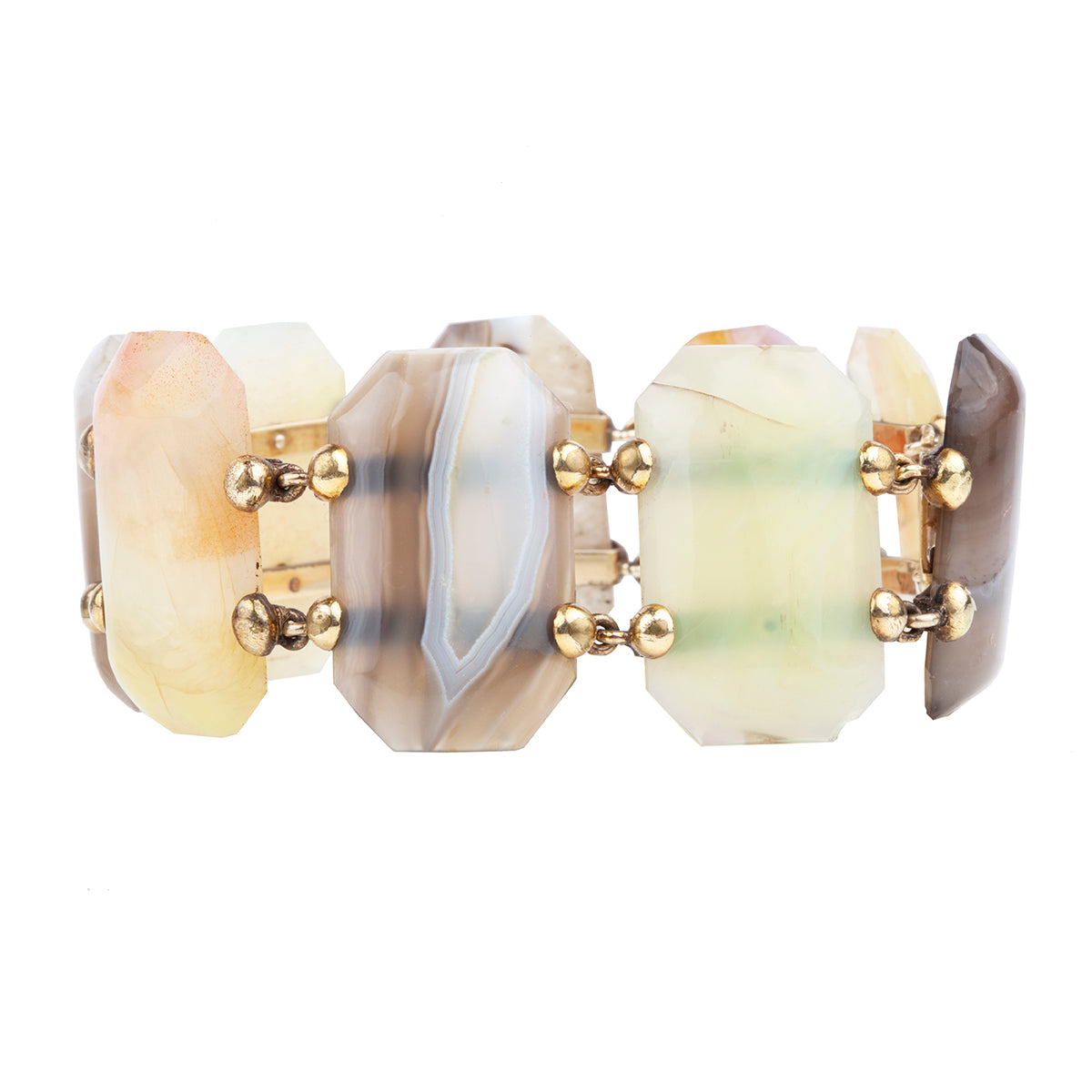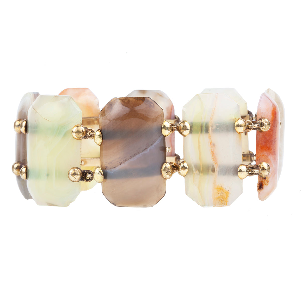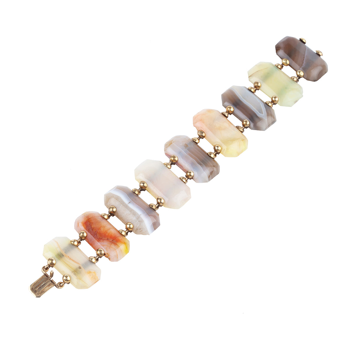 Victorian era panel gemstone bracelet. Beautifully transparent onyx and agate panels, set in 9k gold settings. English in origin. Circa 1880.