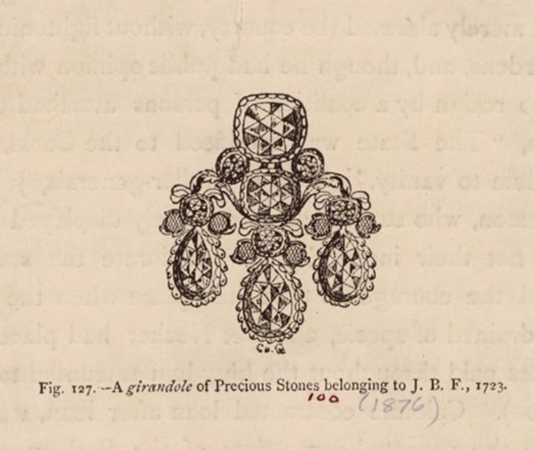 This style emerged mid-17th century and remained popular throughout the 18th century, particularly from the 1720s to the 1780s. The Girandole design was most favored during the Baroque and Rococo periods, especially among European aristocratic women. The design features three dangling pear-shaped ornaments suspended from a central bow motif. These designs were produced throughout Europe, using all manner of gemstones. When the fashion waned, the earrings were often disassembled, and the parts repurposed as pendants and simplified earrings.