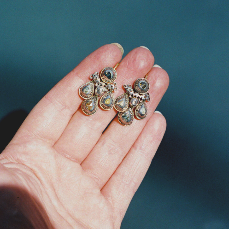 18th century rose cut diamond girandole earrings. Dutch in origin, in silver on gold.Typical to the period, back-to-front fittings.England. Circa 1760.
