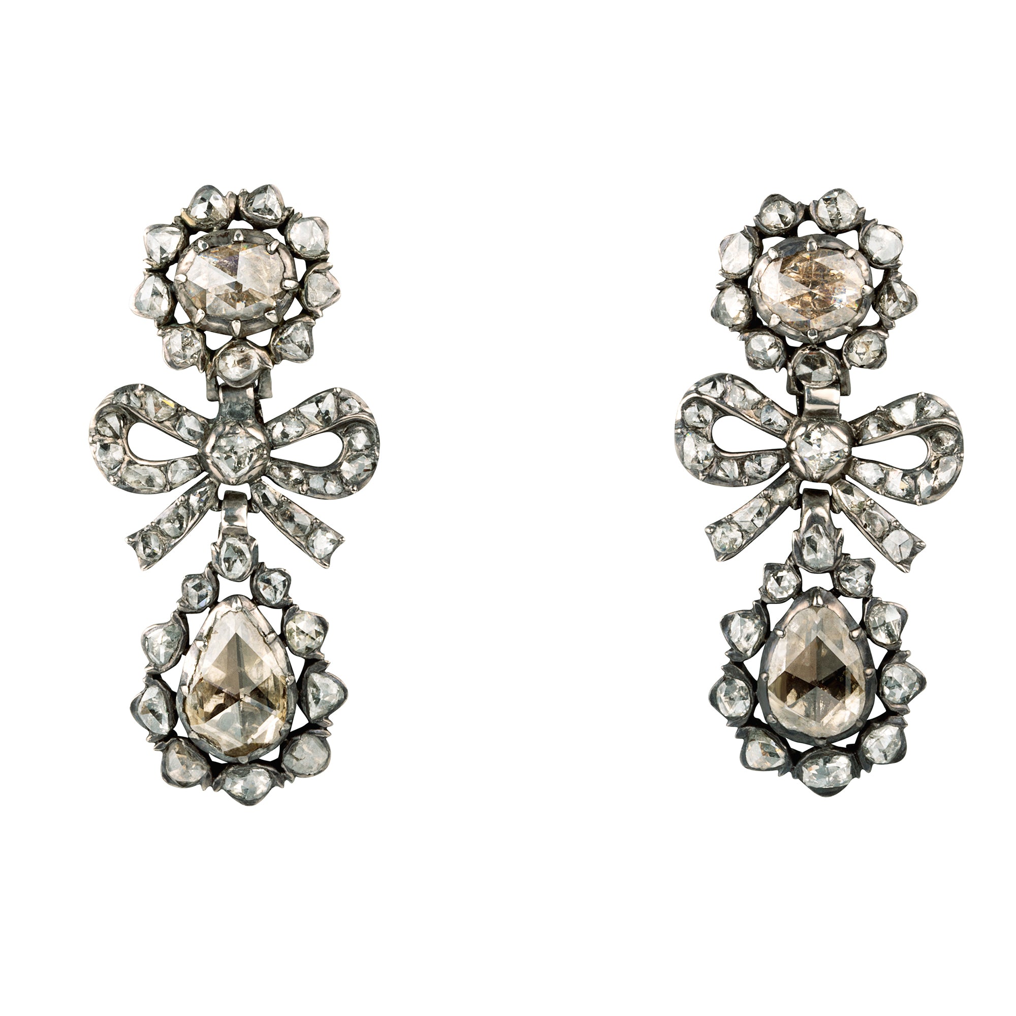 A fine pair of antique earrings with rose cut diamonds set in silver. Well preserved with bright lively diamonds set in closed back settings. The original hook fittings have been replaced with more wearable post backs.