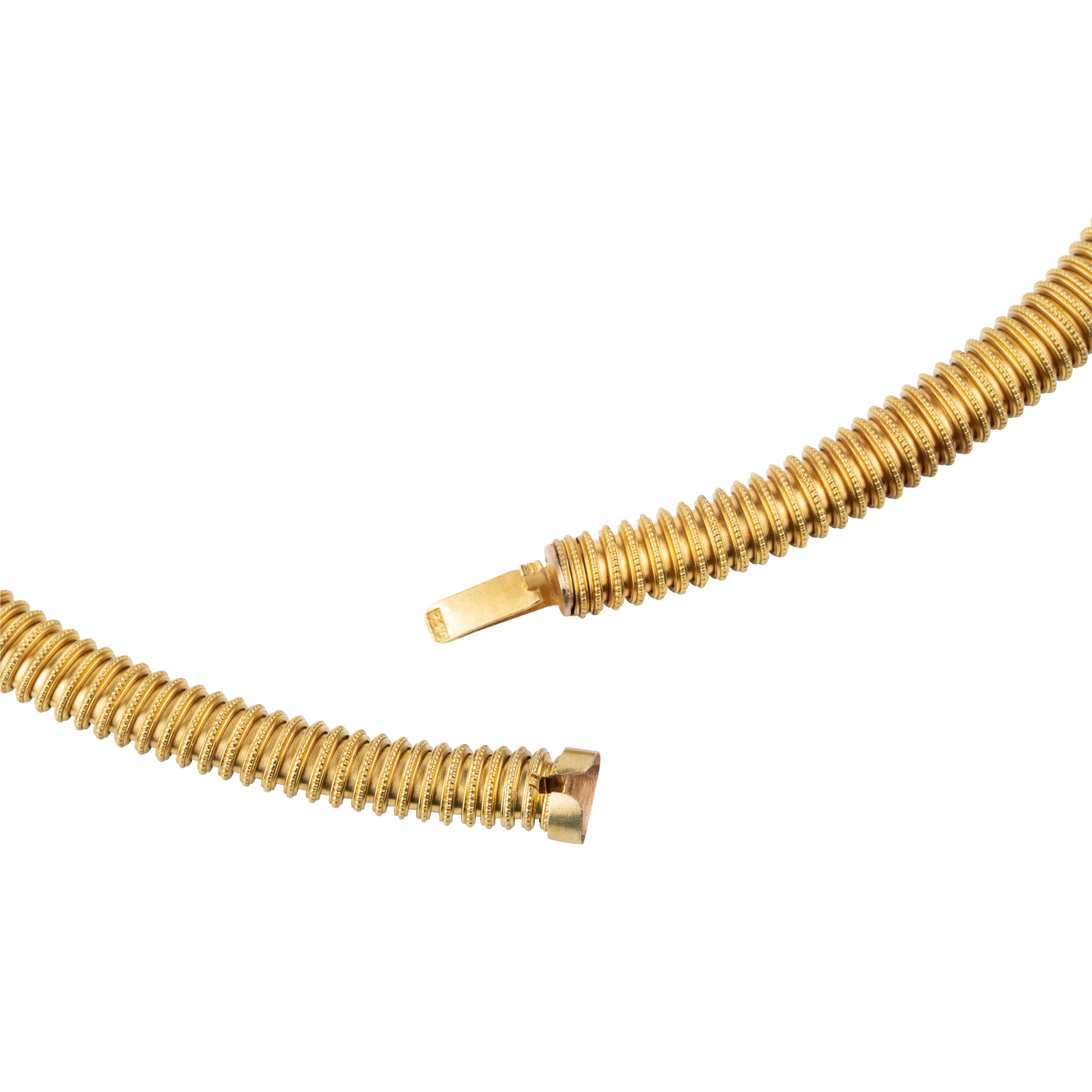 Light in weight but strong in form in bright 18k gold. This 19th-century gaspipe design was the precursor to modern tubogas chains, created with a technique invented by a French jeweler in 1850’s. Strikingly similar necklaces are depicted in Henri Vever's French Jewelry of the Nineteenth Century, first published in France in 1906.