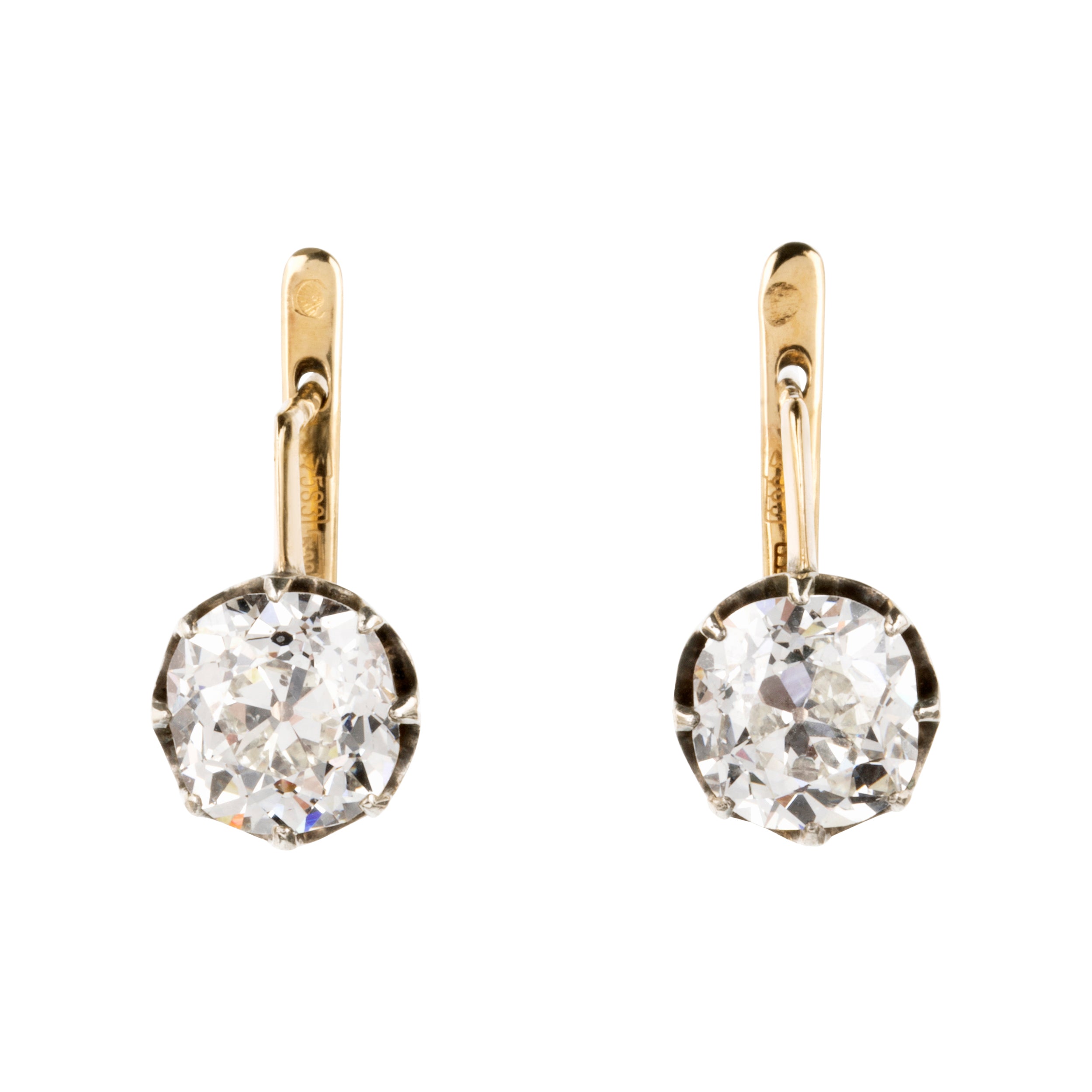 The perfect everyday earring with classically proportioned antique old mine cut diamonds, estimated to weigh approximately 1.50 carats each. Set in 14k gold and silver. Imperial Russian marks as well as French import marks. Found in Paris.