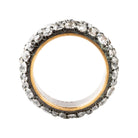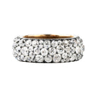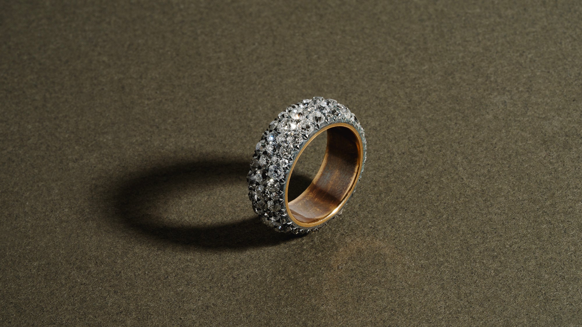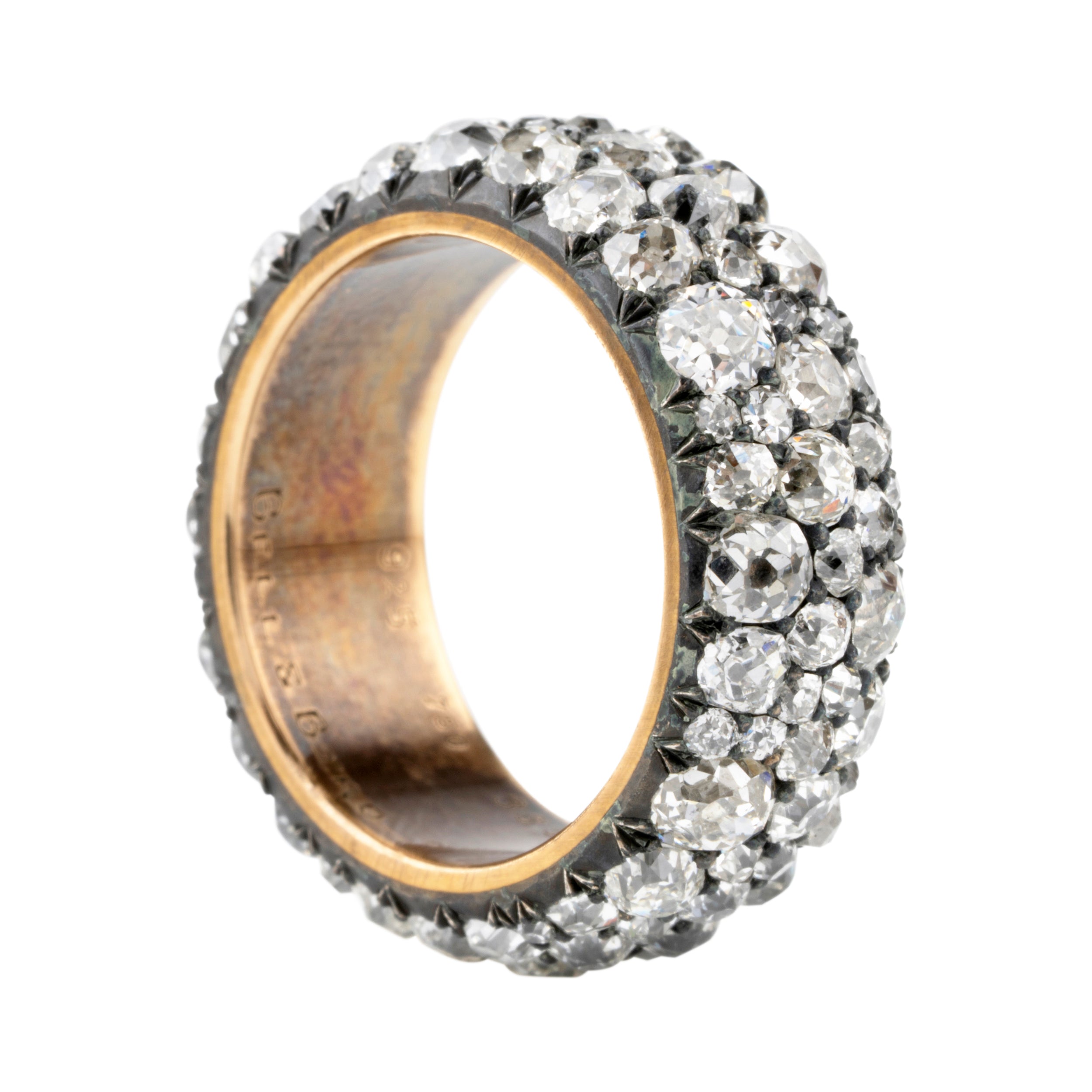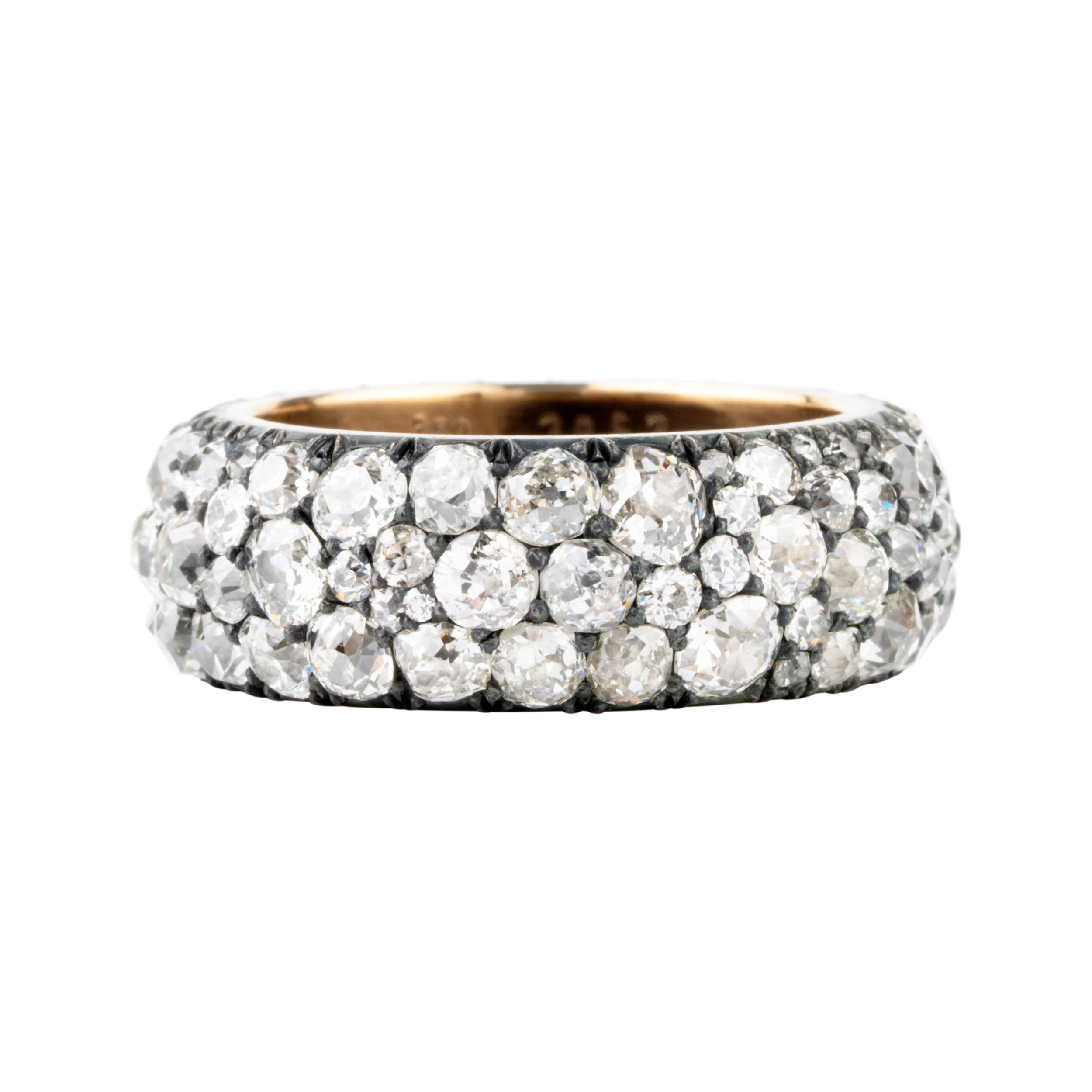 Inspired by Georgian-era jewels, this high-dome eternity band marries historic influence with modern proportions. Like all meaningful creations, it required time and patience, over one hundred hours of meticulous work. The design showcases antique old–mine–cut diamonds, each with its own distinct size and shape. Our jewelers set every stone using a centuries-old silver-on-gold technique, honoring the traditions that inspired it.