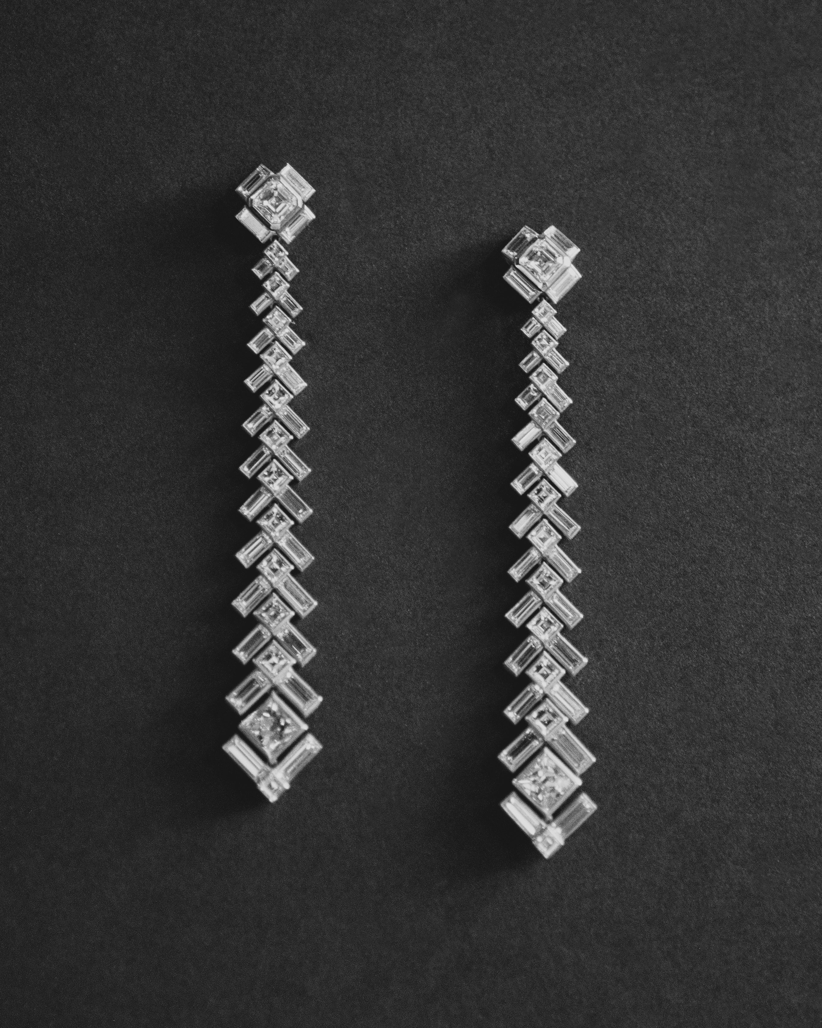 Whether they call to mind the sweep of a feather, the curve of a laurel branch, or a stalk of wheat, the composition invites interpretation—each facet a glimmer of subtle drama. Baguette, Asscher, and French-cut diamonds catch the light, while hand-fabricated 18K gold mountings give the earrings graceful movement and presence. The exaggerated length makes a bold yet timeless statement.