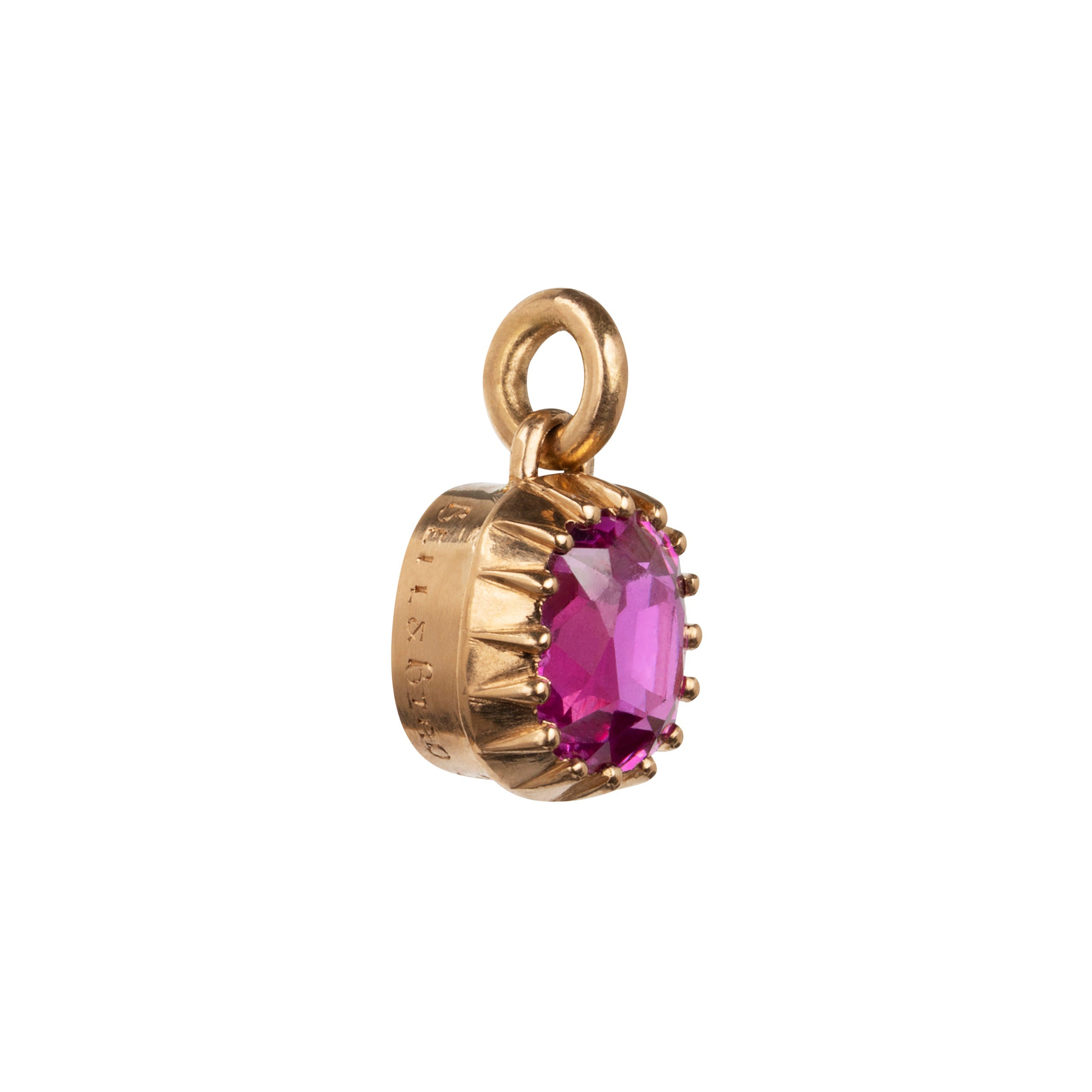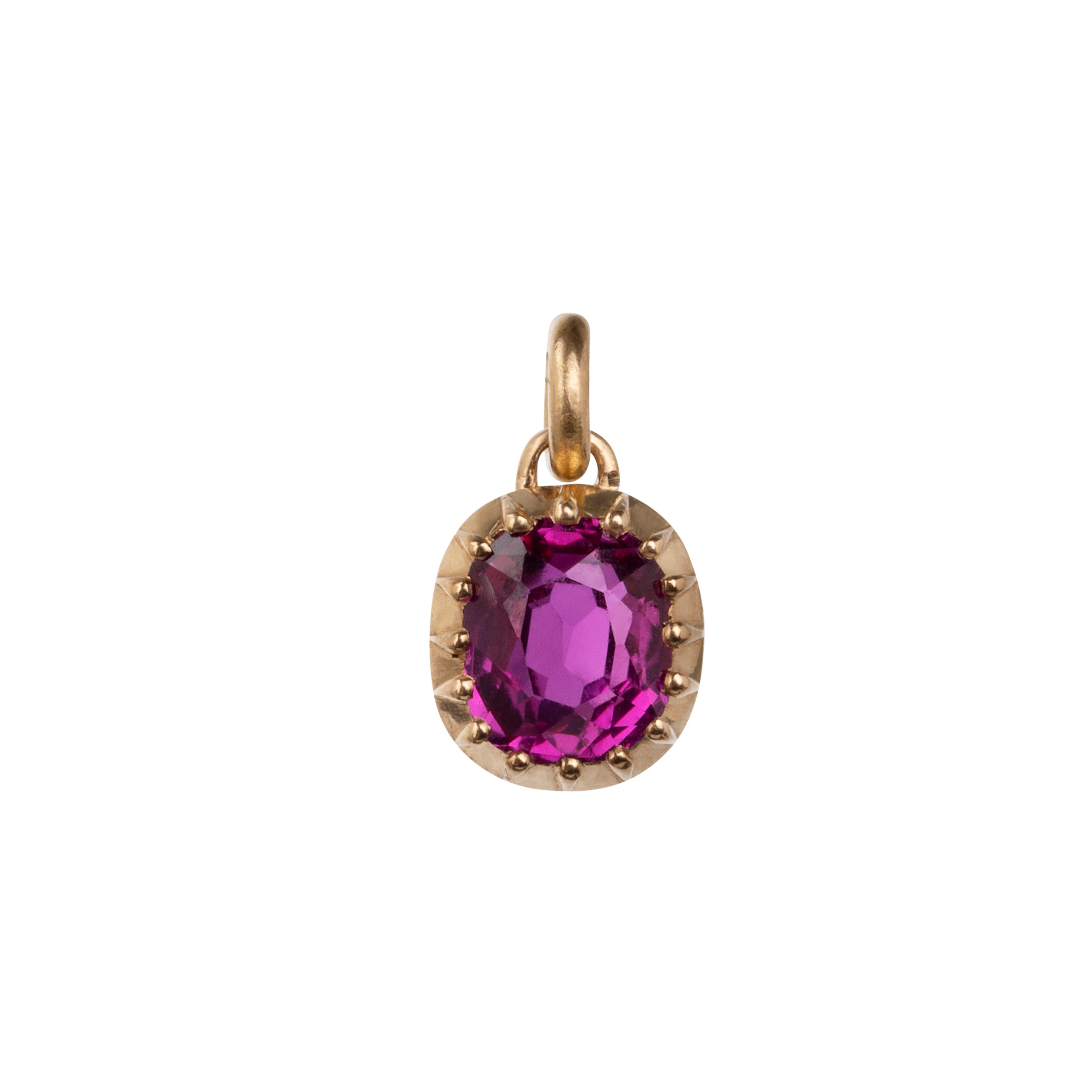 Our newest Bell and Bird setting style marries Georgian and Edwardian setting styles. Reclaimed from a Victorian-era jewel, this vivid magenta pink sapphire weighs 0.94 carats and is framed in our pie-crust setting in 18k old gold.