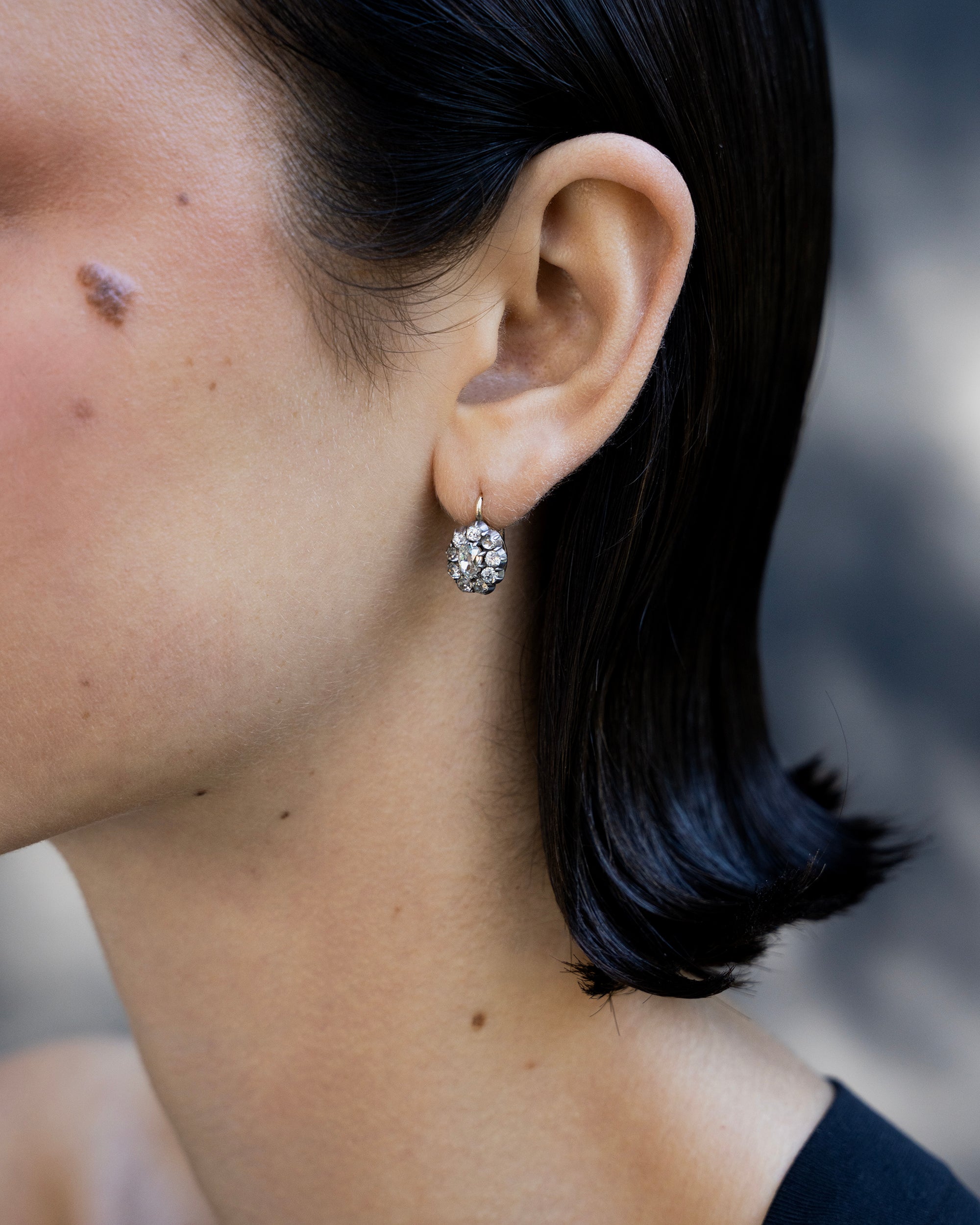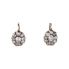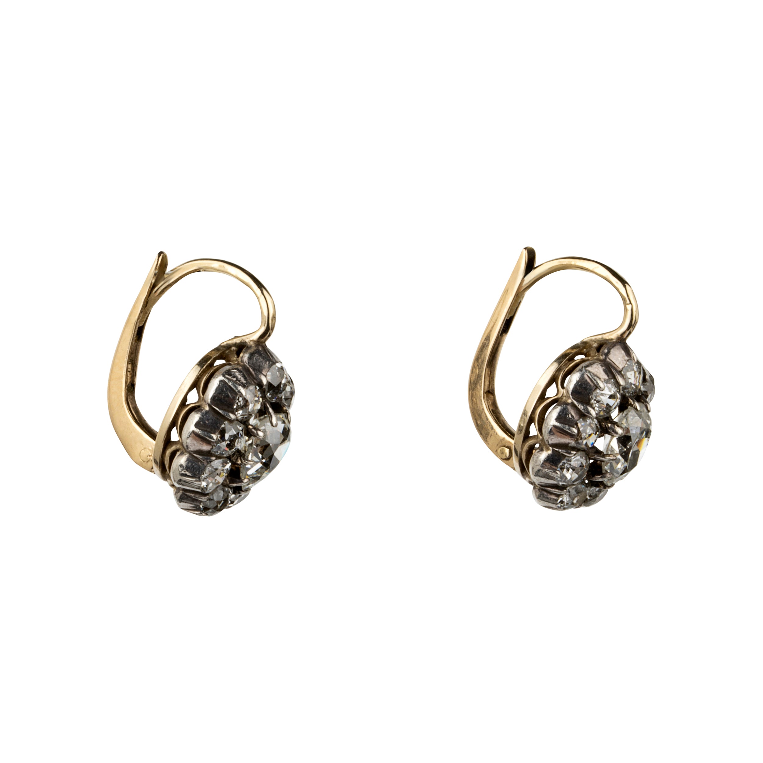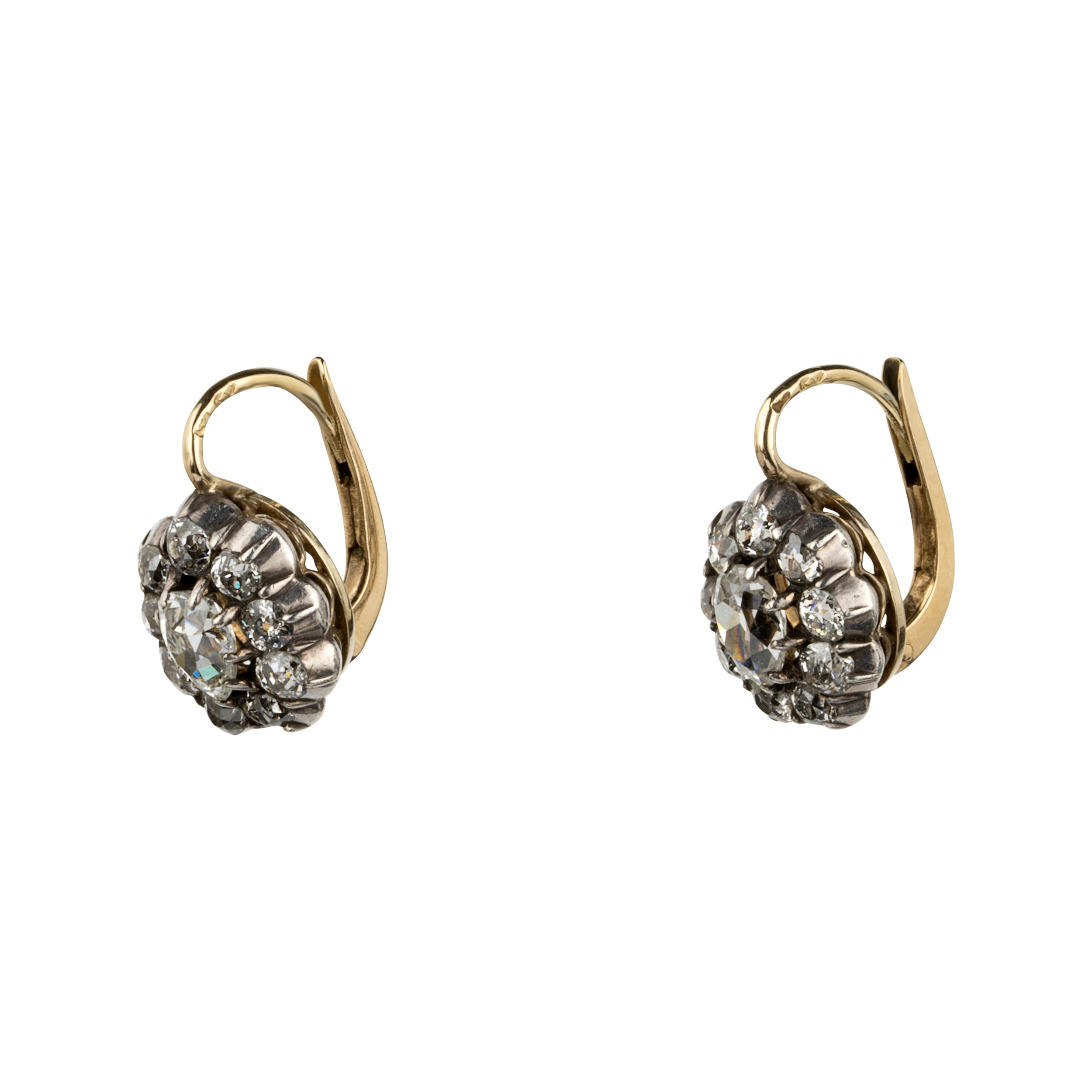 Varied shapes of old mine-cut diamonds surround two pear-shaped stones set in silver on 14k gold. Collectively the diamonds weigh approximately two carats.  Hallmarks indicate they were made in the Austro-Hungarian Empire before World War I. They are very wearable for everyday.