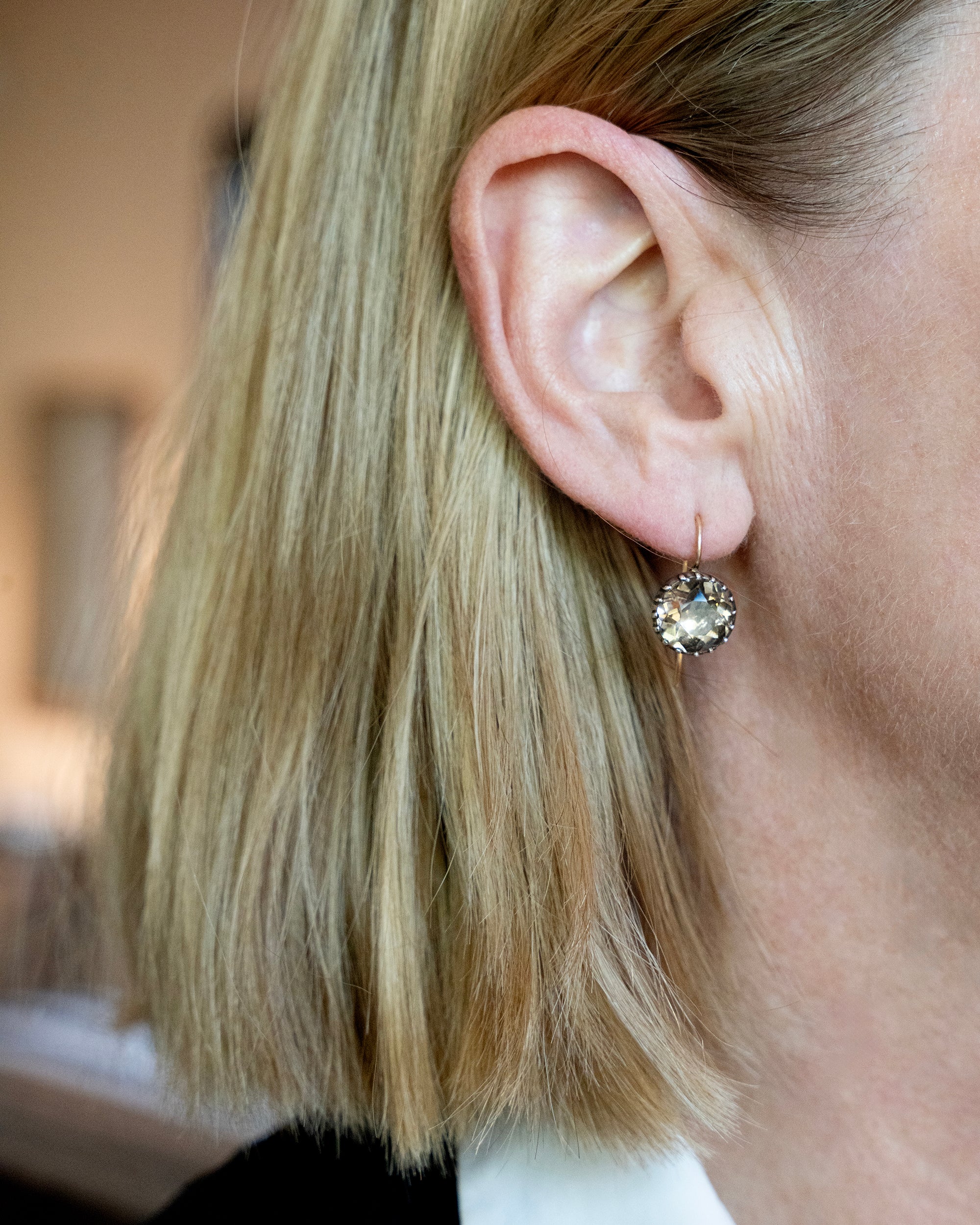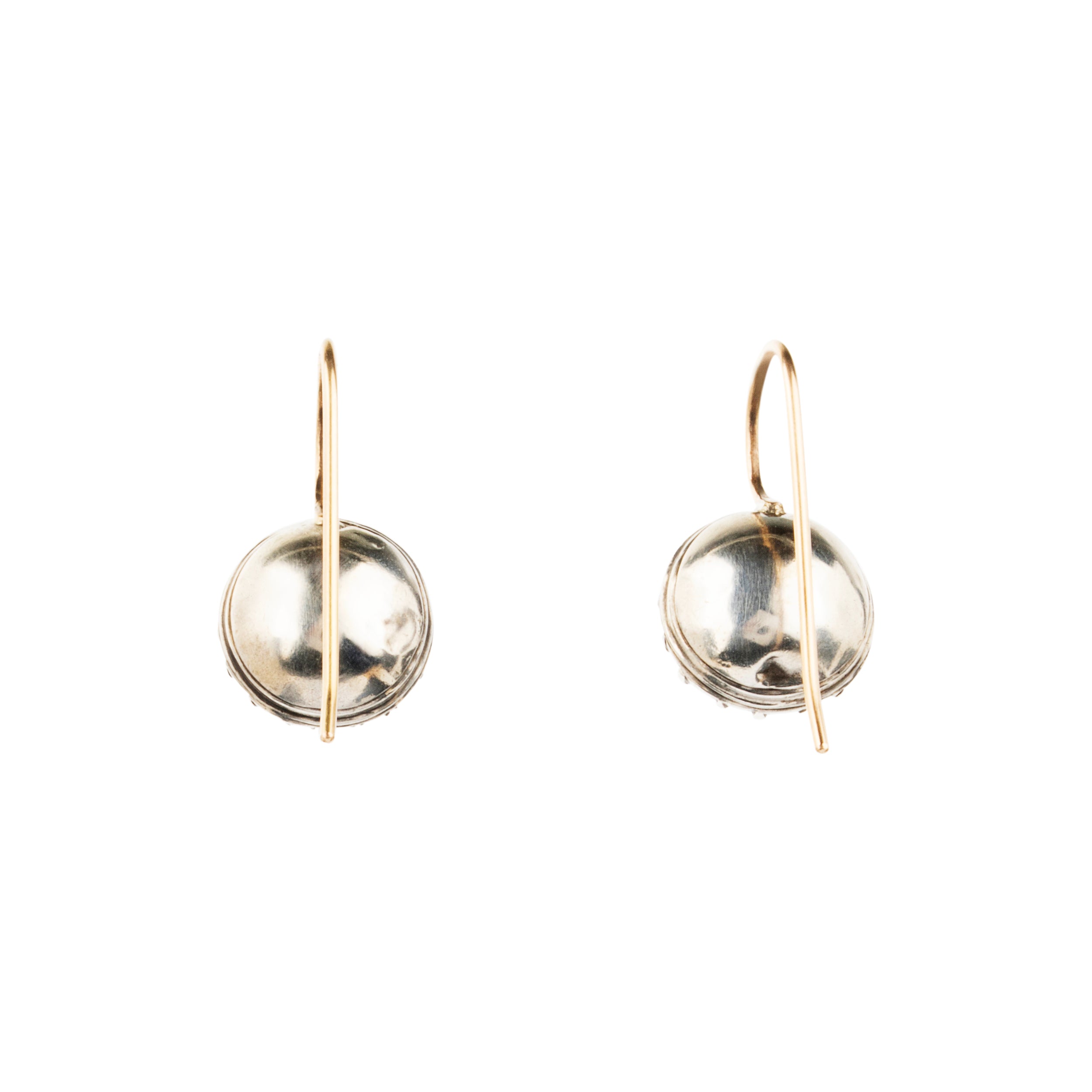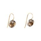 Round smokey quartz stones are set in foiled back silver settings on 18k gold wires. What were once beautiful Georgian era buttons or cufflinks are now perfect everyday earrings.