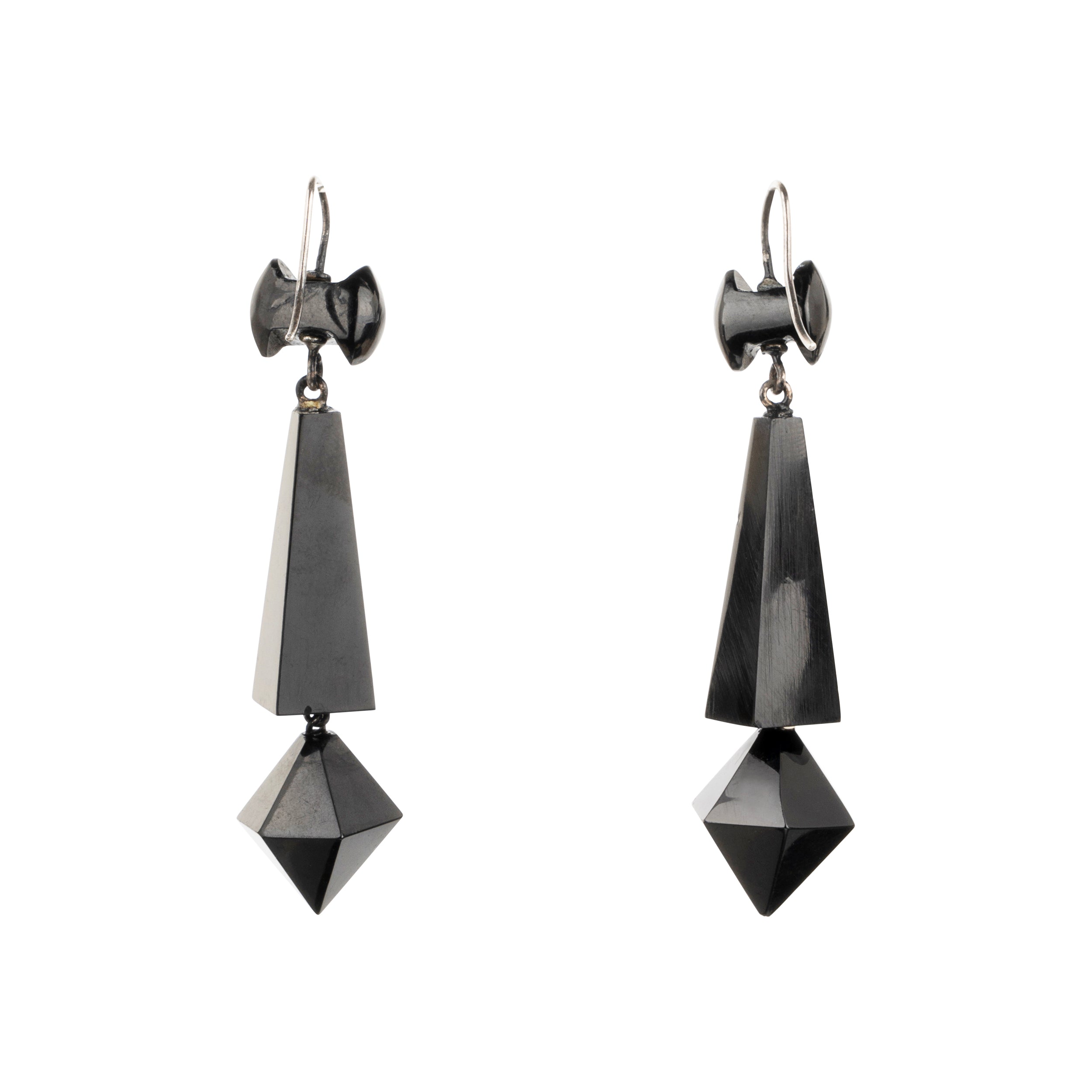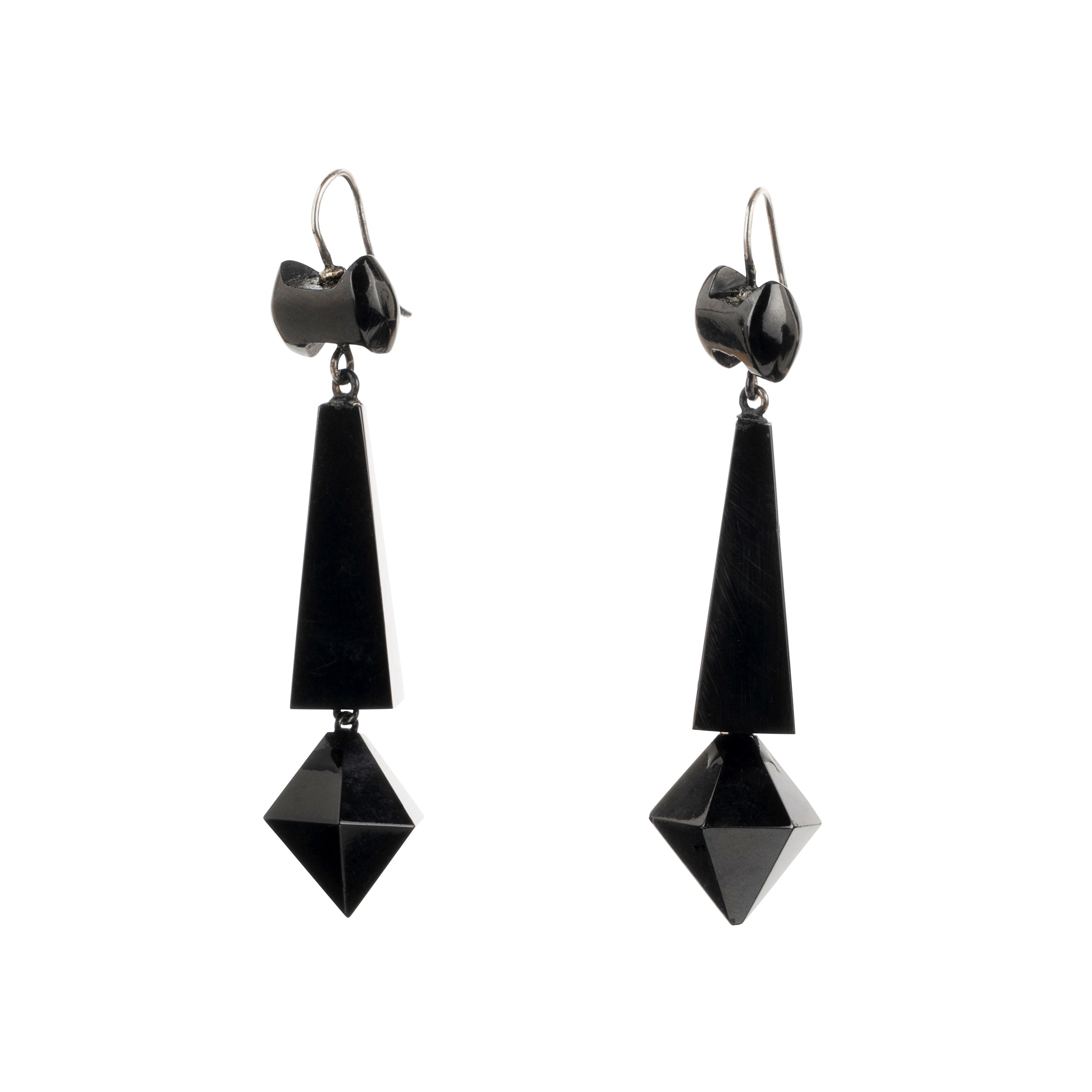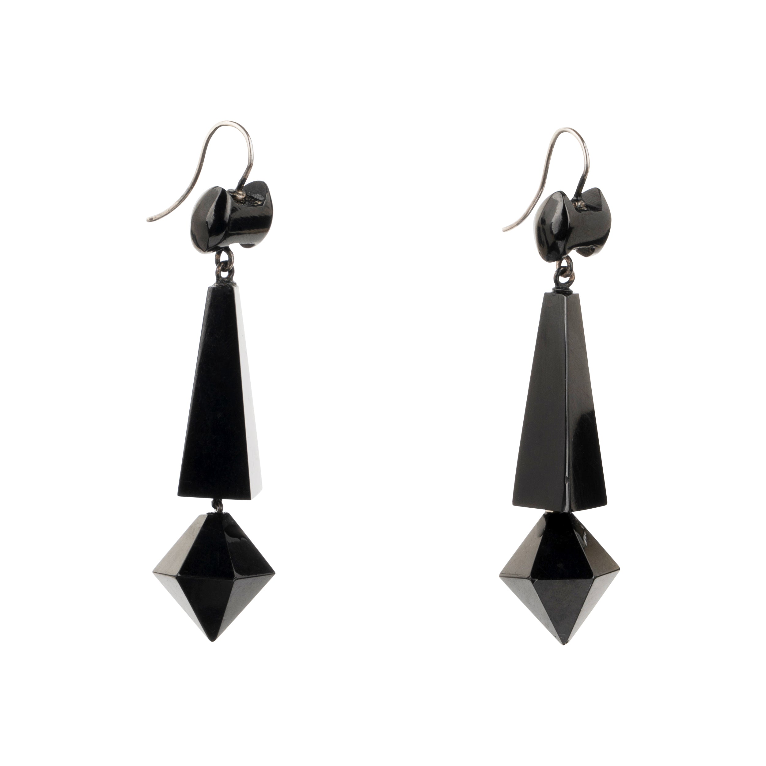 Carved Jet stones in geometric shapes. Jet is naturally light in weight, making the earrings very easy to wear.