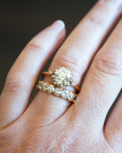 The ring is paired with our signature diamond cutaway eternity band.