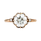 One of our signature Bell and Bird designs. This solitaire ring features a main round old European cut diamond surrounded by 8 single-cut diamonds subtly peeking out from underneath the main stone. There are two additional single-cut diamonds at the base of the whisper-thin, hand-filed knife edge band. Set in our 18k old gold. This ring features a GIA certified 2.08 carat L color and VS2 clarity old European cut diamond. Handcrafted in our 18k old gold.