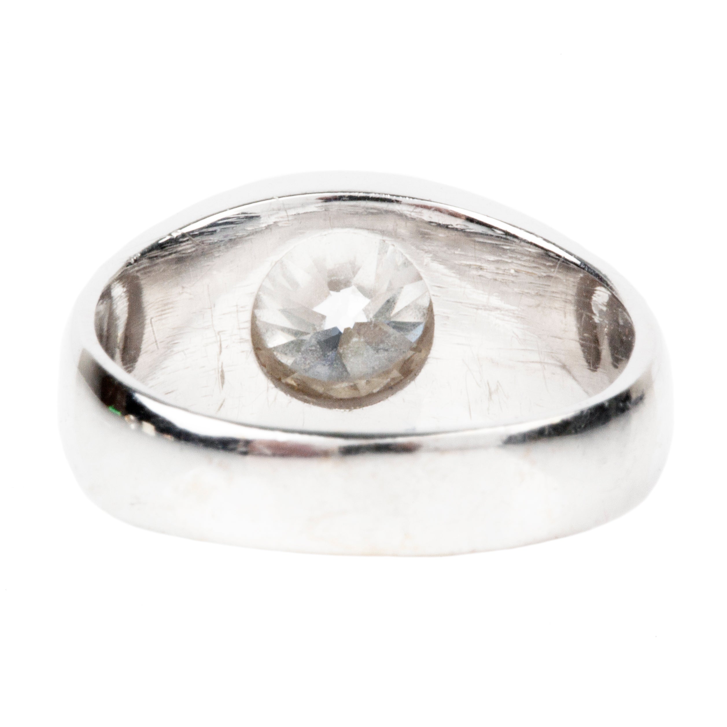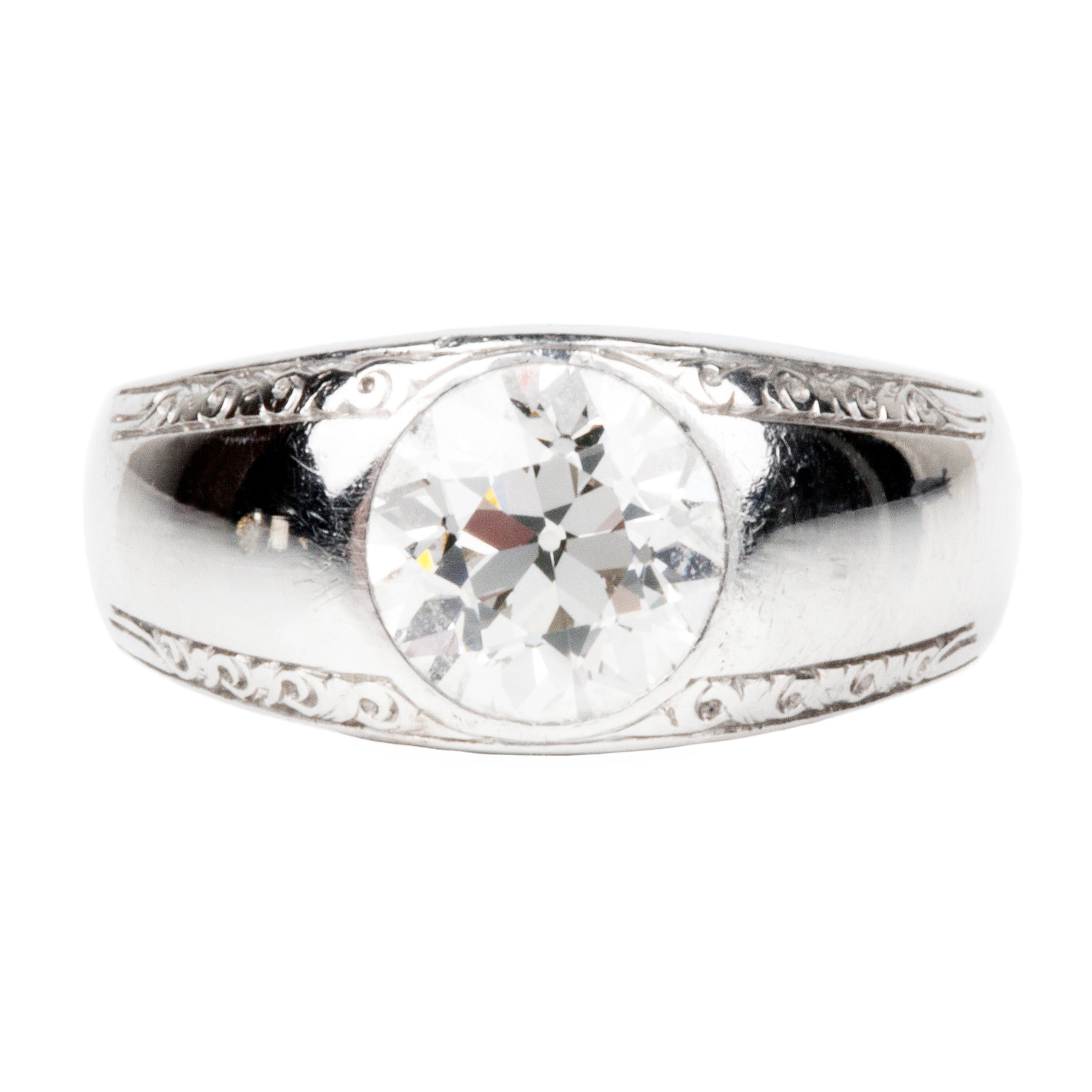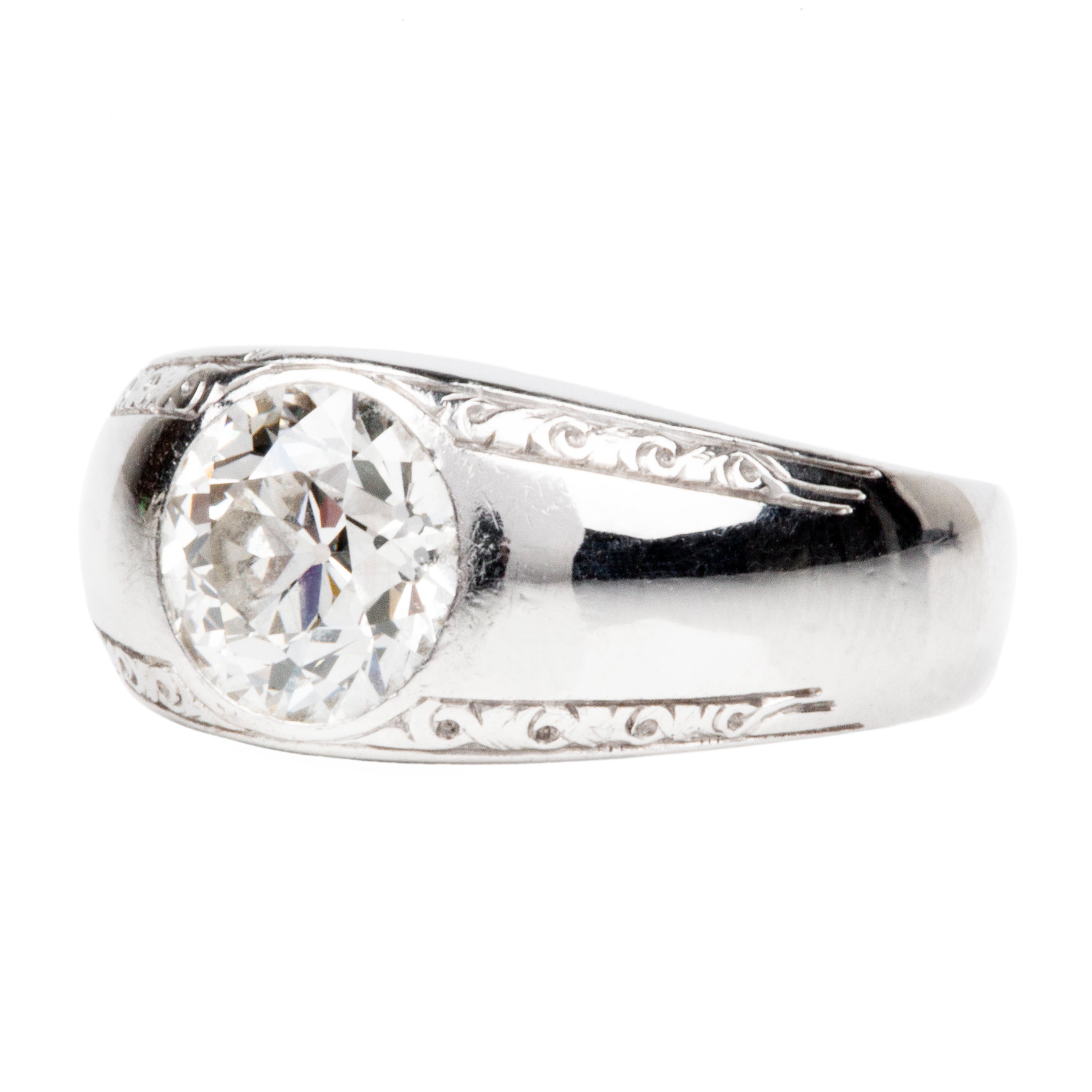 Early 20th Century flush set old European cut diamond ring, set in 18kt white gold. Lovely hand engraved carved border. Approximately 1.35 carat old European cut diamond, H color and VS clarity. American in origin. Circa 1930.