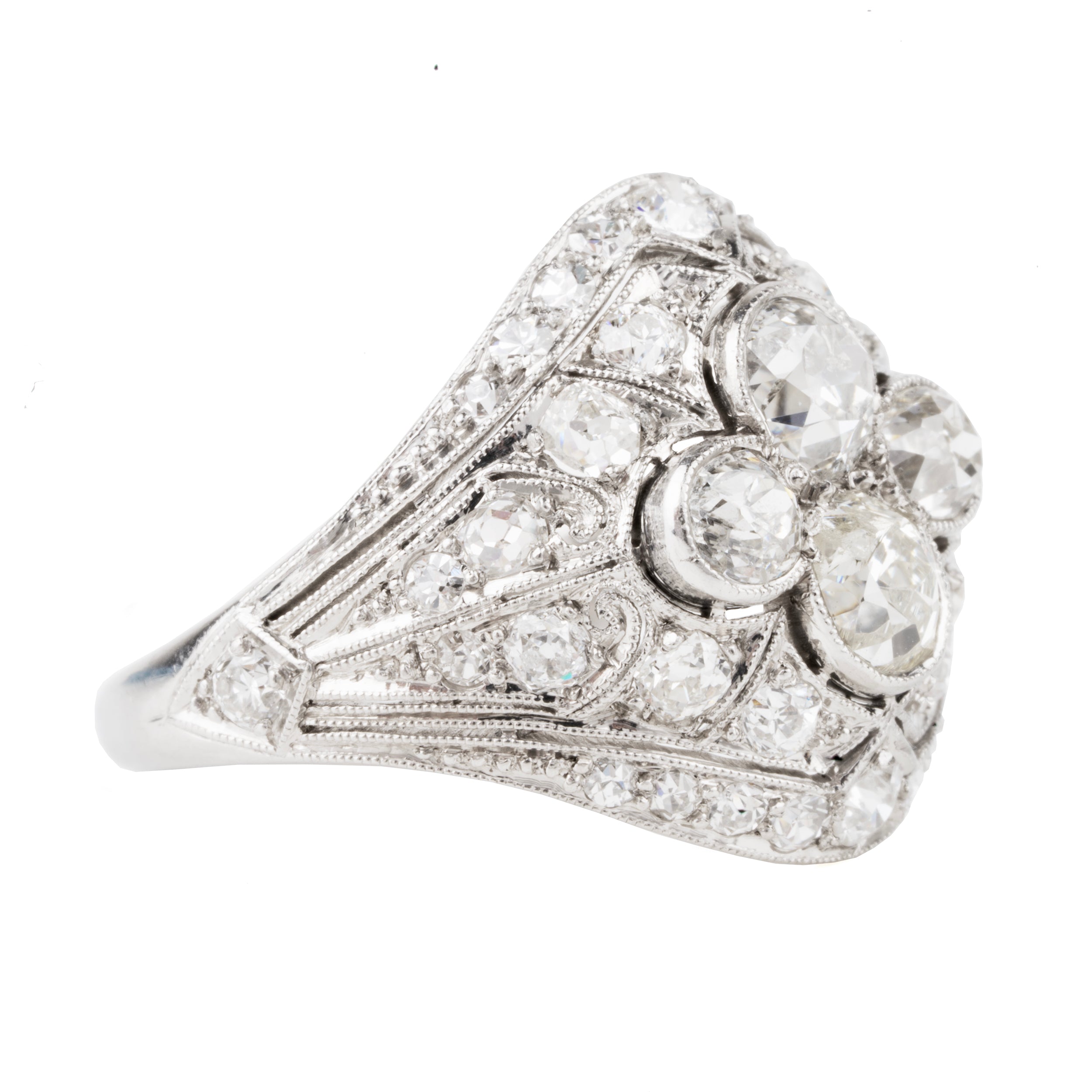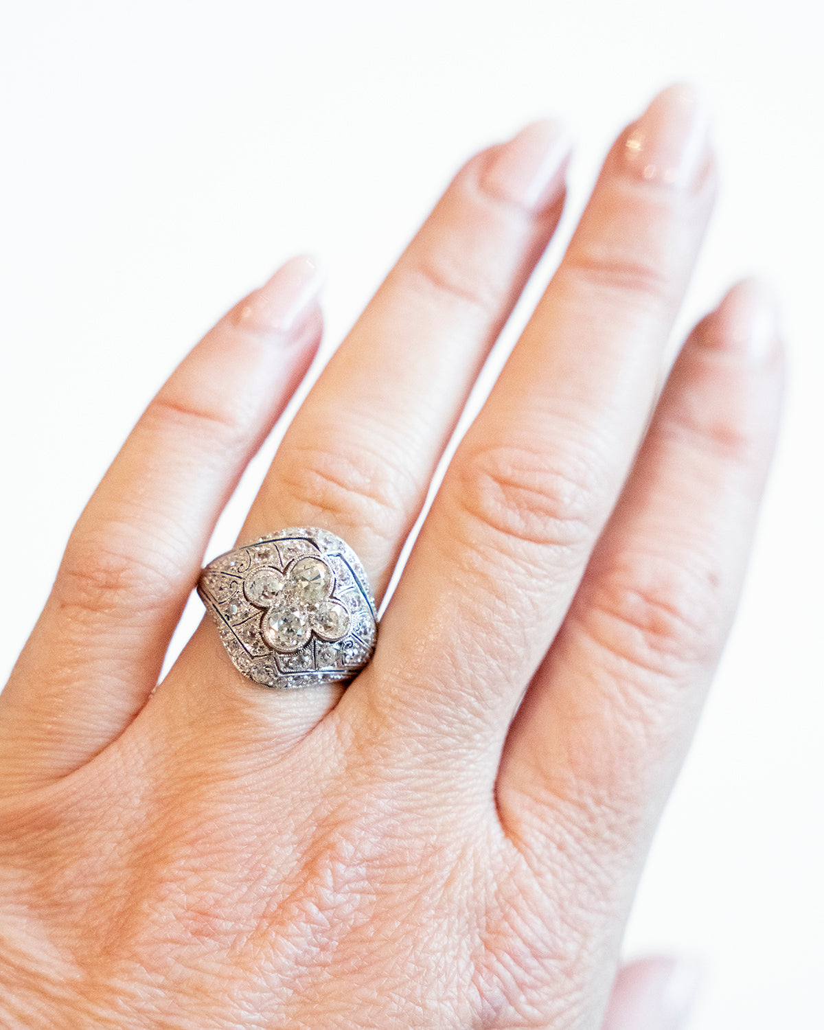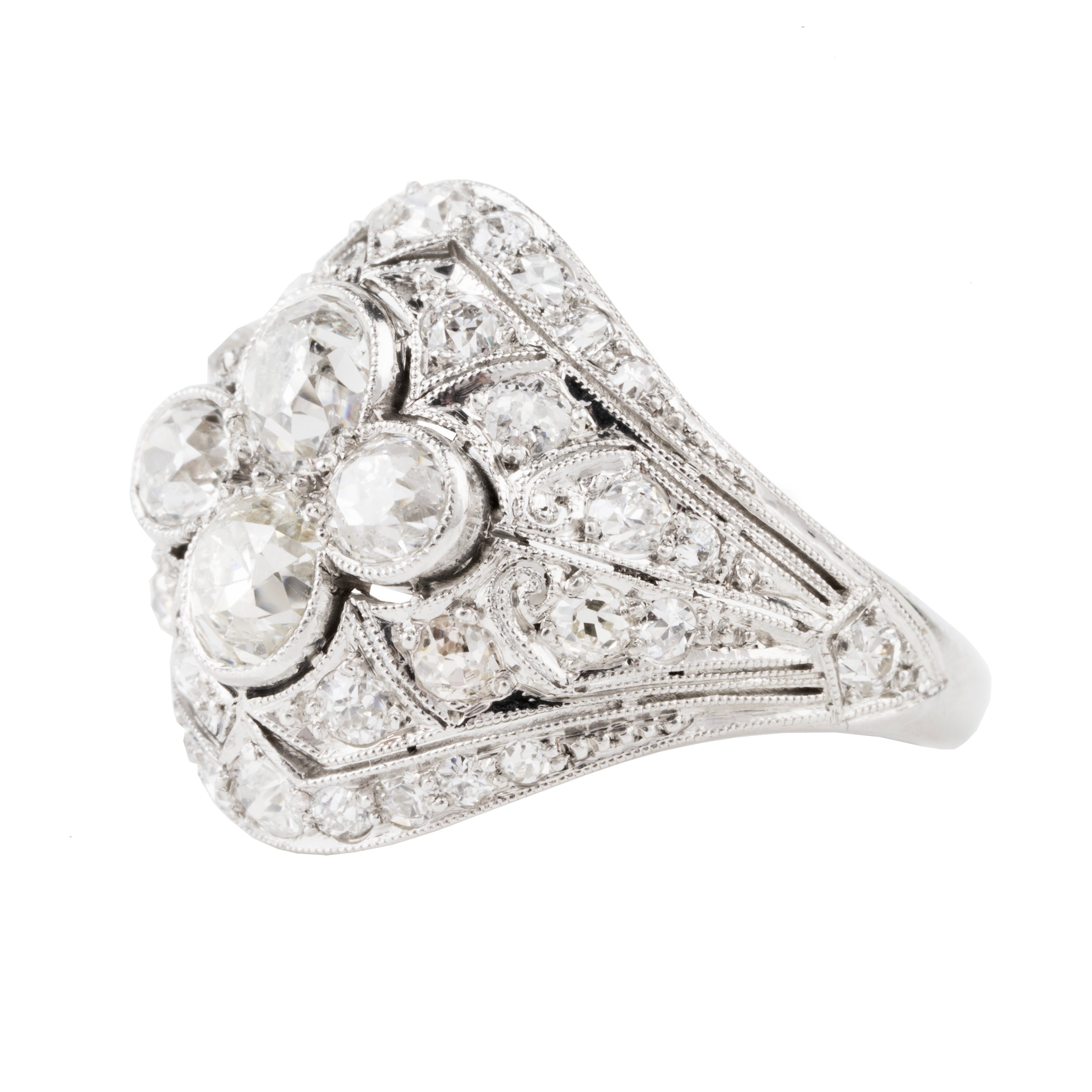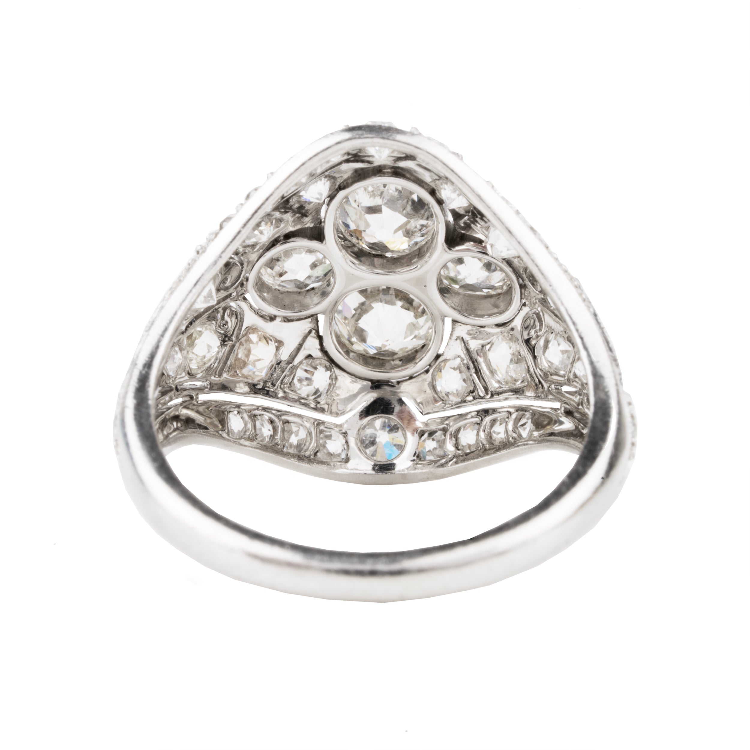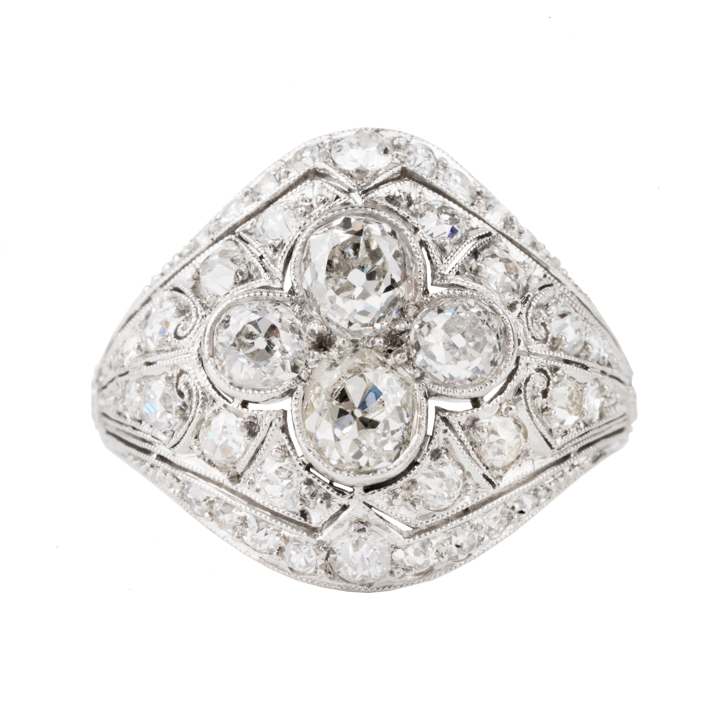 Quatrefoil design with four primary old mine-cut diamonds surrounded by dozens of additional single-cut stones in masterful platinum work. The estimated total weight is 1.5 carats, numbered 028540. America, circa 1910.