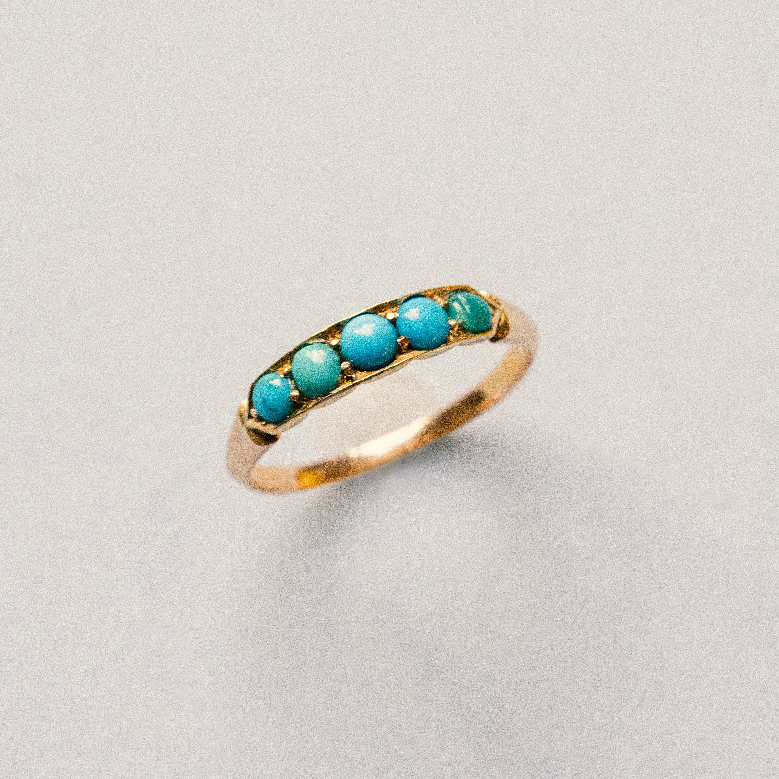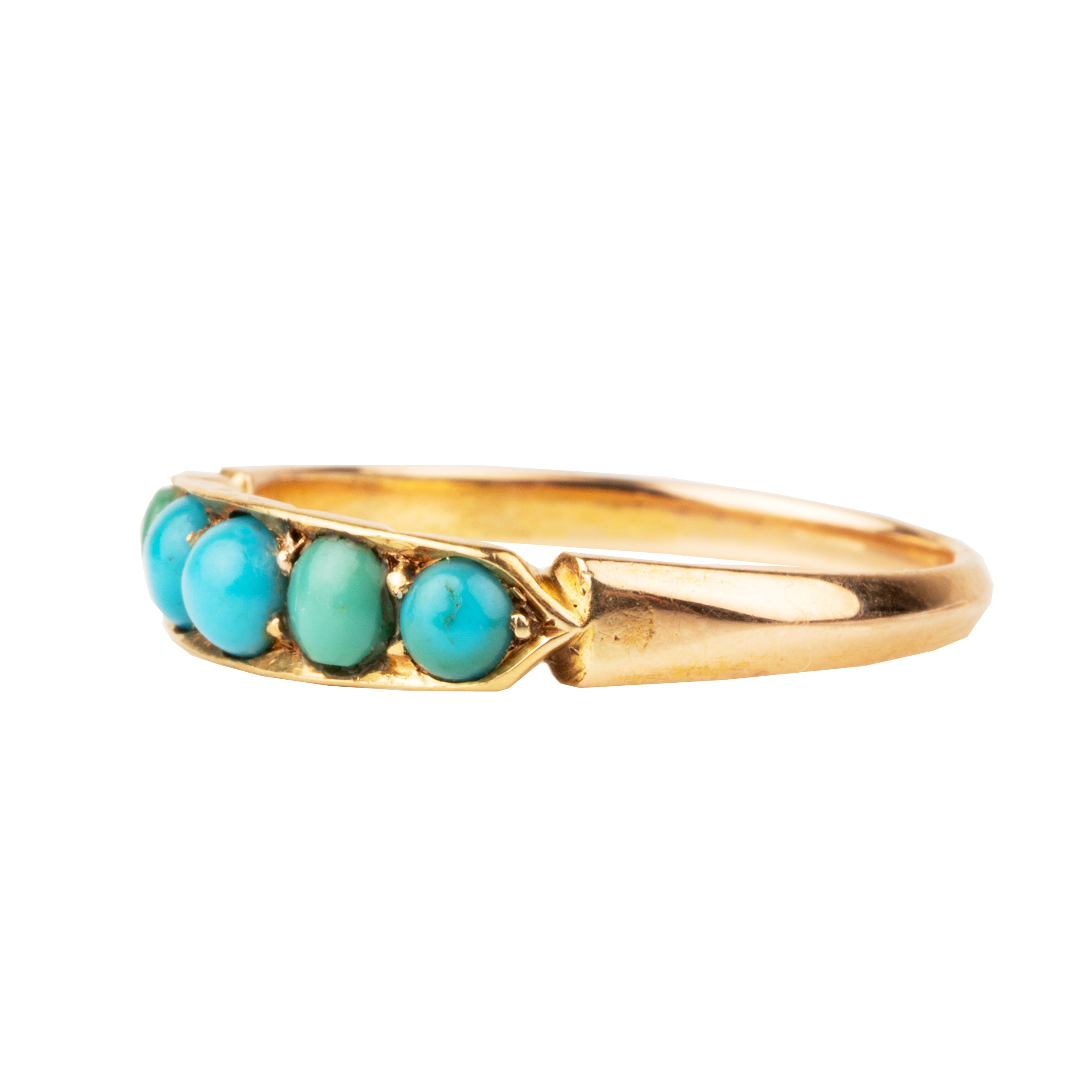 Five natural Persian turquoise cabochons in varied colors, set in a square-shaped 9k gold setting. On a slightly tapered knife-edge band.
