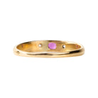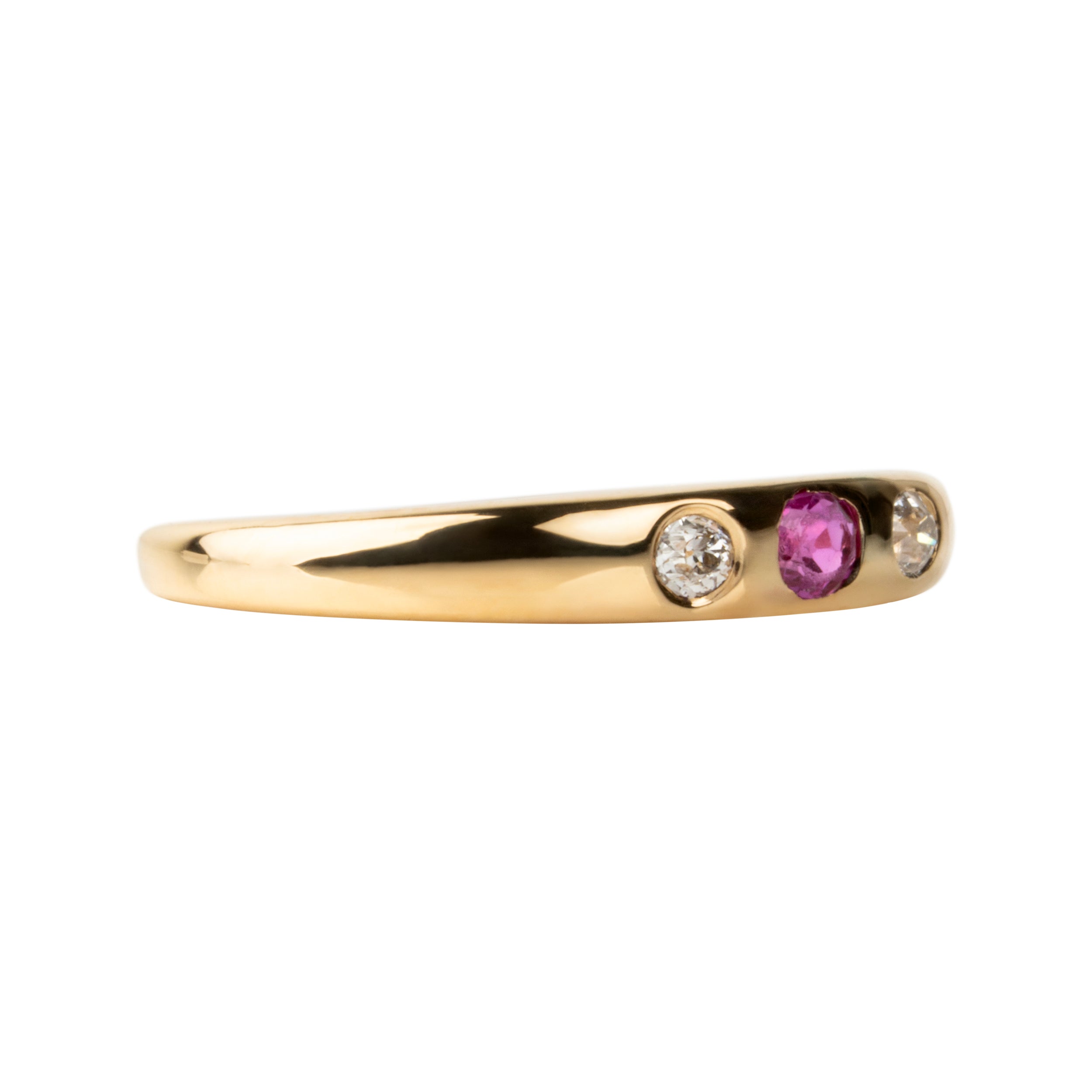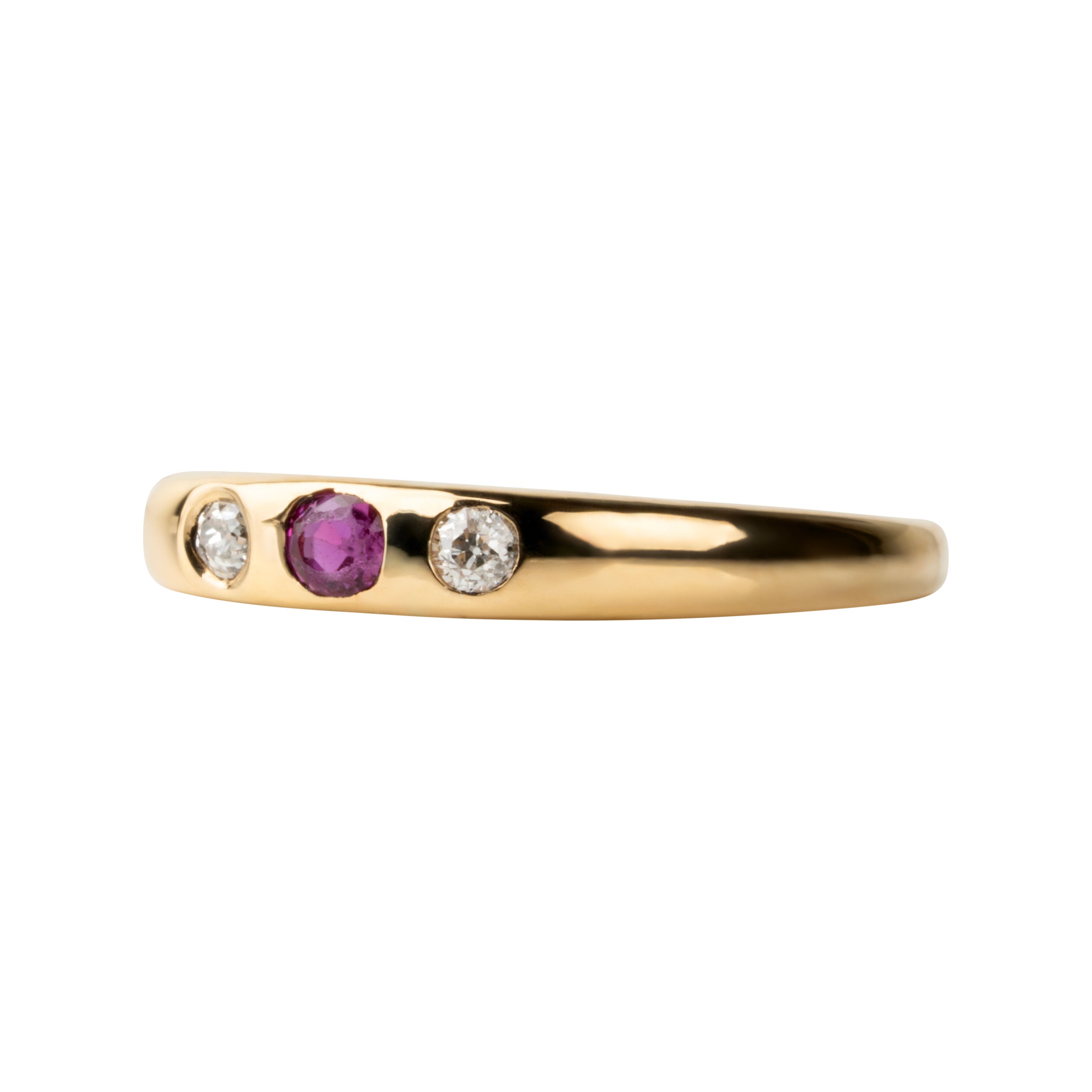 Victorian era gypsy set three stone ring, in 18k gold. One ruby paired with two diamonds.