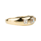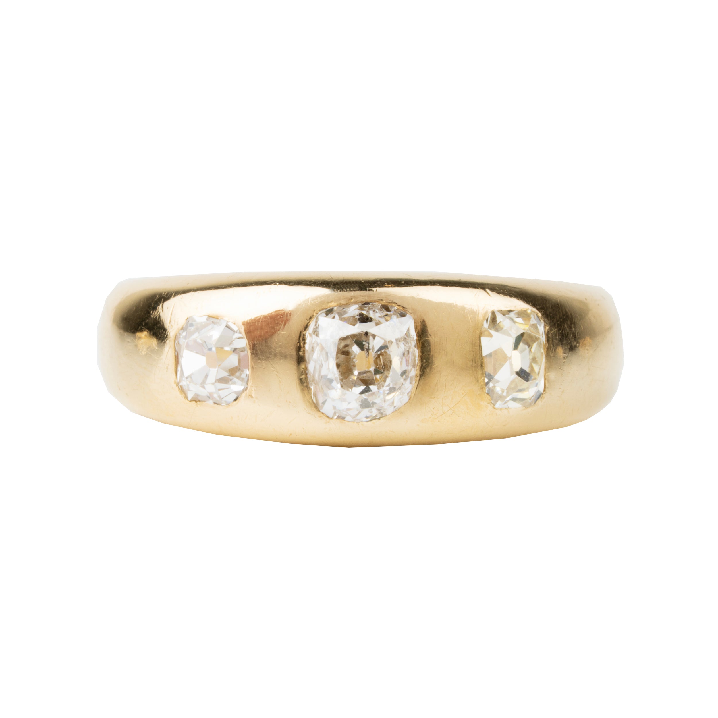 Victorian era gypsy set three stone ring. Three high crowned Old Mine cut diamonds in 18k gold.