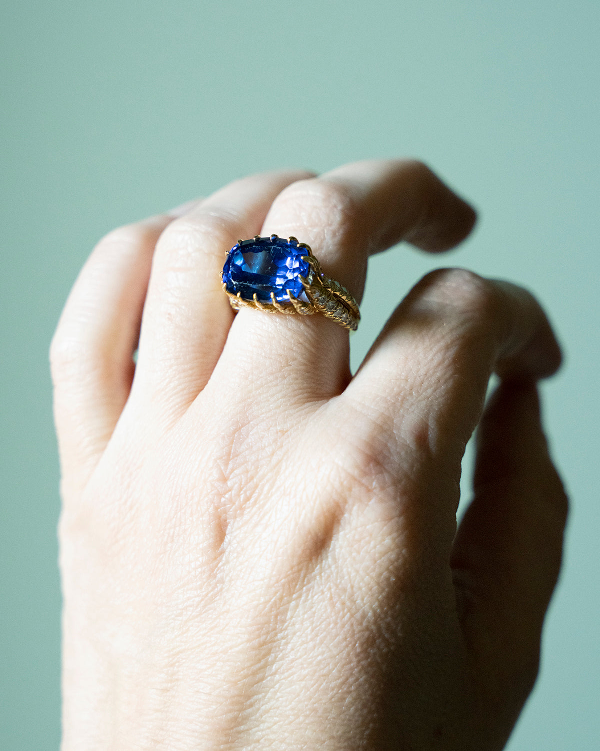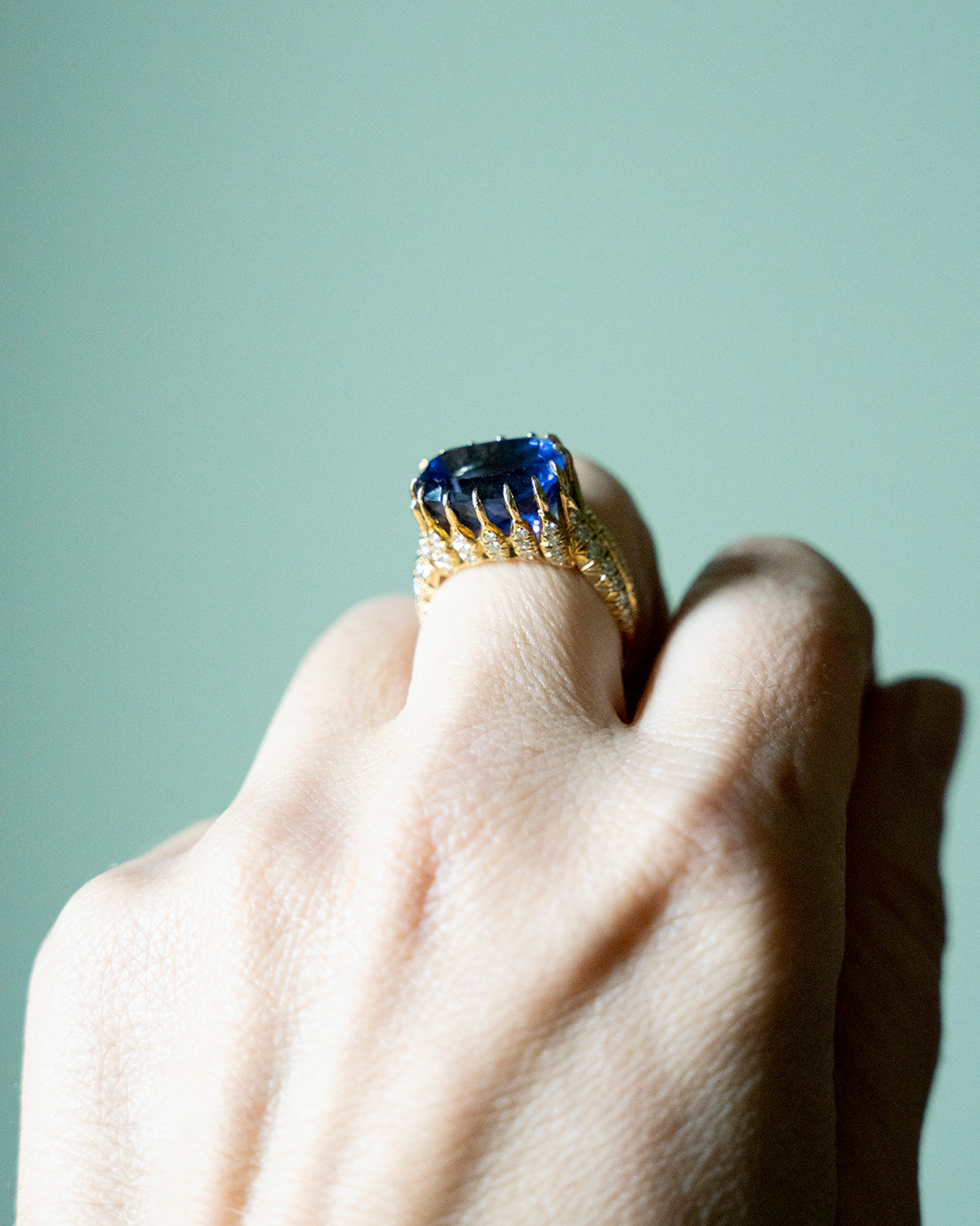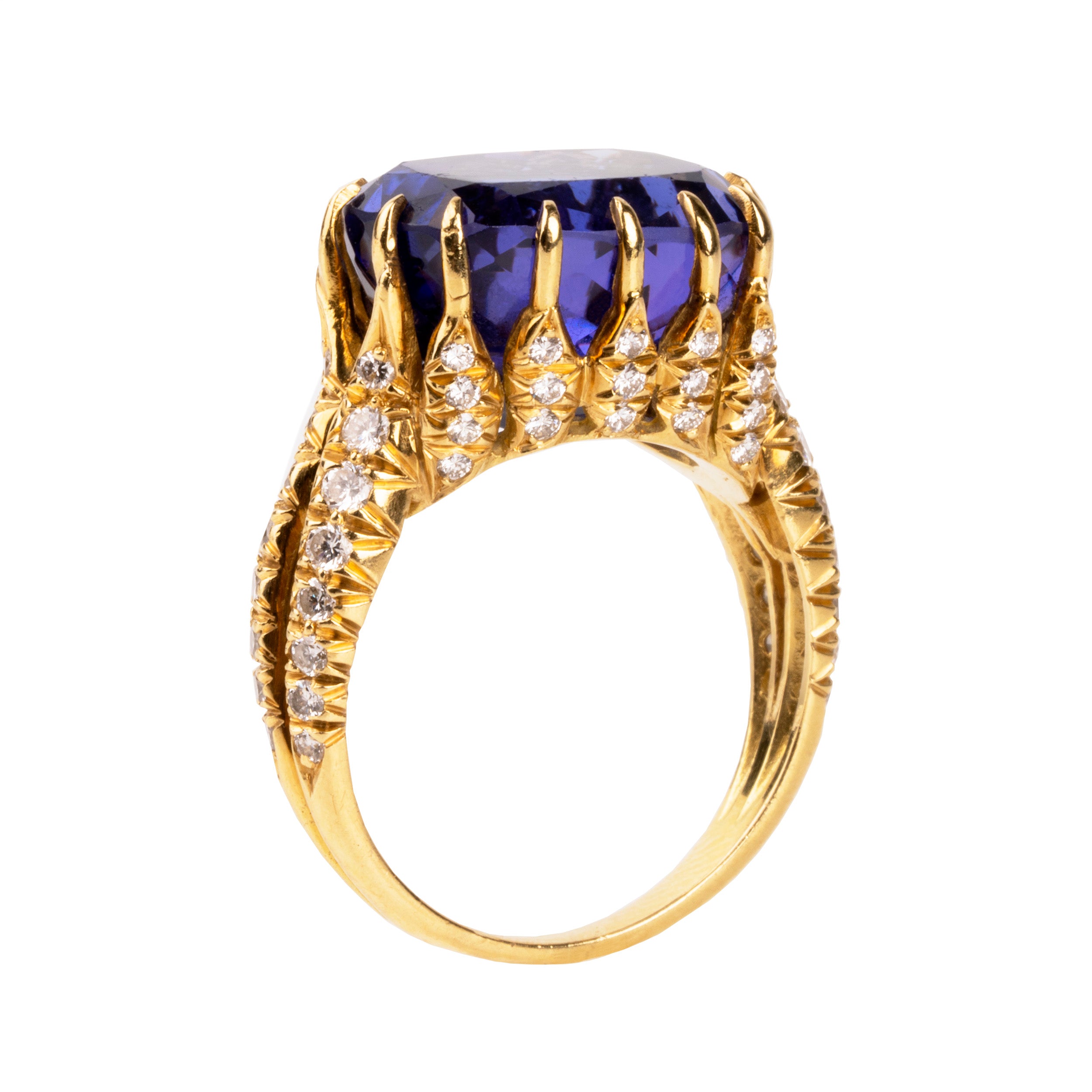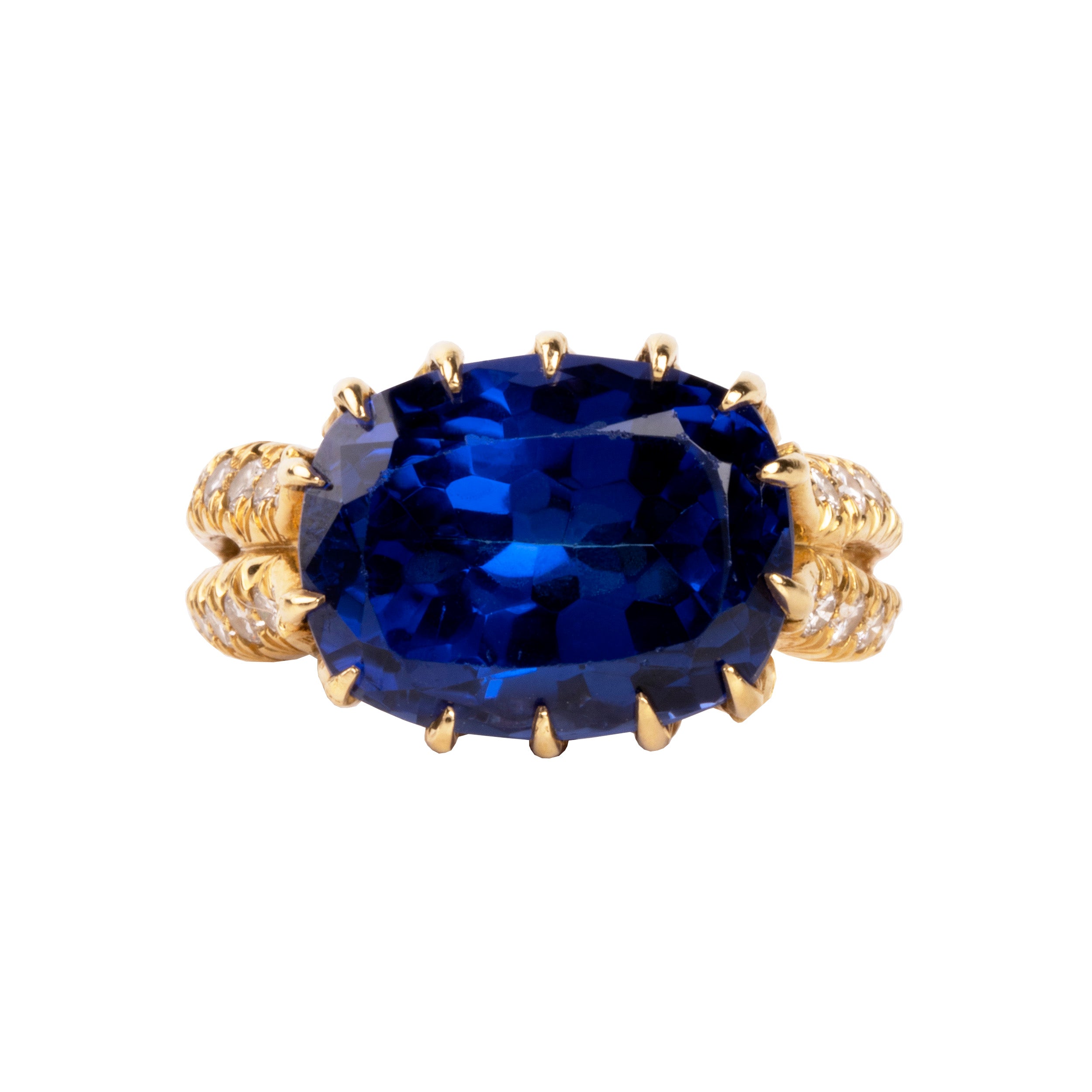 Vintage Julius Cohen cushion cut tanzanite ring. An approximately 8 carat cushion cut Tanzanite is set in an elaborate diamond and 18k gold claw setting.