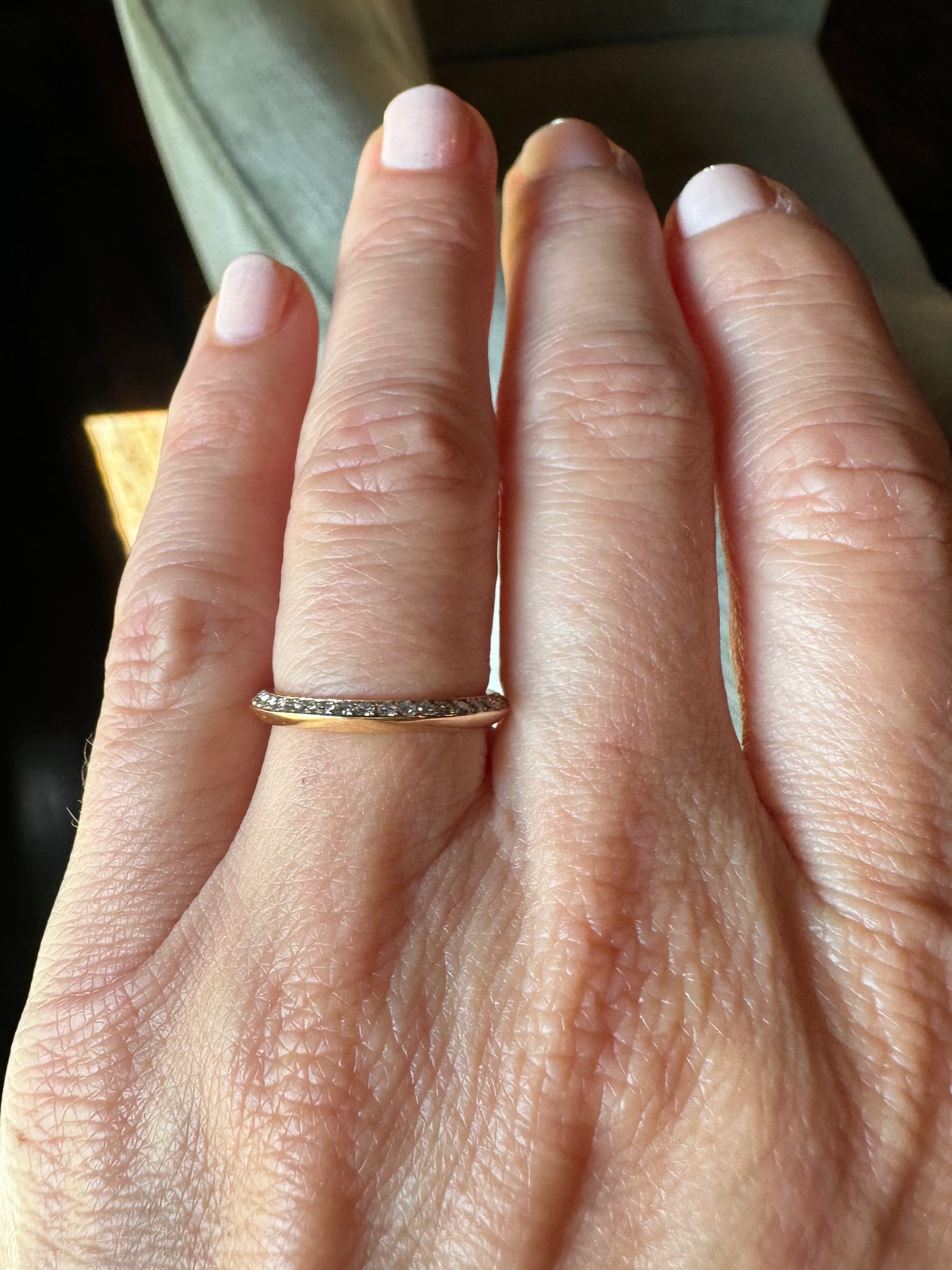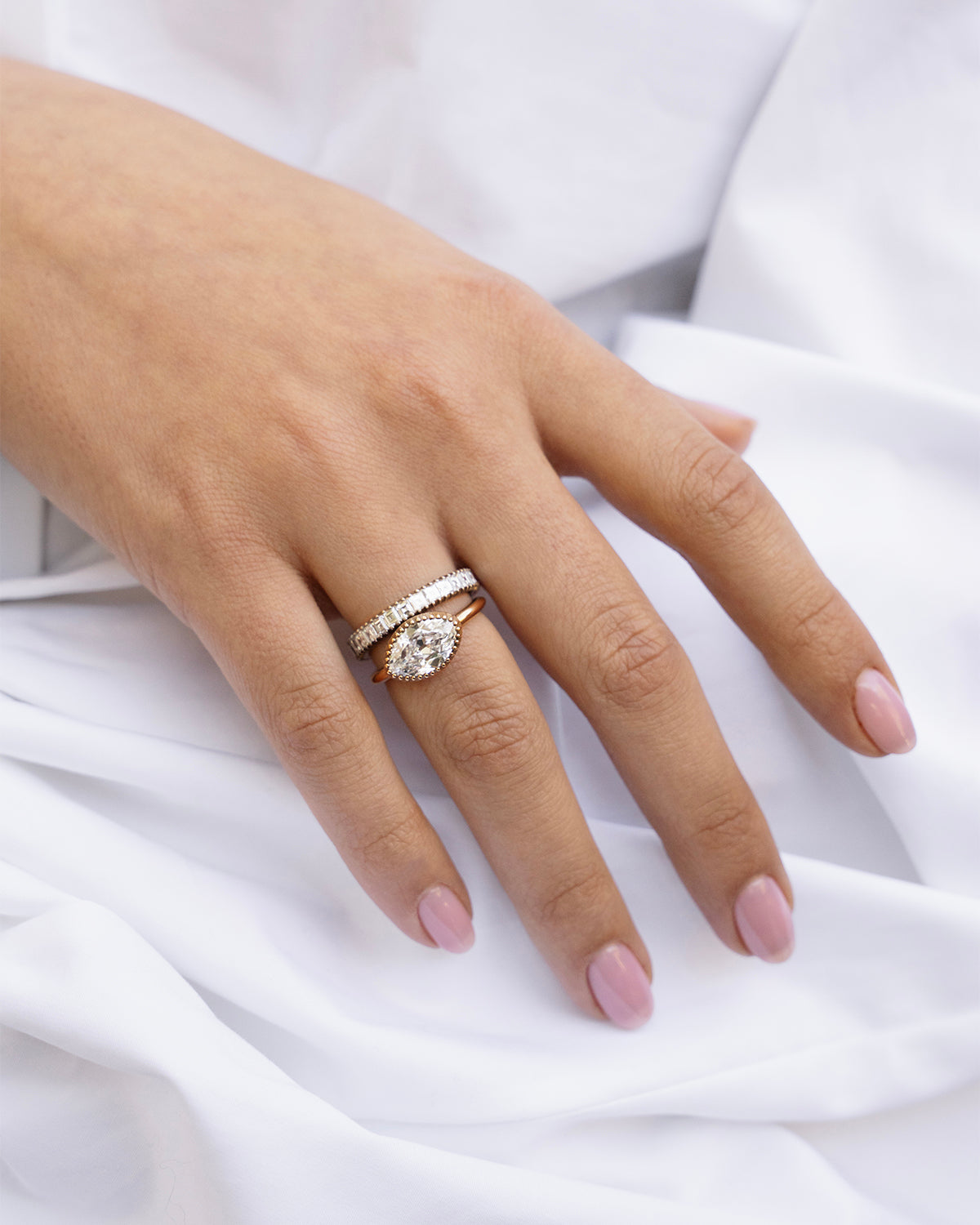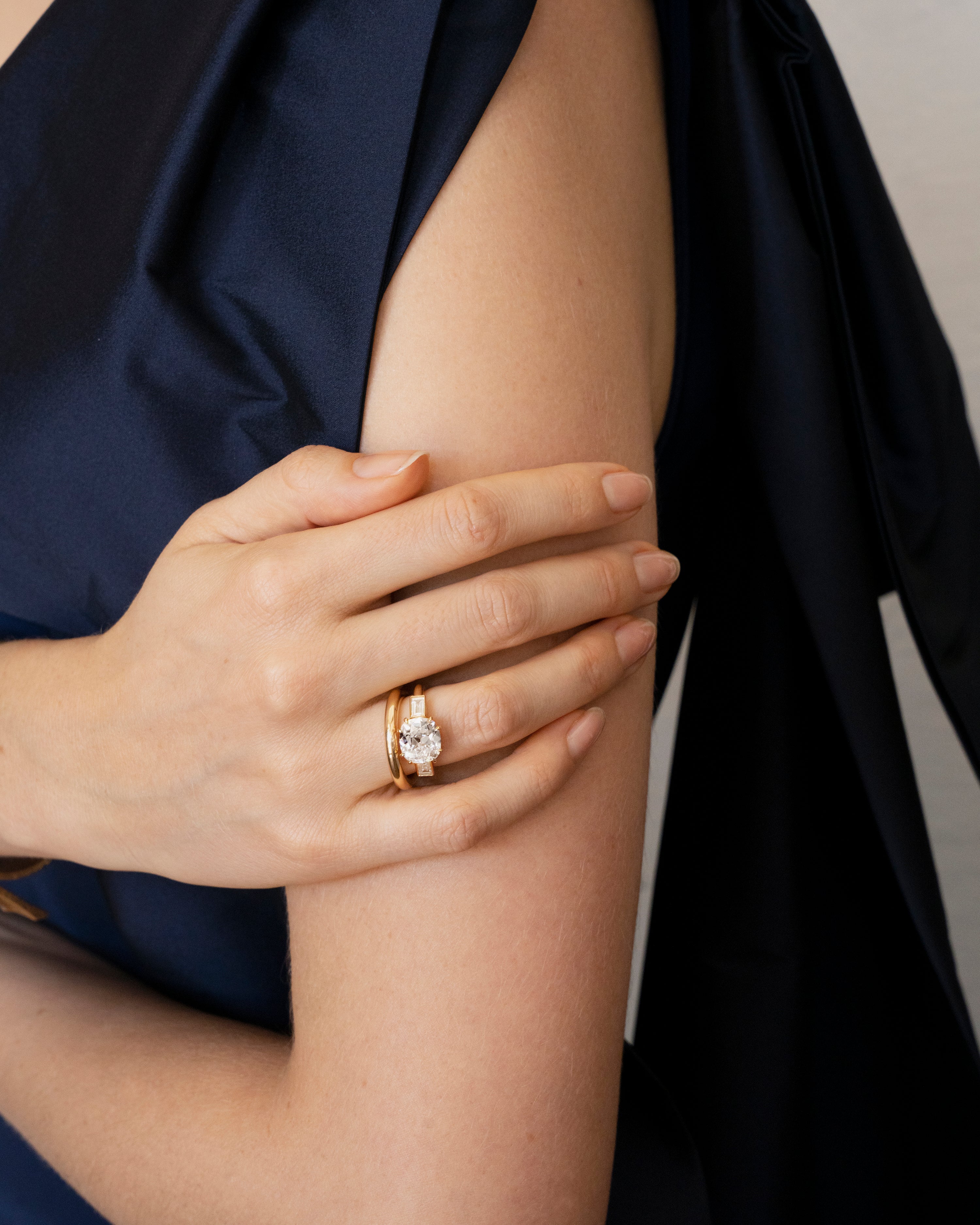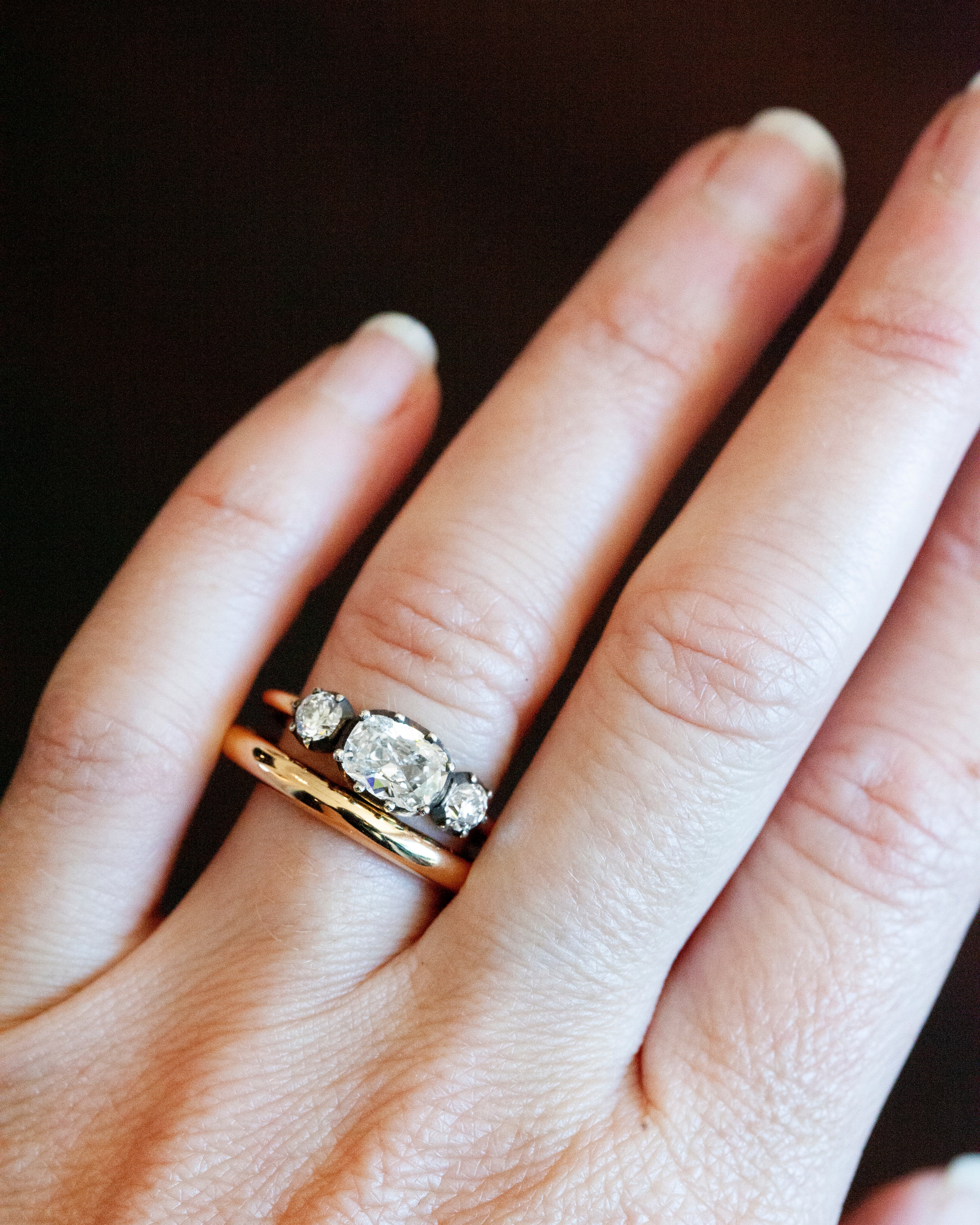 This design is inspired by a labor-intensive setting technique common in 18th and 19th century rings. The silver-on-gold technique is true to the rings that inspired this design and are rarely seen in modern jewelry.