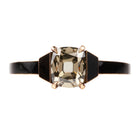 Inspired by Victorian era black jewelry, we designed this unique ring with onyx and enamel details. The prongs are hand filed to precise points and the traditional vitreous enamel is meticulously applied to the sides and shoulders of the ring. The diamond is an antique cushion cut stone of 1.20 carats in a rare fancy greenish-brown color, VS1 clarity. Handcrafted in our 18k old gold.