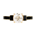 Inspired by Victorian Era black jewelry, we designed this unique ring with enamel details. The prongs are hand-filed to precise points and the traditional vitreous enamel is meticulously applied to the sides and shoulders of the ring. This ring features an old mine cut diamond of 1.52 carats, I color. Handcrafted in our 18k old gold.