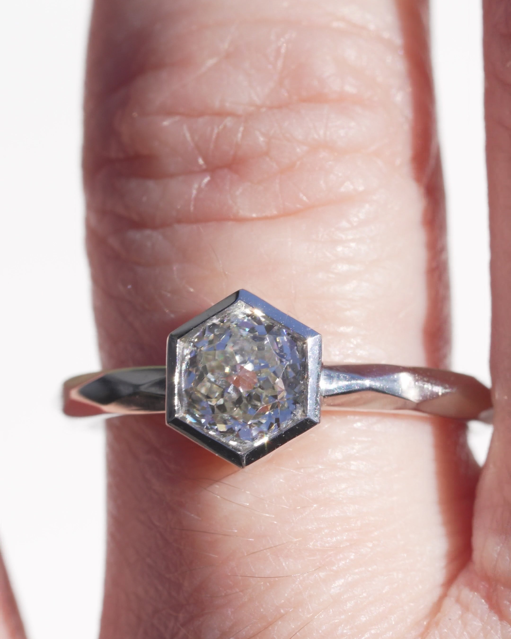 Bell and Bird No. 3929 platinum solitaire ring. Hand facetted band and hexagonal setting with an unusual early 20th century Jubilee cut diamond. This ring features a GIA certified Jubilee cut diamond, 1.10 carat, J color and VS1 clarity. Handcrafted in platinum.