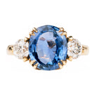 Classic three-stone ring with natural sapphire and two old European cut diamonds. The primary stone is a certified 5.17 carat sapphire, of Madagascan origin with no treatment. The sapphire is paired with two old European cut diamonds, .96 carats in total diamond weight, H color, and VS clarity. Handmade in our 18k old gold with a simple squared band.