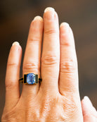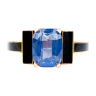Inspired by Victorian-Era black jewelry, we designed this unique ring with enamel details. Tab prongs hold the natural sapphire stone flanked by black enamel. Traditional vitreous enamel is meticulously applied to the sides and shoulders of the ring, a painstaking process.