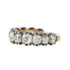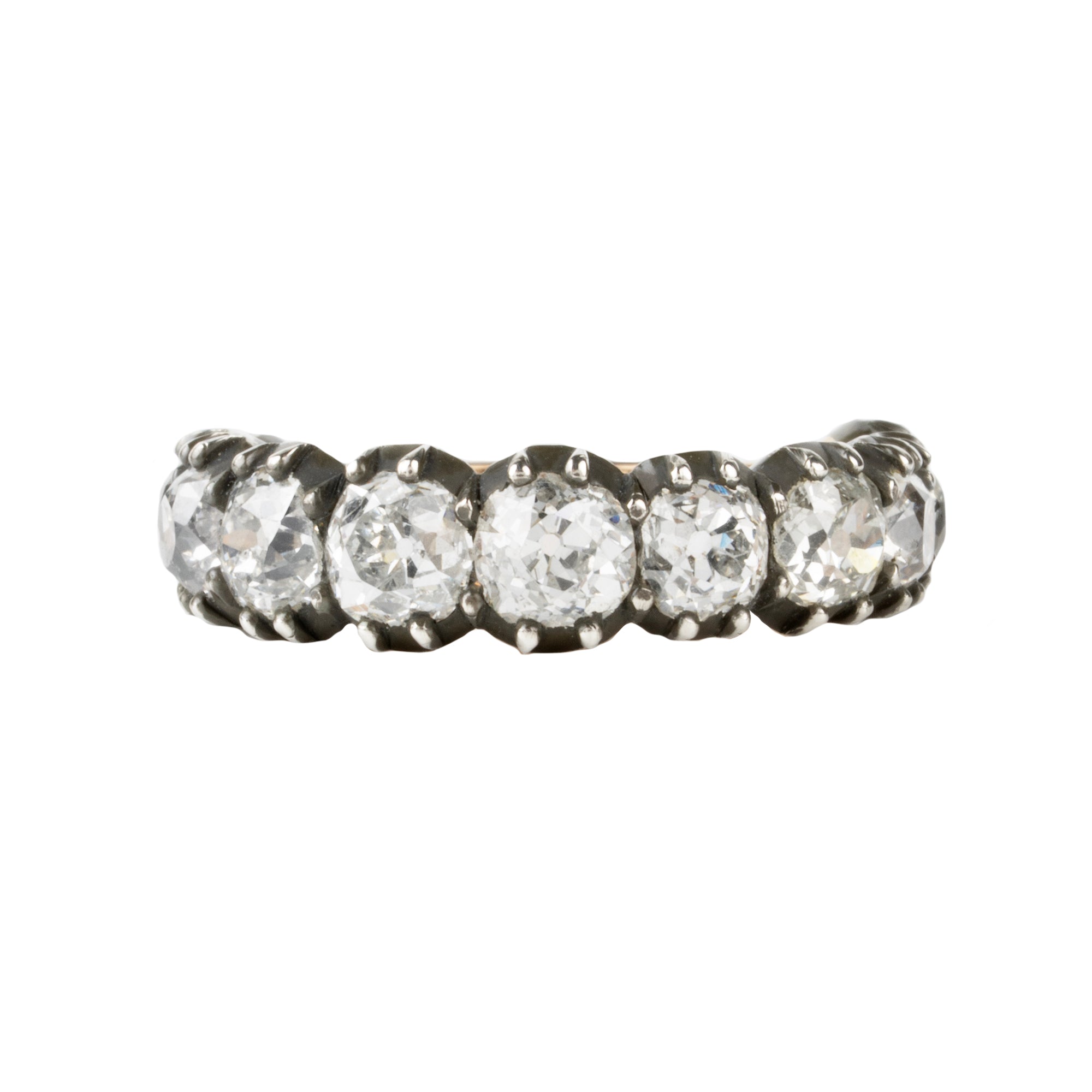 One of our signature designs. Each ring features a unique set of slightly graduated old mine cut diamonds. It often takes months to collect a suite of stones in the correct size, color, and clarity. This ring features 19th century old mine cut diamonds, approximately 4.22 carats in total diamond weight. The estimated grades of the stones are H-J in color and VS-SI in clarity. These are all made in limited editions.