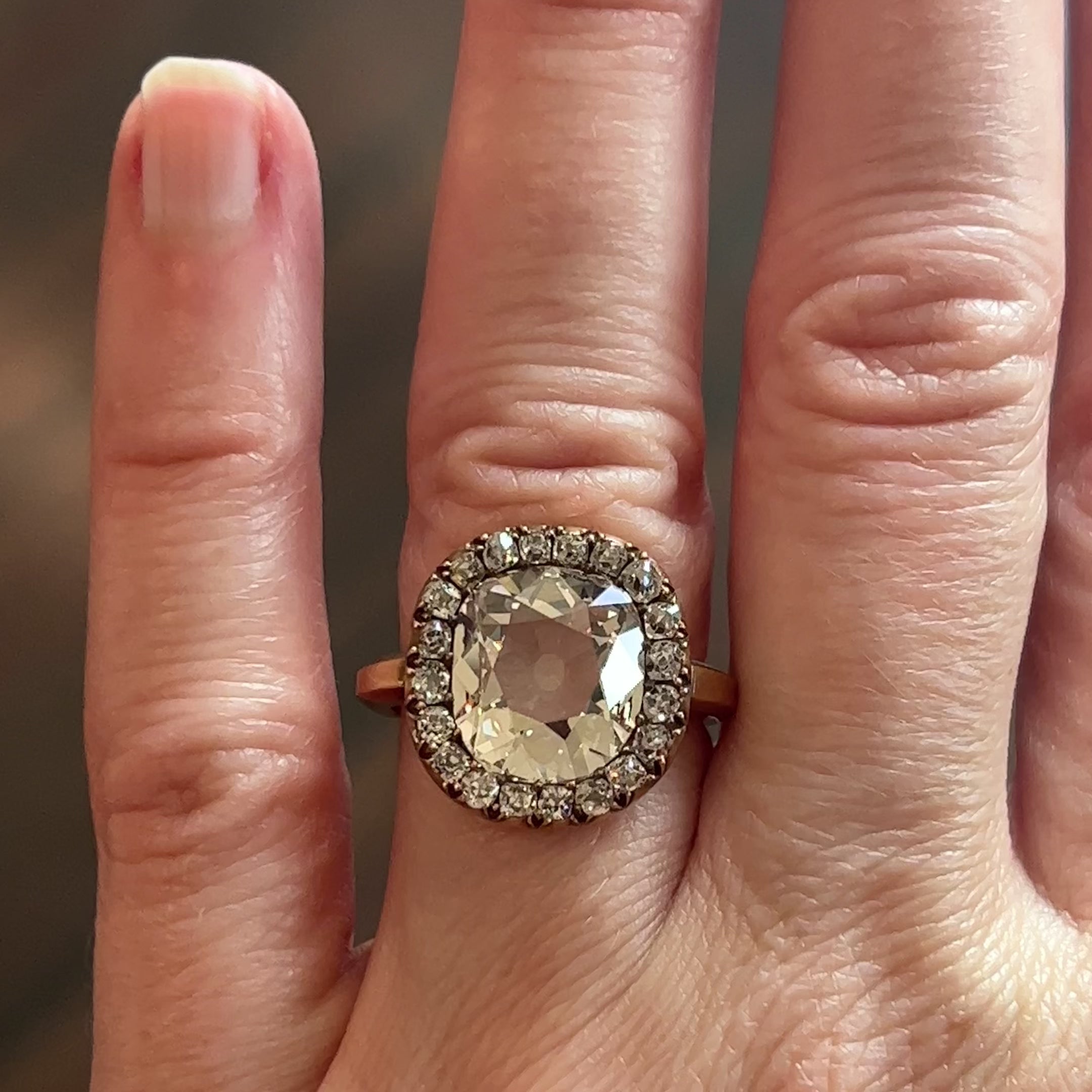 Handmade diamond cluster ring, in our 18k "old gold". Featuring a central antique 3.21 carat old mine cut style diamond. The diamond has a unique warmth with incredible clarity.  Surrounded by twenty small old mine cut diamonds in varied shapes, weighing approximately 1.20 carats in total diamond weight. We have applied a propitiatory acid treatment to darken the gold, giving a deep tone to the settings surrounding the stones. This design is inspired by a labor-intensive setting technique of many 18th and 19th century rings.
