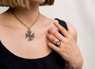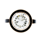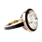 A clean bezel holds this diamond, surrounded by black enamel. Traditional vitreous enamel is meticulously applied to the sides and shoulders of the ring, a painstaking process. This ring features a vintage round brilliant cut diamond of 5 carats. It is handcrafted in our 18k old gold.