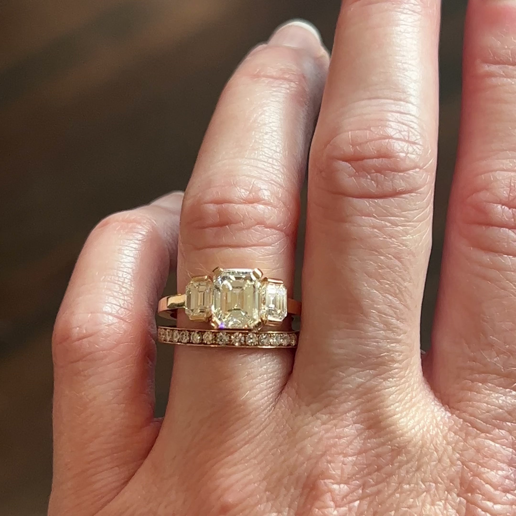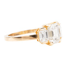 The clean crisp design is hand fabricated in our 18k old gold. The central emerald cut diamond is set with four tab prongs with two emerald cut side stones. The ring is finished with a squared off band. The primary diamond is certified to be 1.74 carats with quality of H color, and VS1 clarity. The side stones are emerald cut diamonds weighing approximately .88 carats in total weight.