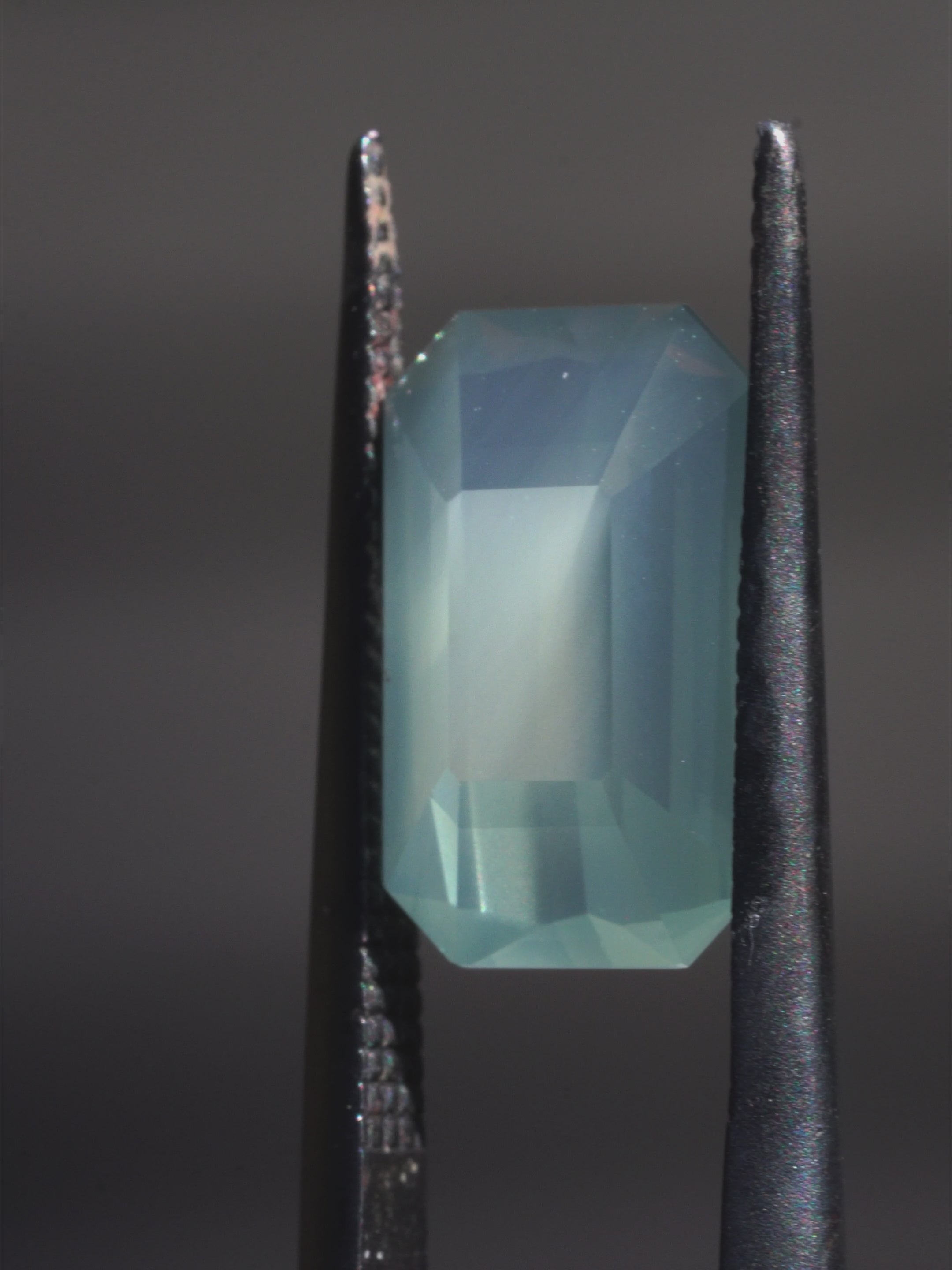 This ring features an unusual emerald cut sapphire of 4.59 carats, certified to be of Australian origin and free of any treatment to enhance the color or clarity. The stone has an indescribable quality that is difficult to capture in a photograph. The silkiness of the stone and soft color remind us of sea glass. This ring is one-of-a-kind and will not be reproduced or available by special order. A stone of this color and quality is quite rare and not repeatable.
