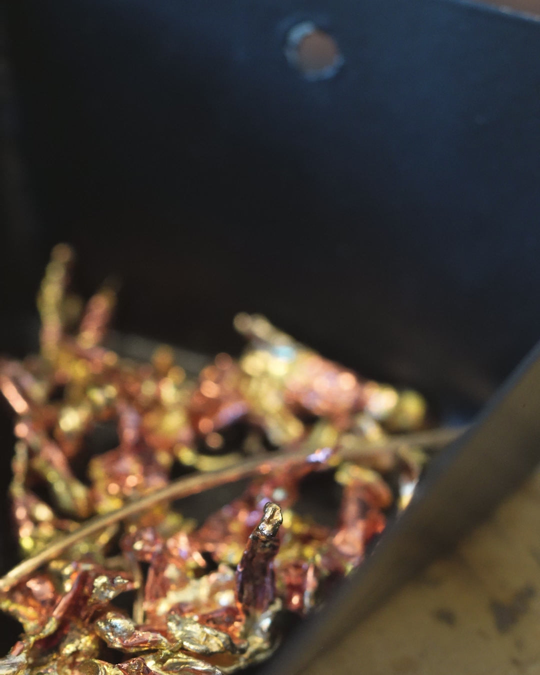This ring is fabricated in our Texas workshop in our custom 18K rose gold alloy. A more subdued, darker tone than commercially available rose gold. We call this color "old gold" and created the alloy in the spirit of the many 19th century rings we have handled.