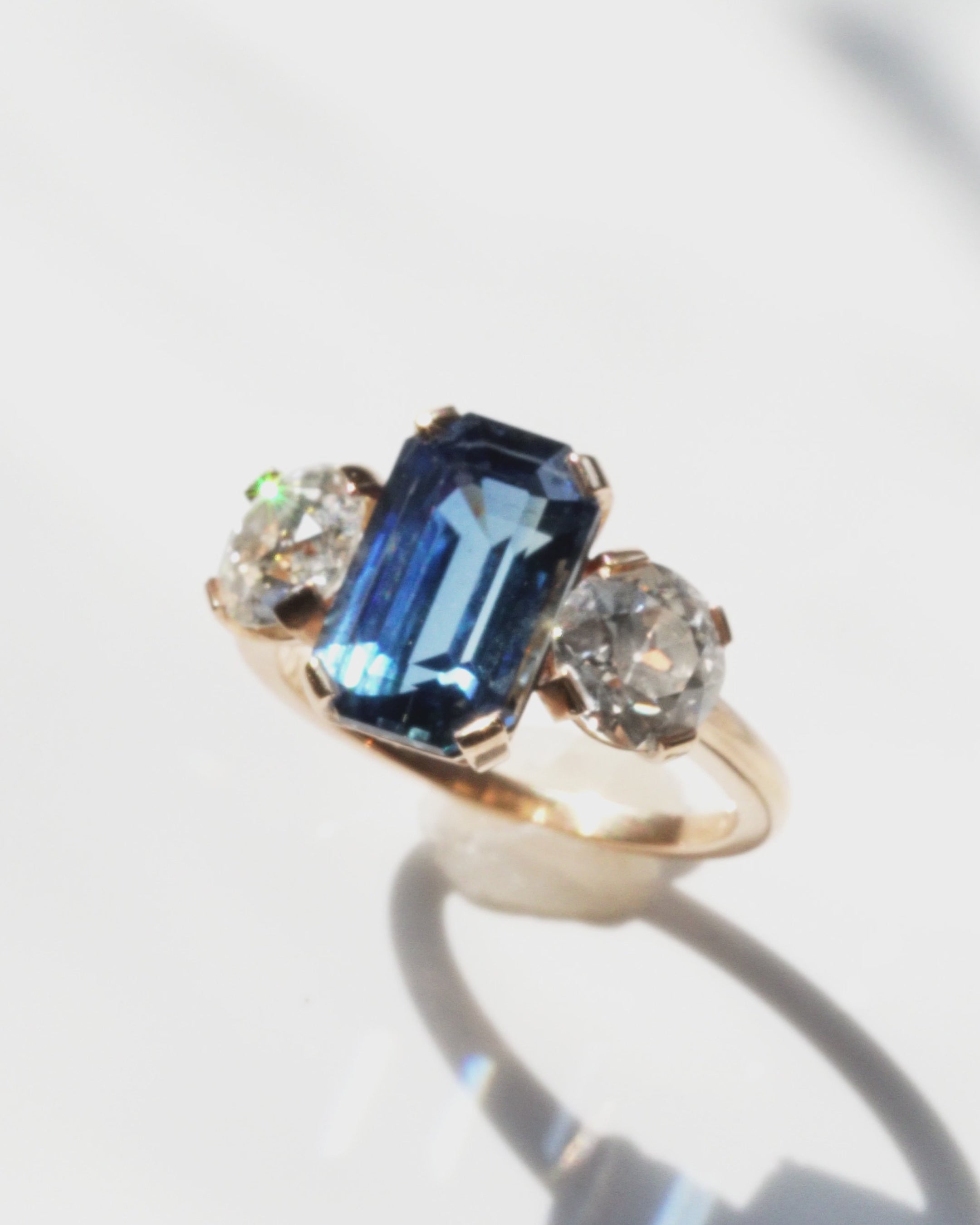 Classic three-stone ring with natural sapphire and two old European cut diamonds. The primary stone is a certified 5.02 carat sapphire, of Basaltic origin with no treatment. The sapphire is paired with two old European cut diamonds, 1.02 carat J/SI1 and 1.03 carats H/SI1. Handmade in our 18k old gold with tab prongs and a simple squared band.