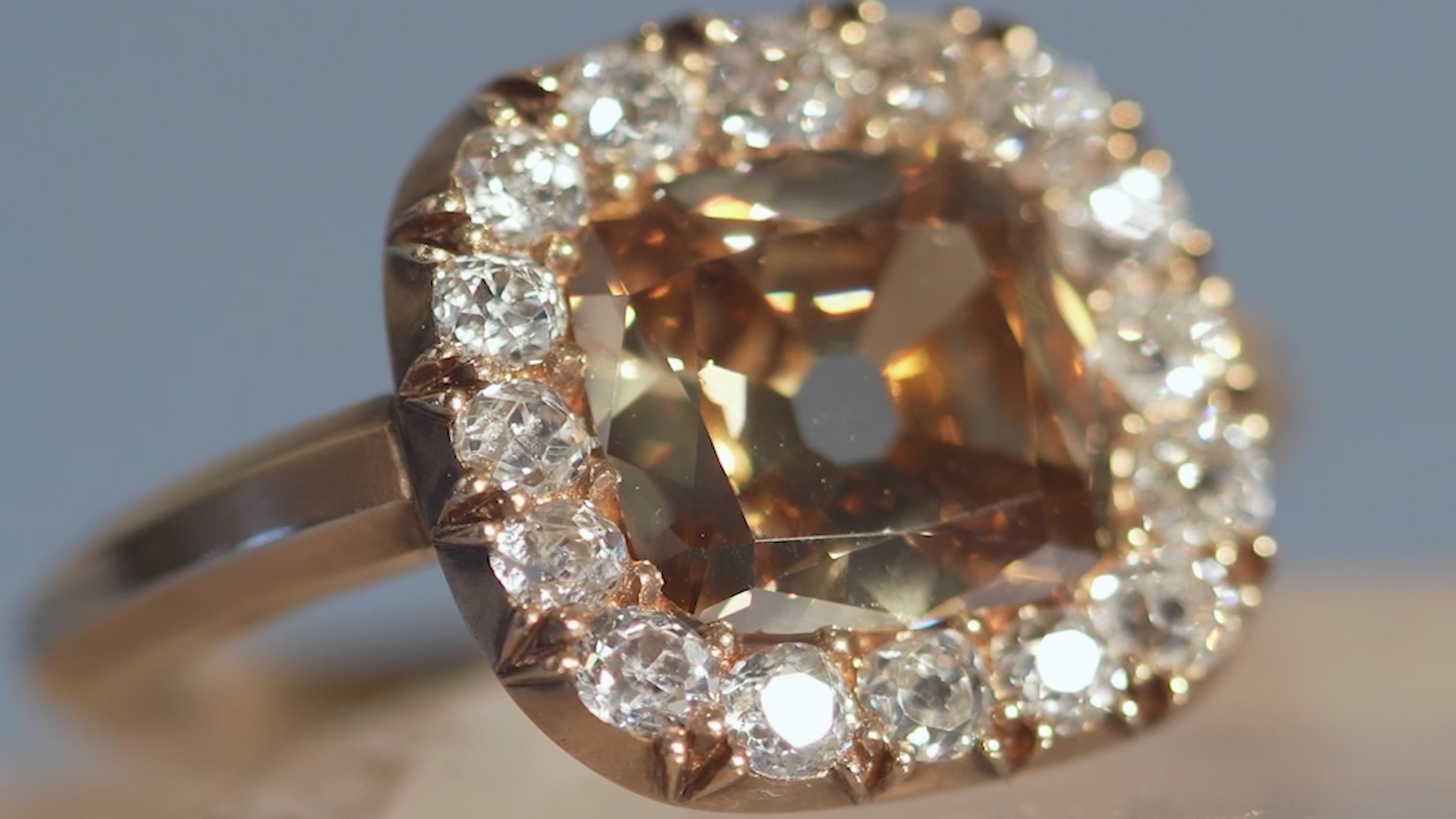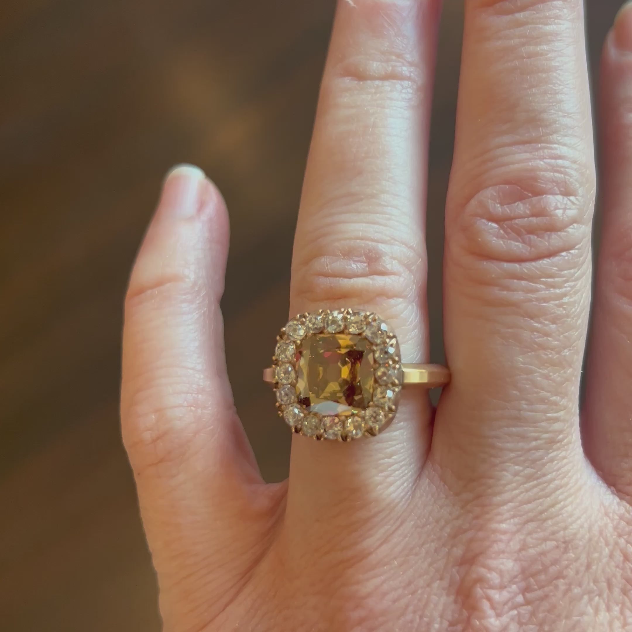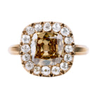 Featuring a central 3 carat old mine cut style diamond. The cinnamon colored stone has a unique warmth with incredible clarity. Surrounded by sixteen small old mine-cut diamonds in varied shapes, weighing approximately 1.50 carats in total diamond weight. We have applied a propitiatory acid treatment to darken the gold, giving the settings surrounding the stones a deep tone. This design is inspired by a labor-intensive 'cutaway' setting technique of many 18th and 19th century rings.