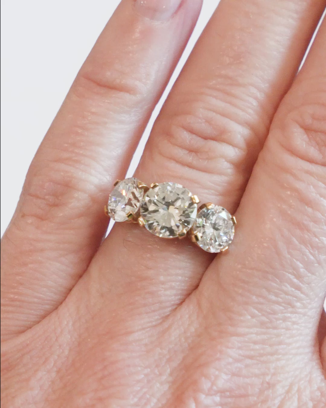 A classic three-stone diamond ring in our 18k old gold featuring a slim band. The center stone is set with four tab prongs. This example features three round brilliant cut diamonds. The center stone in this example is 1.81 carat diamond, GIA-certified H color, and VS1 clarity. Flanked by 2 GIA-certified round brilliant cut diamond side stones, 1.11 G/SI2 and 1.22 carats, F/SI1. Made in 18k old gold.