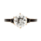 A classic six prong diamond with uncommon details. The Antique old European cut diamond is flanked by two custom cut onyx stones and finished with a black enamel band. The prongs are hand-filed to precise, delicate points, and the hard vitreous enamel is traditionally applied. This example features an antique 1.7 carat old European cut diamond.