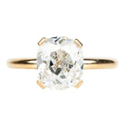 Low profile, minimal setting with 4 squared tapered prongs. The single antique stone is set on a simple rounded band in our 18k old gold. This example features a 2.55 carat cushion shaped old mine cut diamond.