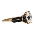 Antique diamond flanked by four custom cut onyx stones and finished with tapered black enamel shoulders. Eight prongs are hand filed to precise delicate points and the hard vitreous enamel is traditionally applied. This example features an antique 2.2 carat old mine cut diamond.