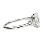 Handcrafted in platinum, this three stone ring features a central diamond flanked by two carré cut stones. This example features a main antique 1.25 carat elongated old mine cut diamond.