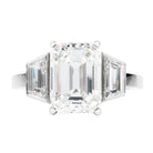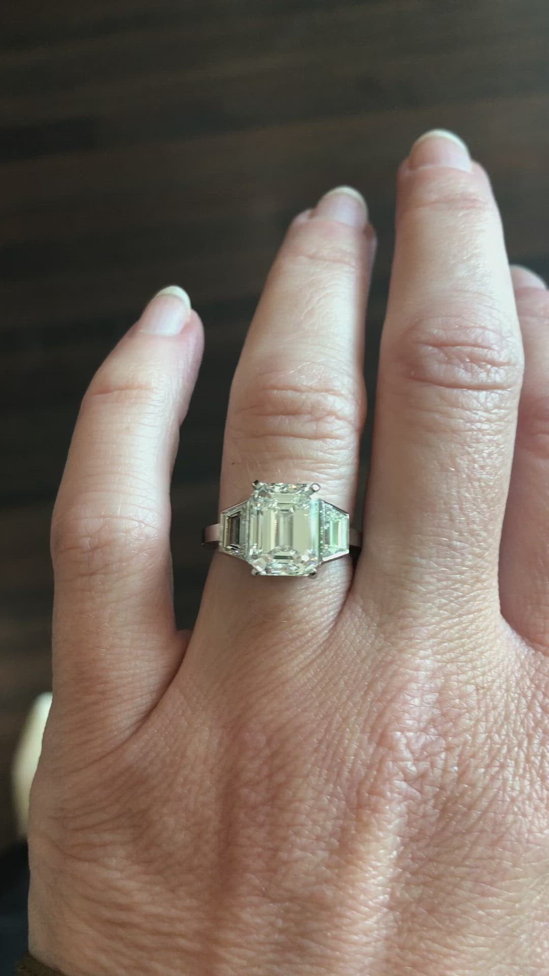 Bell & Bird handmade three stone diamond ring. 3.20 carat emerald cut diamond, with two side trapezoids 0.91 carats in total diamond weight. Set in a platinum setting.