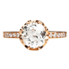 Victorian era inspired scalloped head detail with 8 prongs hold the the antique diamond close to the finger. This is a low profile design. 10 pave set single cut diamond flank the center diamond. This particular example features an old mine cut 1.98 carat, J color and SI1, GIA certified diamond.