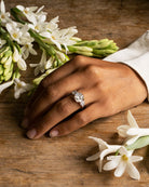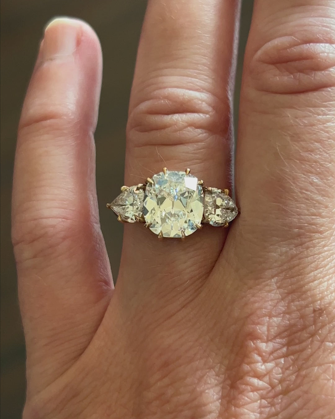 Bell & Bird Three Stone Old Mine Cut and Pear Shaped Diamond Ring