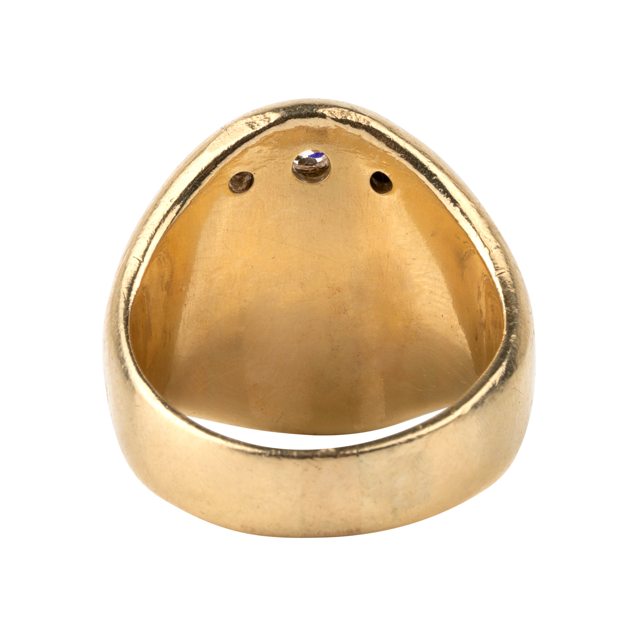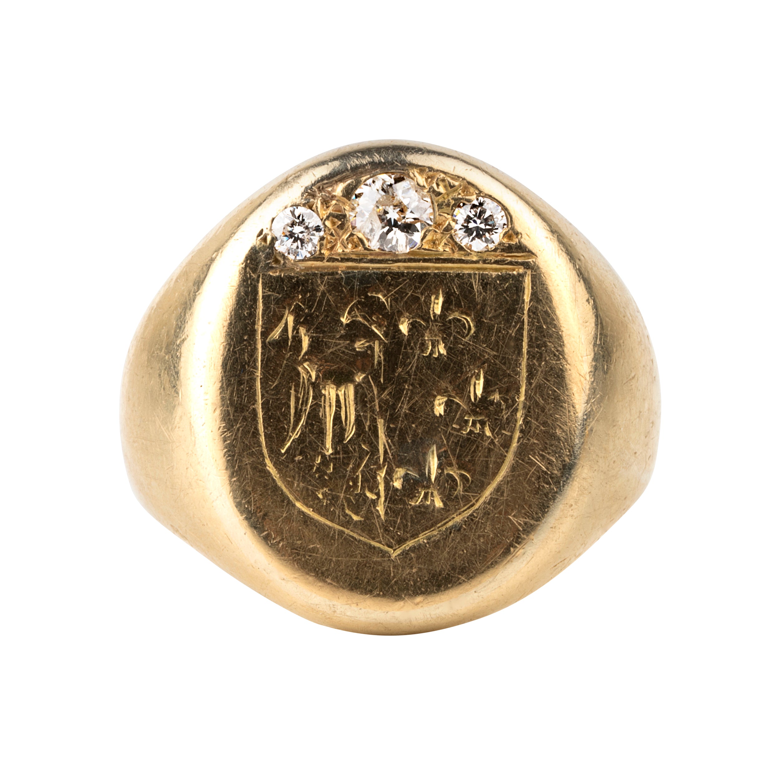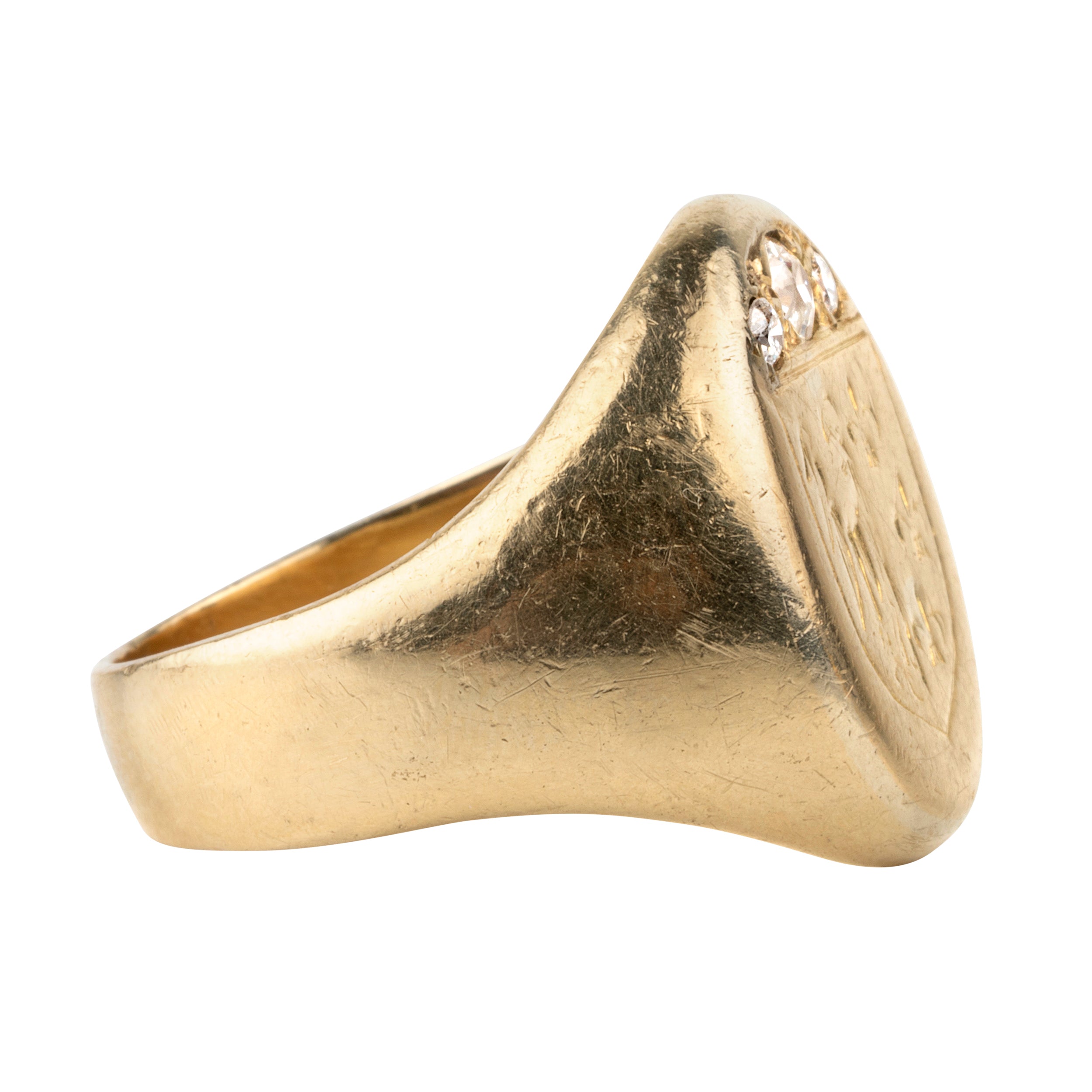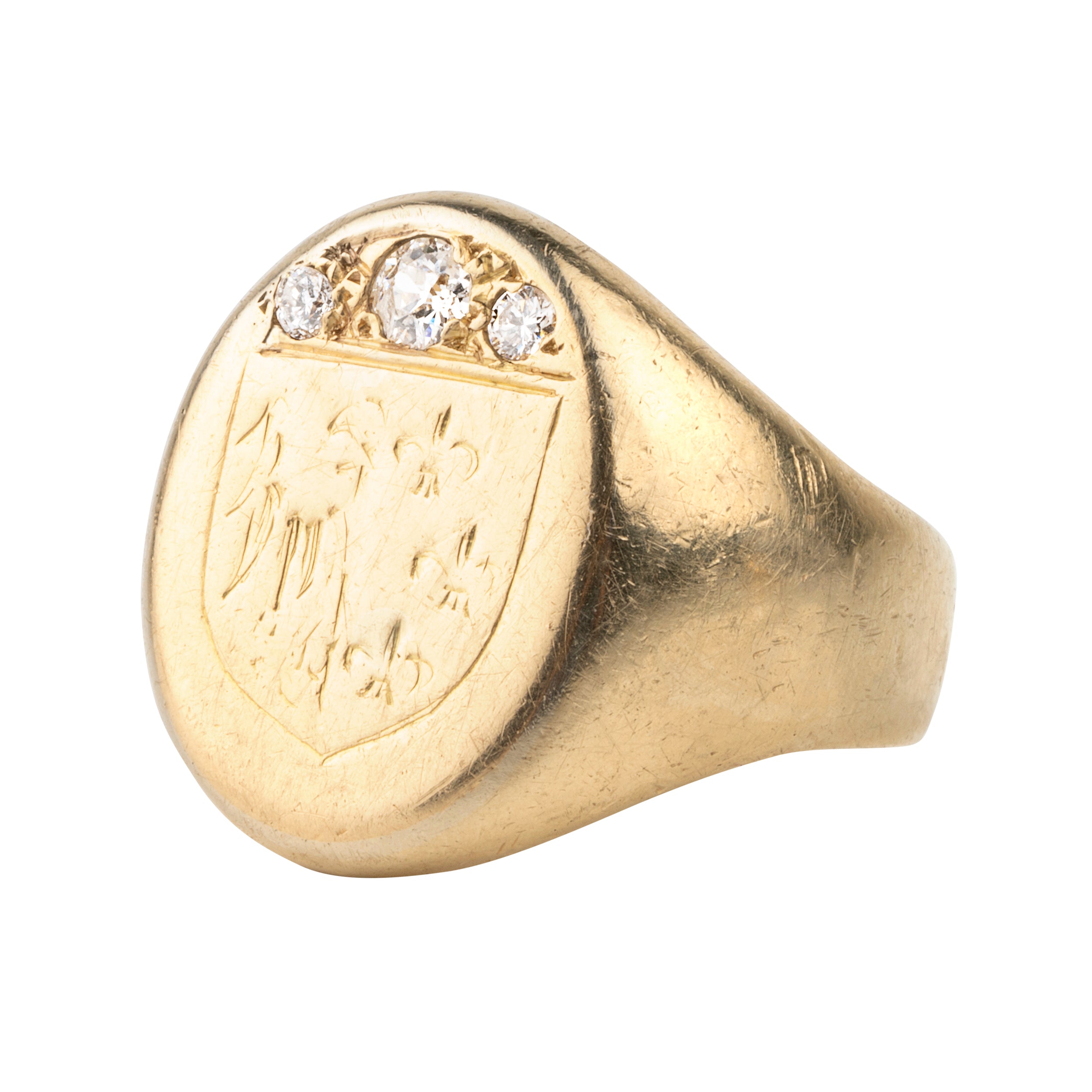 Early 20th-century heavy signet ring featuring three old mine-cut diamonds, set in 15k yellow gold. The engraved Fleur-de-lis details have since worn away with time. England. Circa 1900.