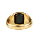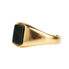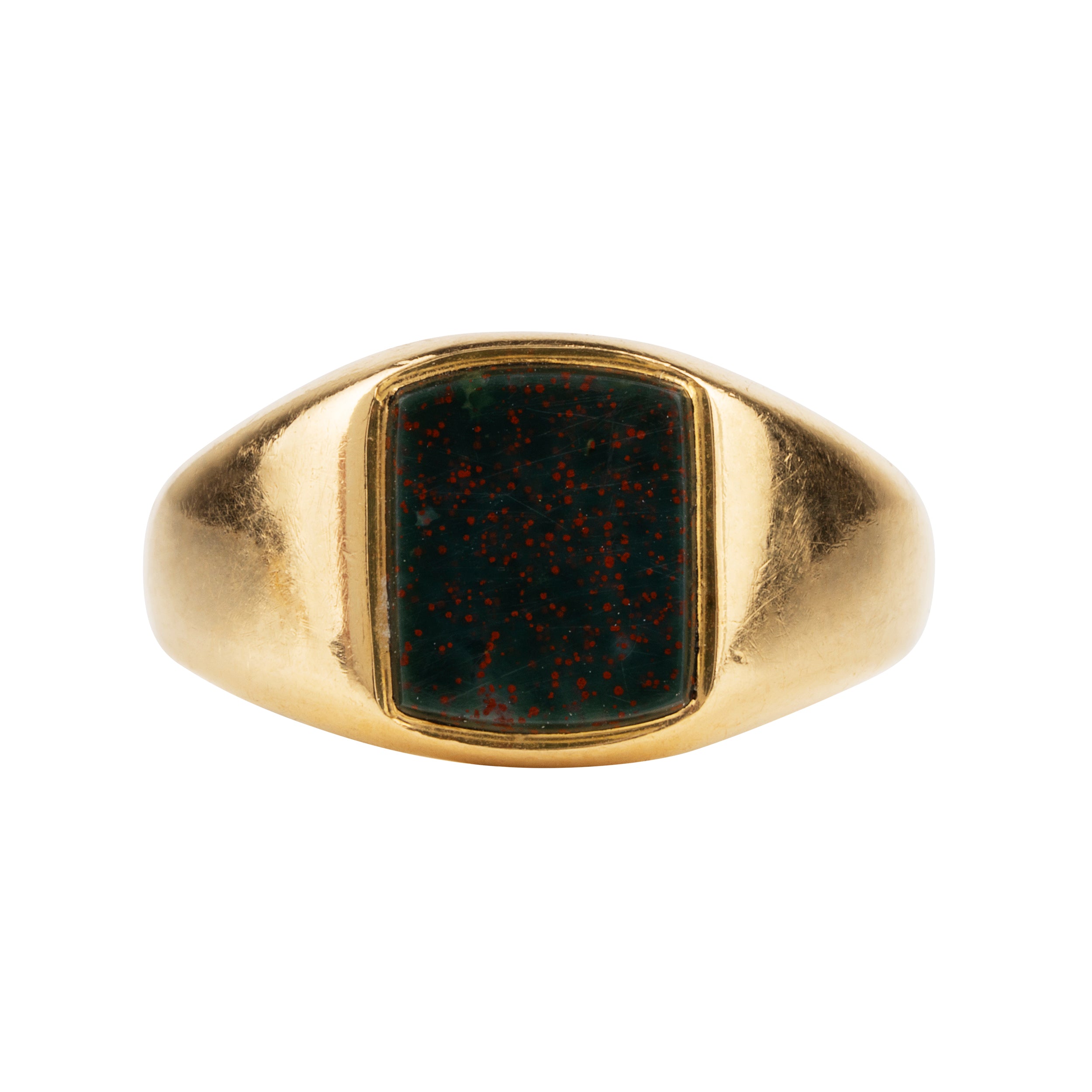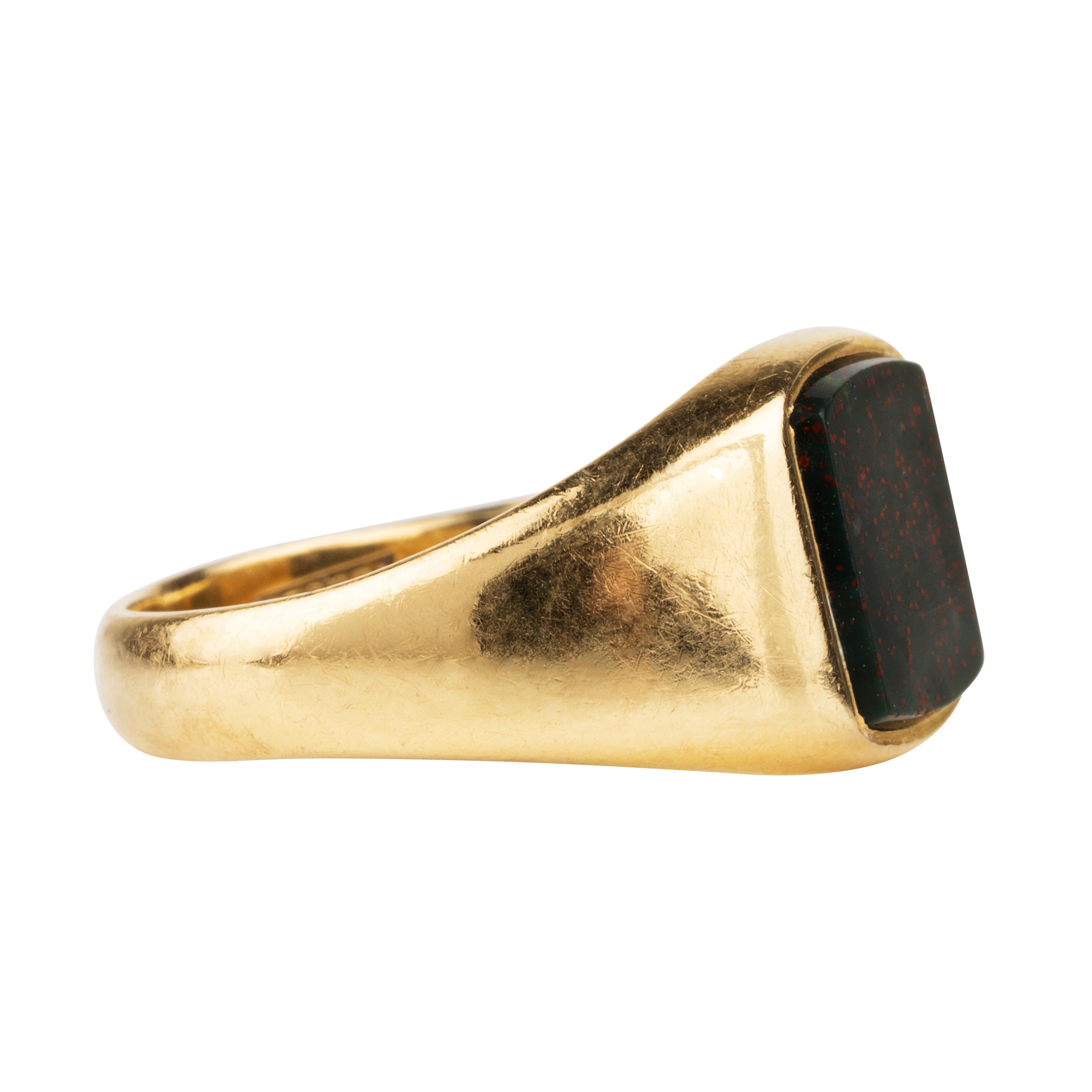 A plain bloodstone is set in 18k gold, its surface uncarved and quietly formal.