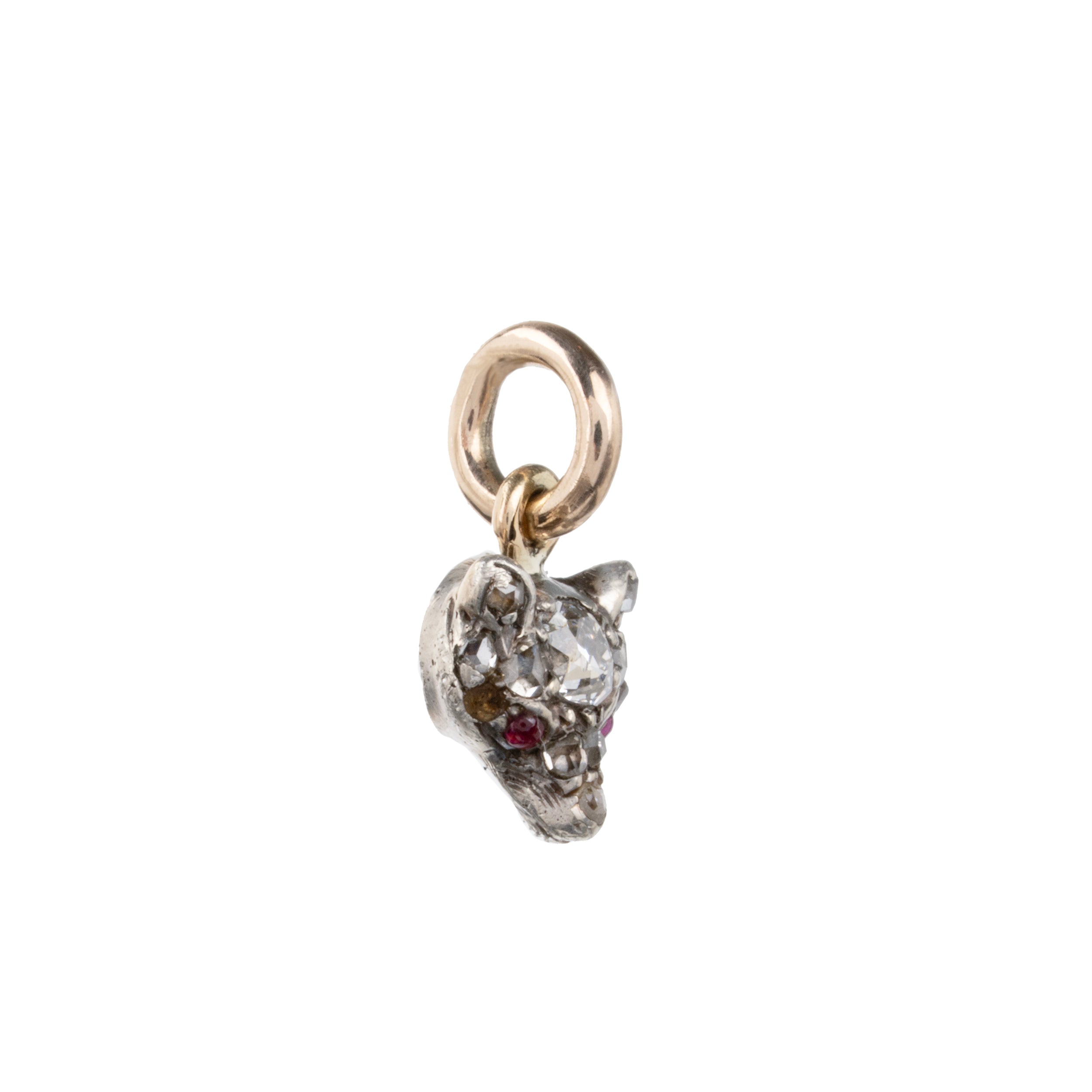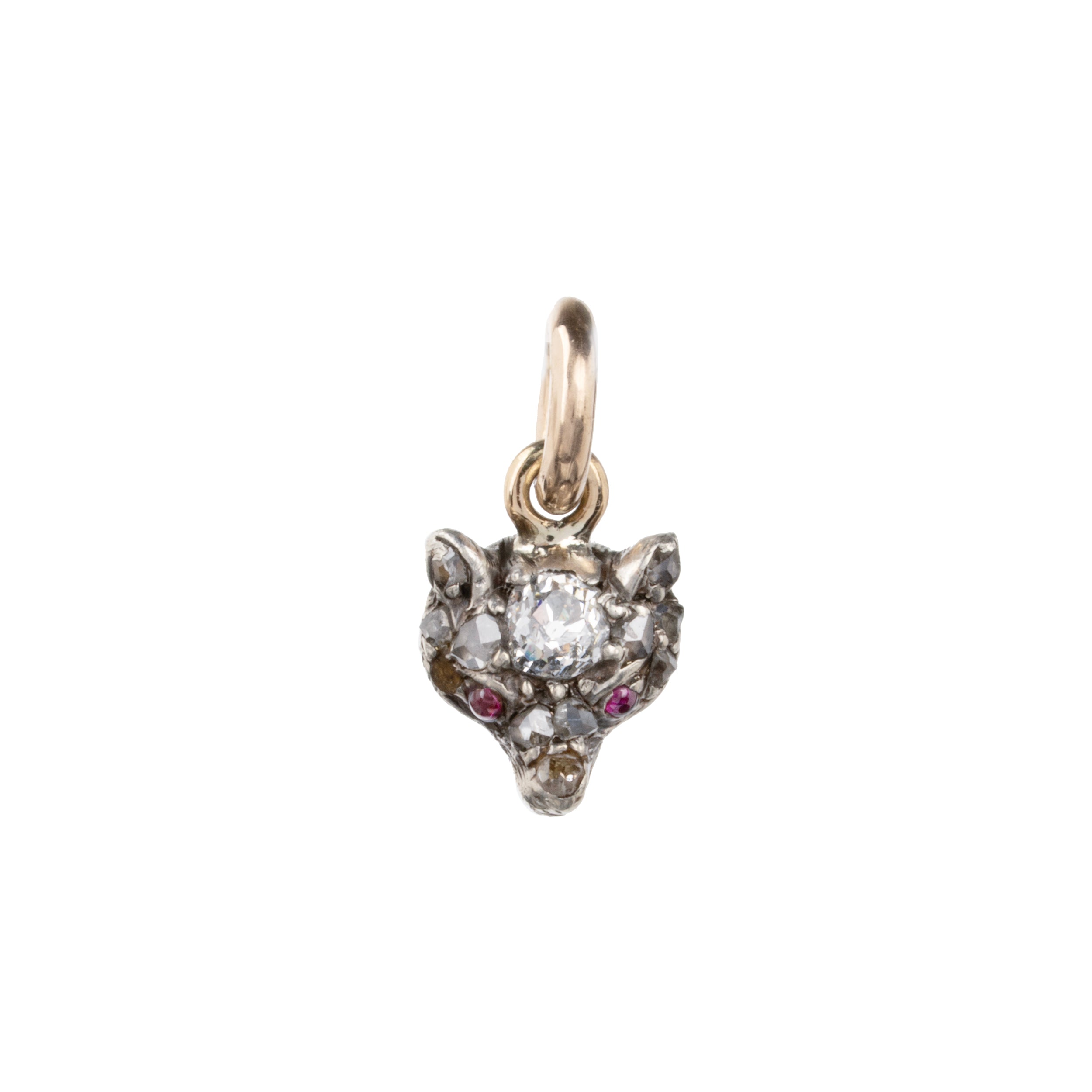 Set with old mine-cut diamonds and ruby eyes, this tiny fox head charm was likely once a top-of-a-stick pin and later converted into a pendant.