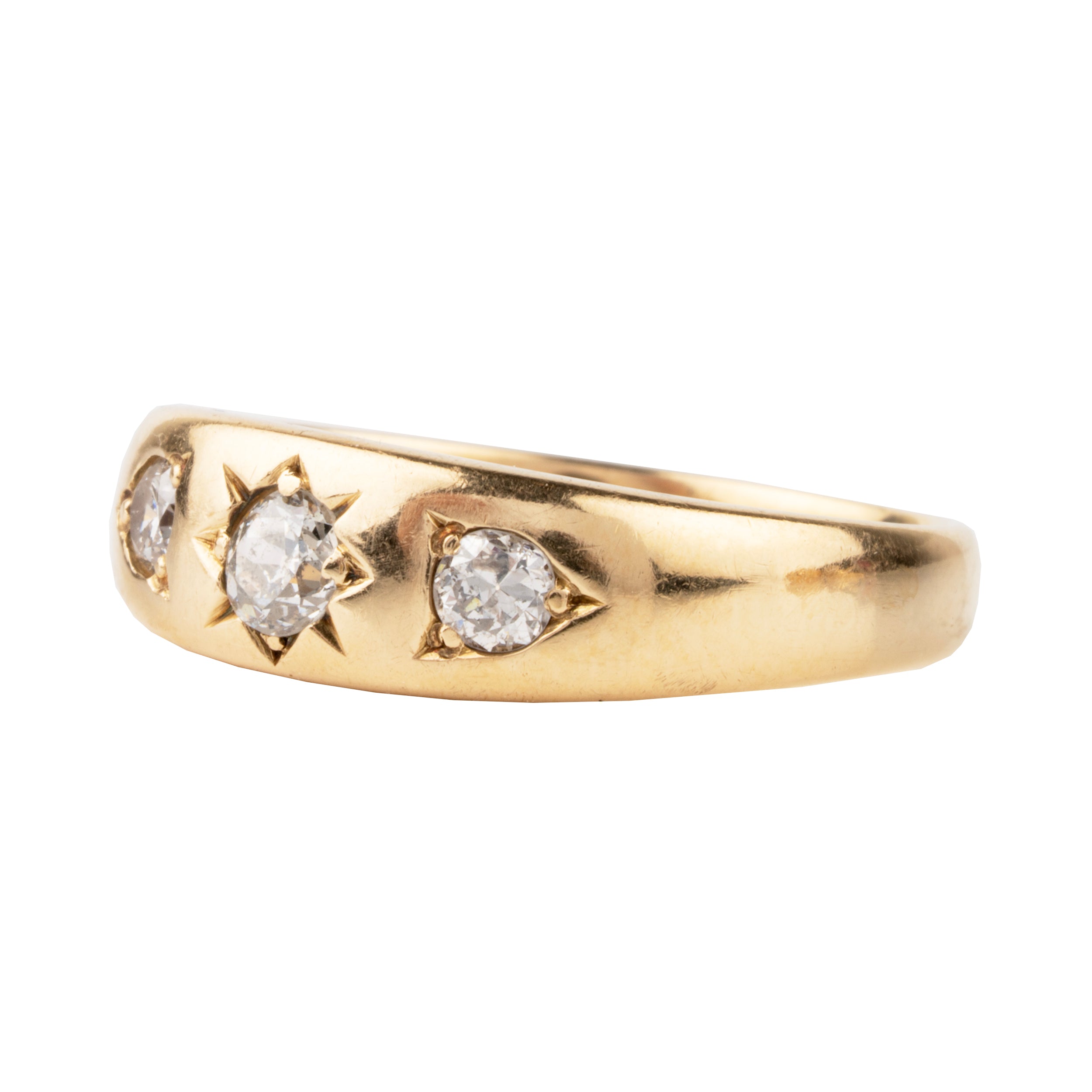 Three old European cut diamonds set in an 18k gold gypsy set ring with starburst details.